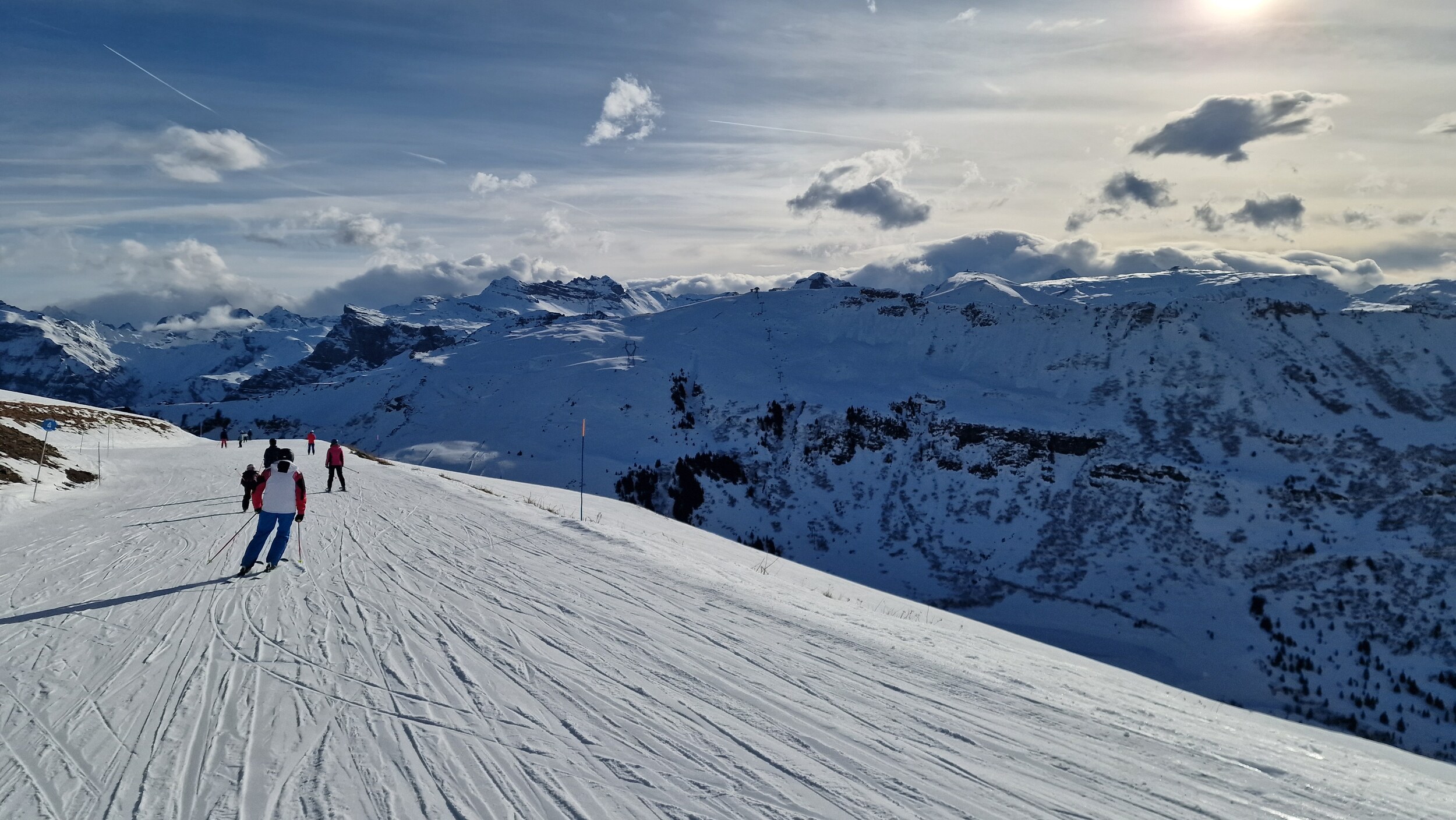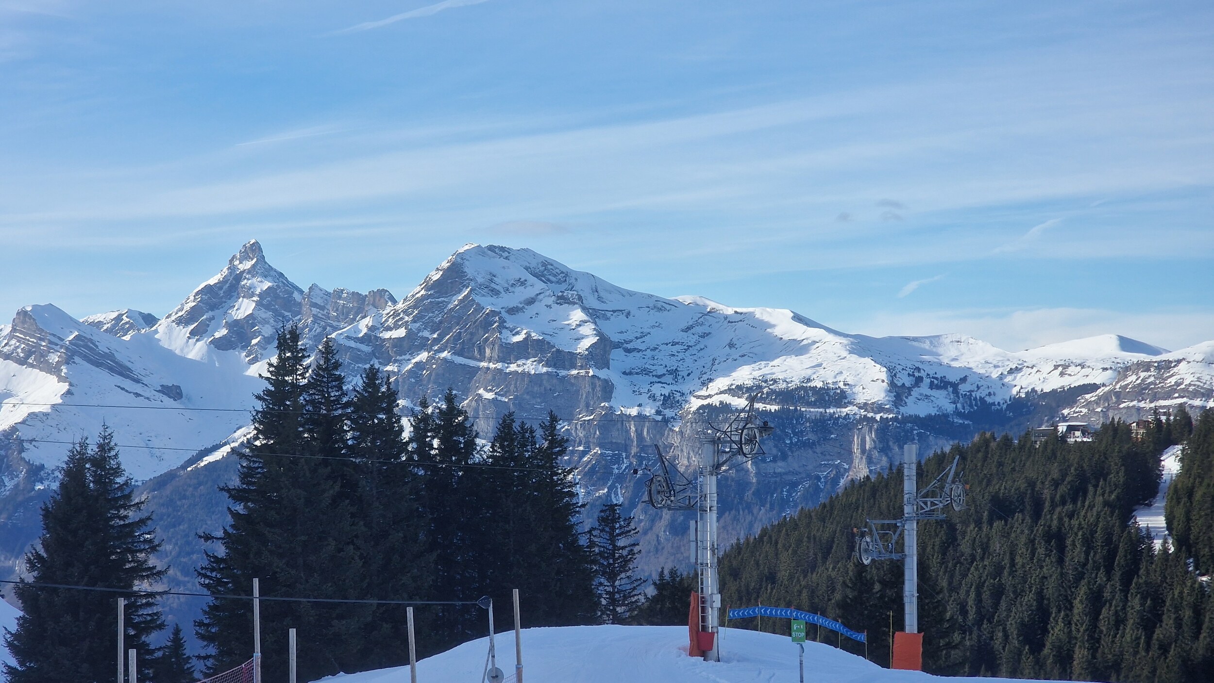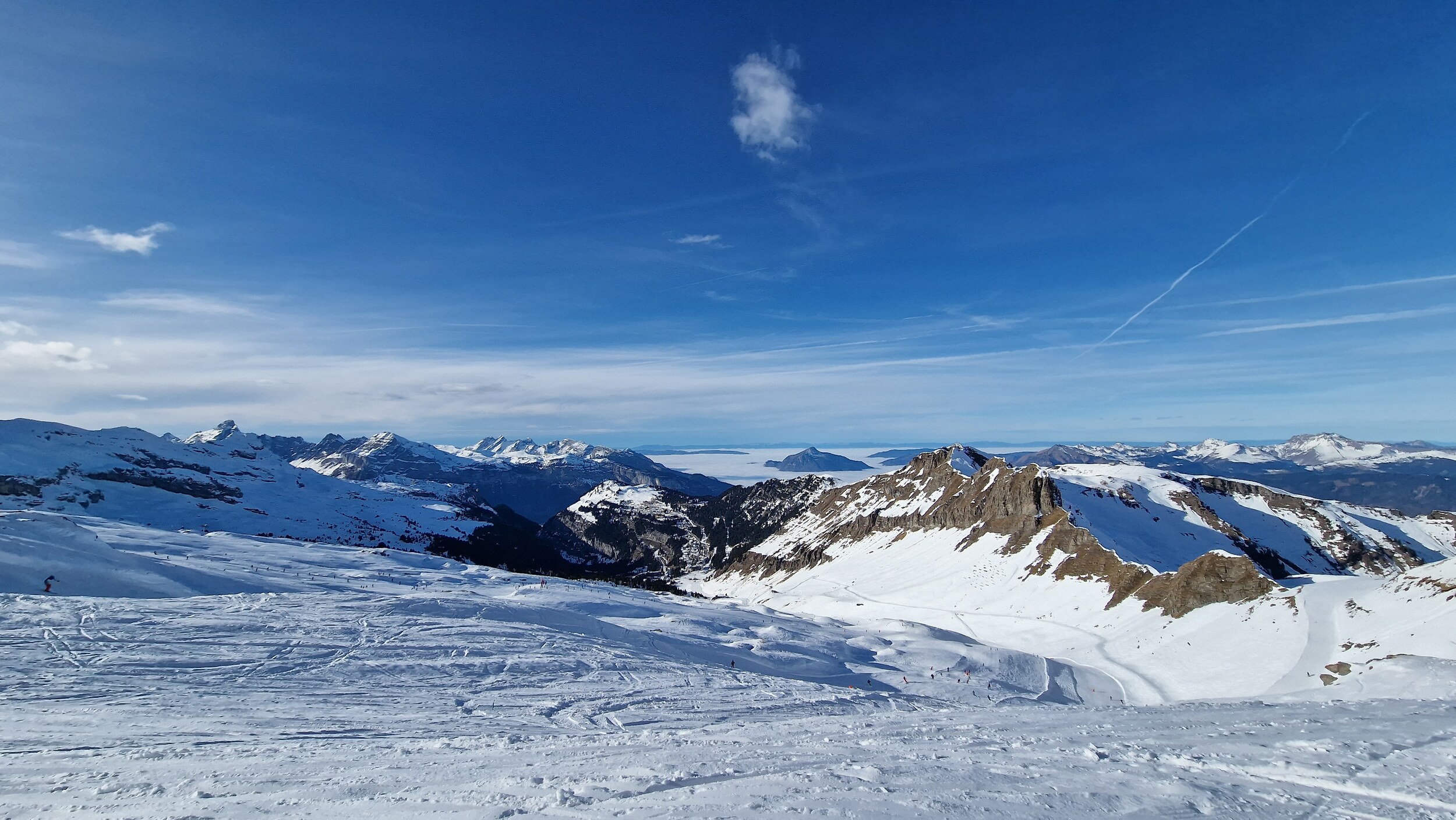 Nun ging es endlich auf die Ski. Der Plan war, zuerst nach Flaine zu gehen, dort die meiste Zeit zu verbringen und am Nachmittag noch so viel wie möglich im Village Teil zu erkunden. Zuerst ging es in Flaine mit der DMC zum höchsten Punkt des Skigebiets. Das Panorama von dort oben ist wirklich gewaltig, auch wenn der Mont Blanc den ganzen Tag in Wolken gehüllt war. Skifahrerisch war der Tag eher mau, da die meisten Pisten relativ schmale und eisige Kunstschneepisten waren. Nur in Flaine lag mehr Naturschnee, als ich erwartet habe. Dafür war den ganzen Tag Staunen über das Panorama angesagt.