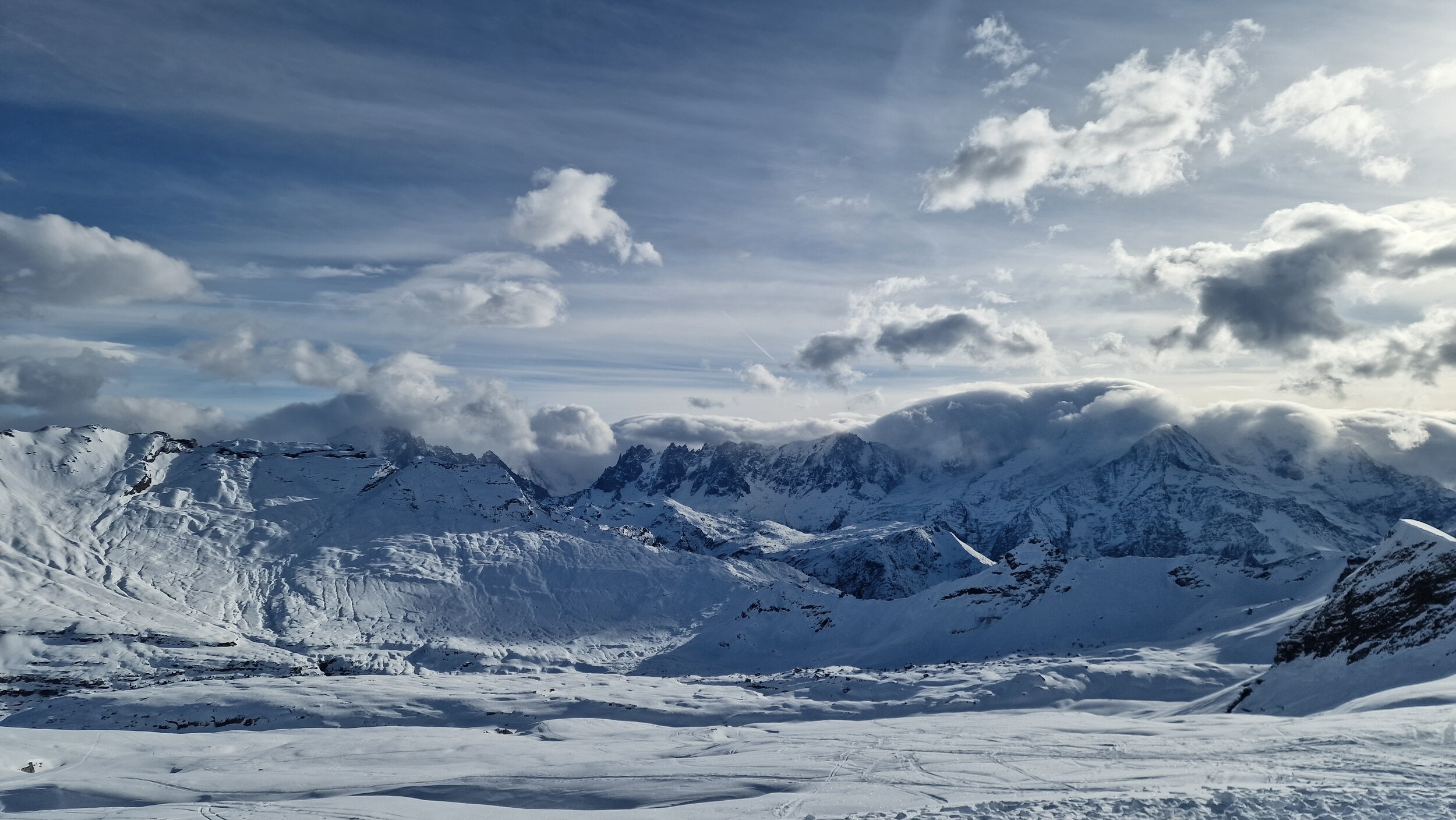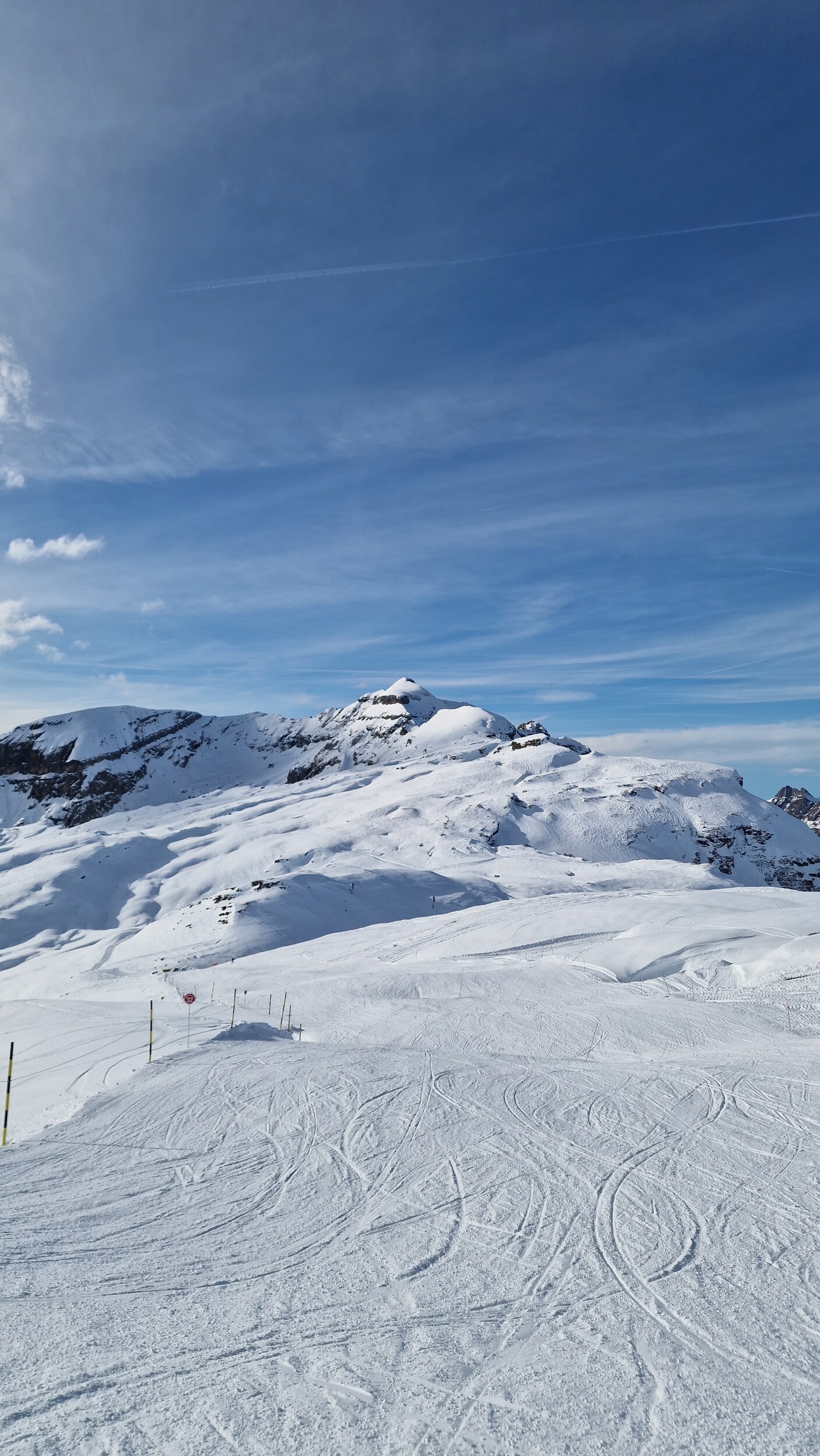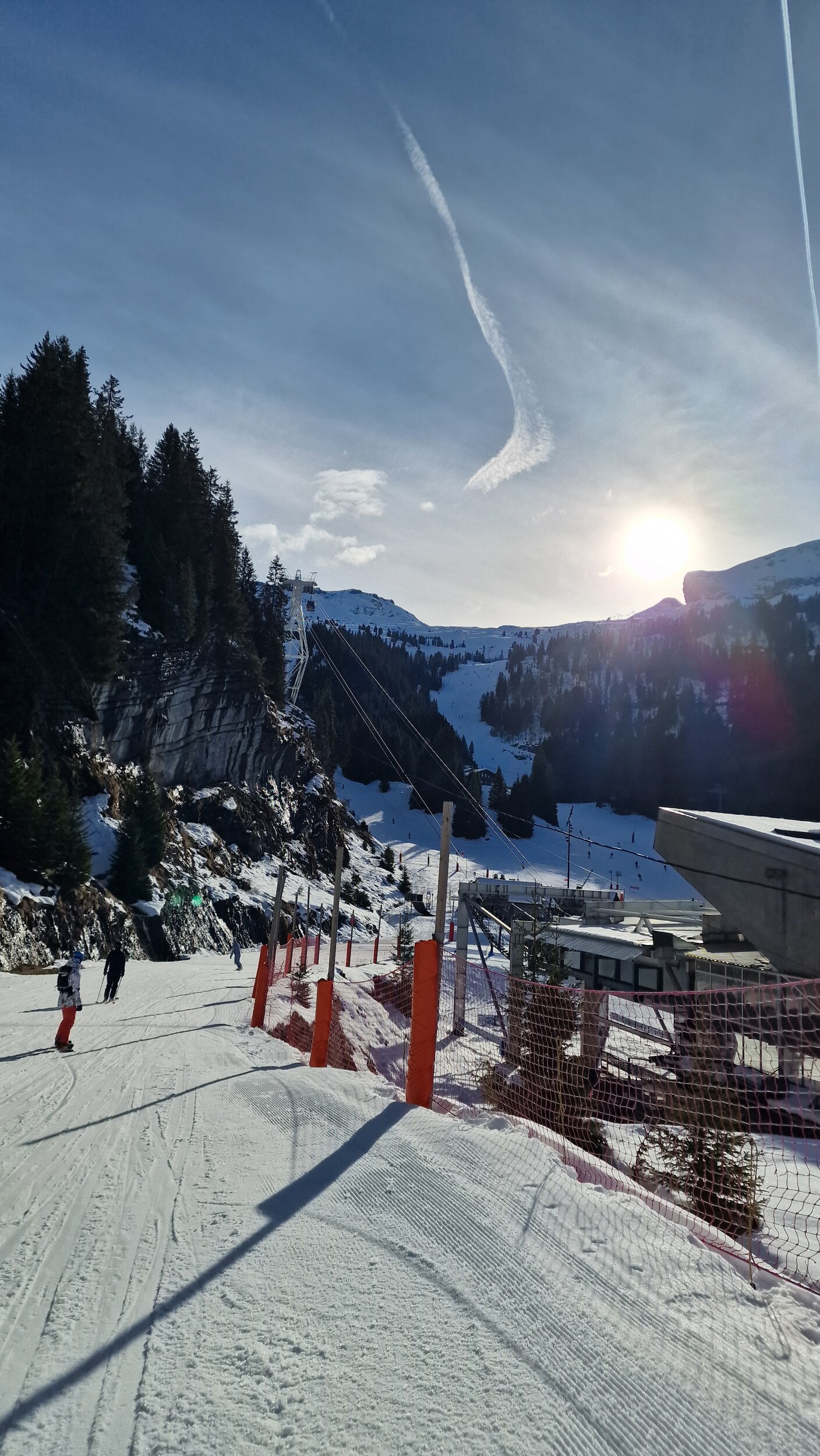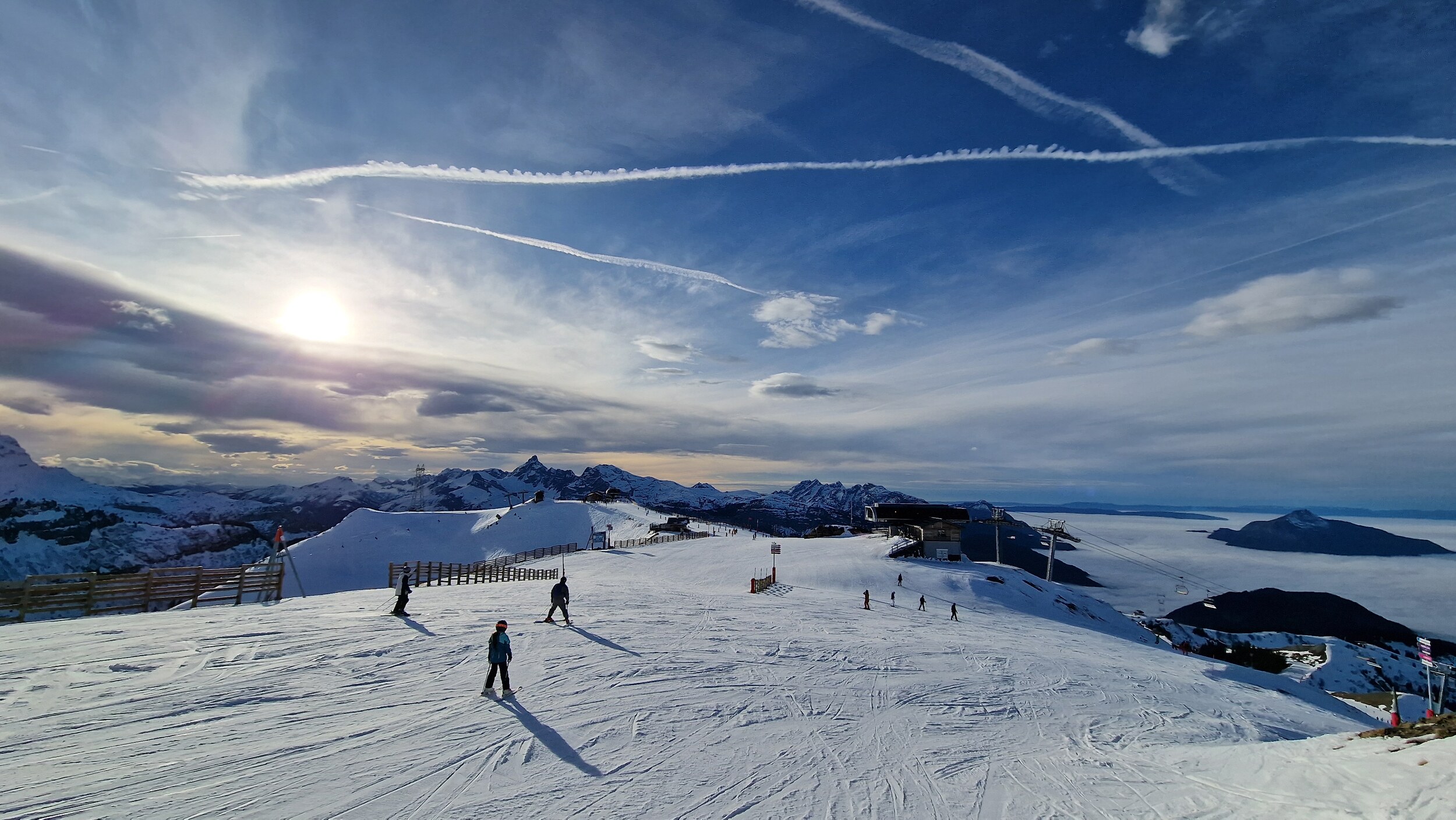 Nun ging es endlich auf die Ski. Der Plan war, zuerst nach Flaine zu gehen, dort die meiste Zeit zu verbringen und am Nachmittag noch so viel wie möglich im Village Teil zu erkunden. Zuerst ging es in Flaine mit der DMC zum höchsten Punkt des Skigebiets. Das Panorama von dort oben ist wirklich gewaltig, auch wenn der Mont Blanc den ganzen Tag in Wolken gehüllt war. Skifahrerisch war der Tag eher mau, da die meisten Pisten relativ schmale und eisige Kunstschneepisten waren. Nur in Flaine lag mehr Naturschnee, als ich erwartet habe. Dafür war den ganzen Tag Staunen über das Panorama angesagt.