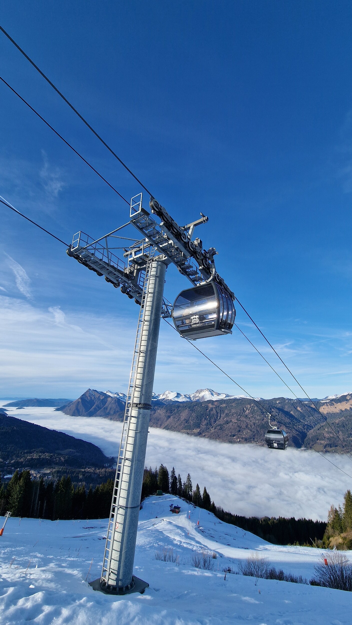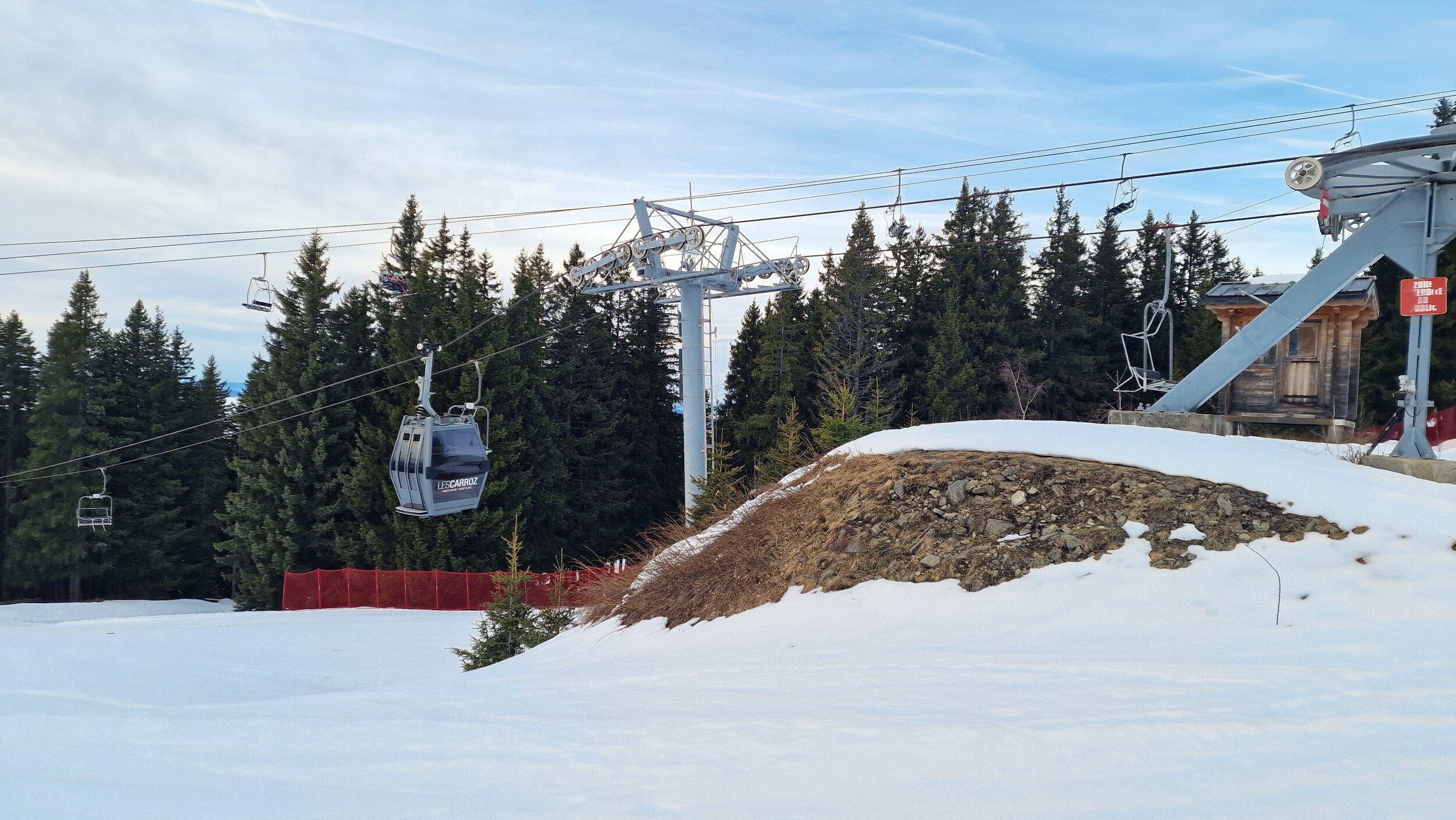 Im Sektor Les Carroz bin ich dann auch einer ganz komischen Konstruktion begegnet: Da hat wohl jemand eine Gondel der Télécabine Kédeuze an einen fix geklemmten 2er-Sessellift gehängt.