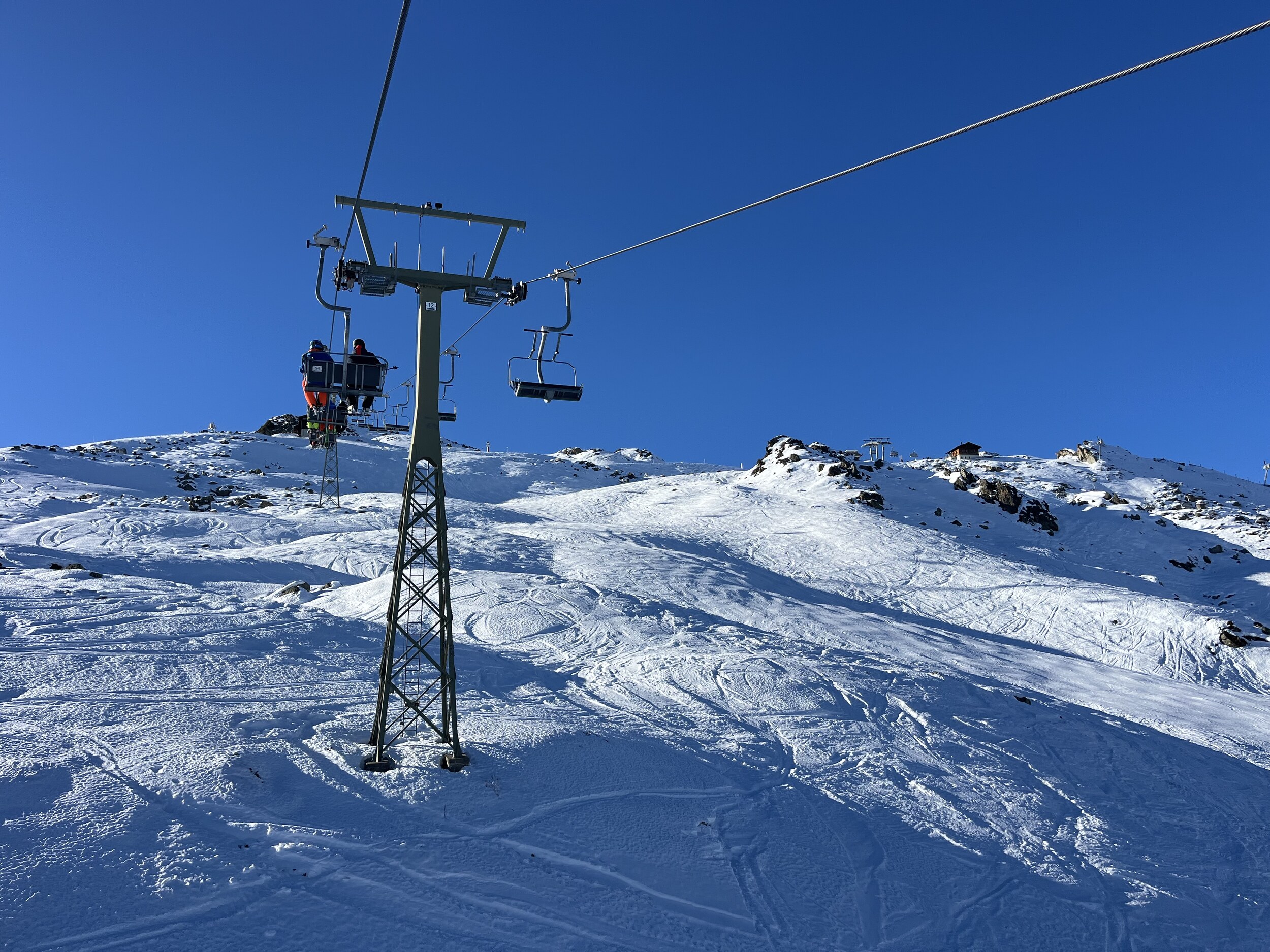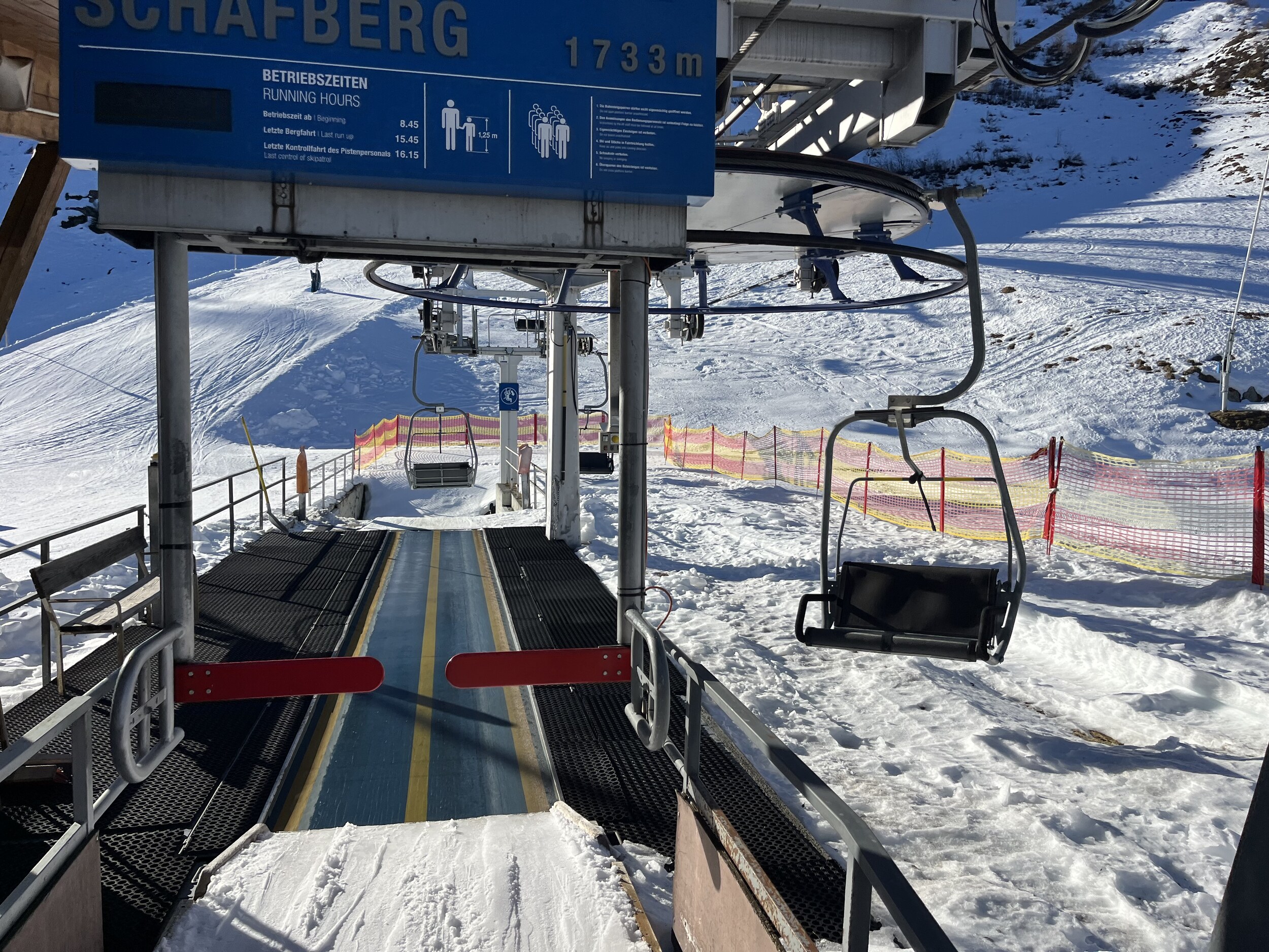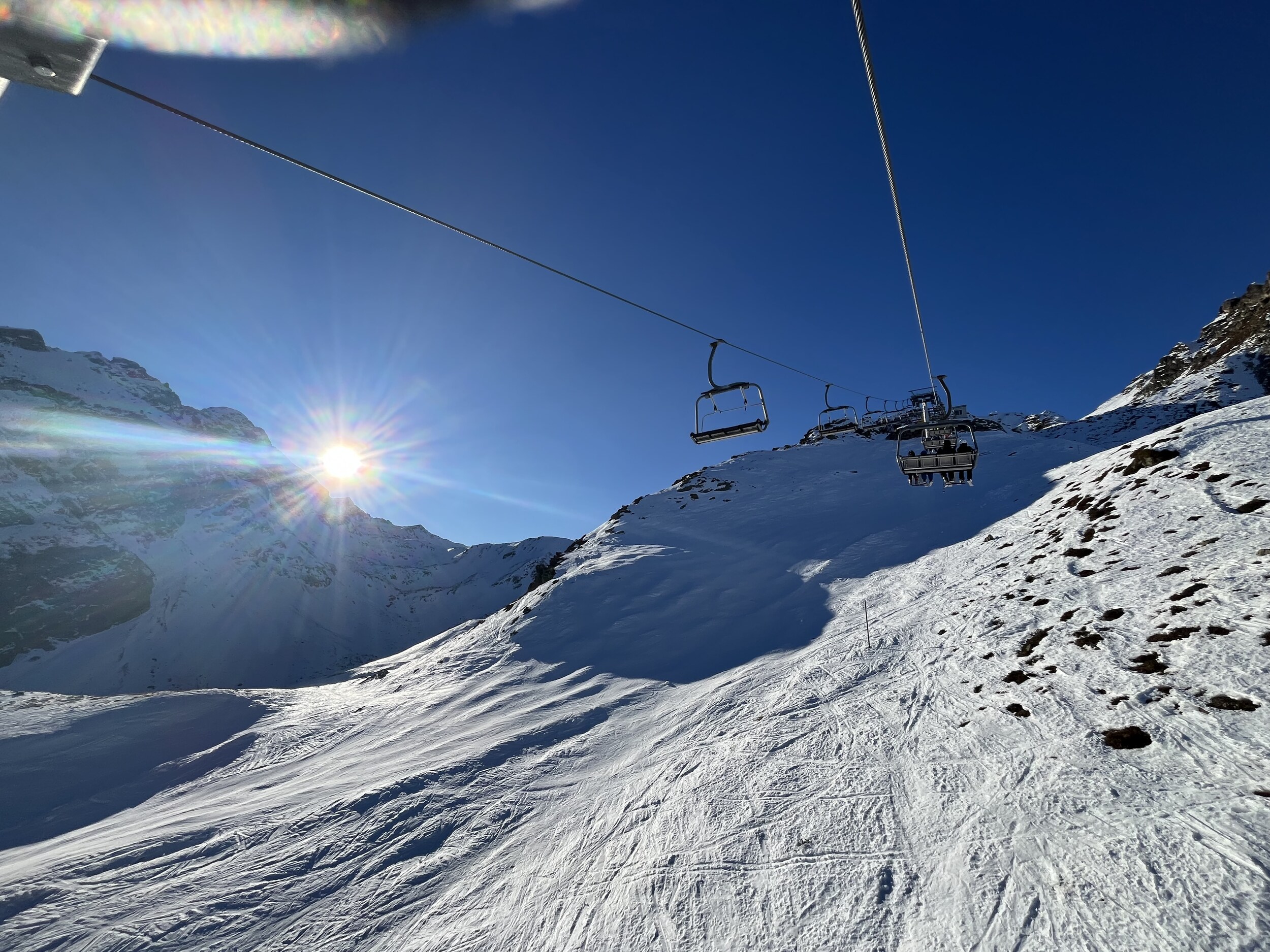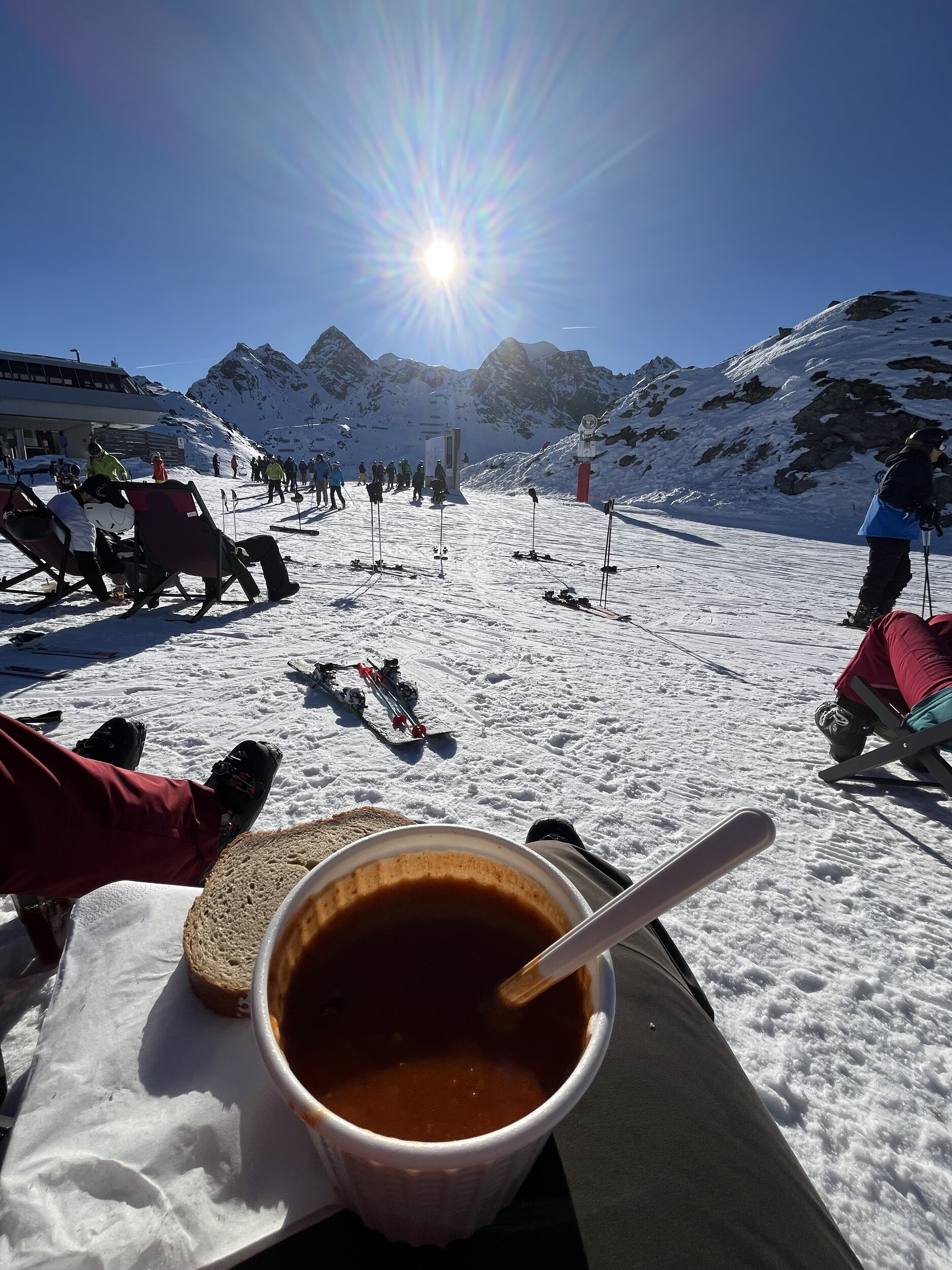 Die schwarze an der Nova ist noch knackig. Dieser Liegestuhl lädt uns spontan zu einer Pause ein: Die Gulaschsuppe ist würzig! Noch eine Wiederholungsfahrt auf einer ungewohnt leeren Piste, bevor wir wieder ans Hochjoch wechseln. Edit 16 Uhr: