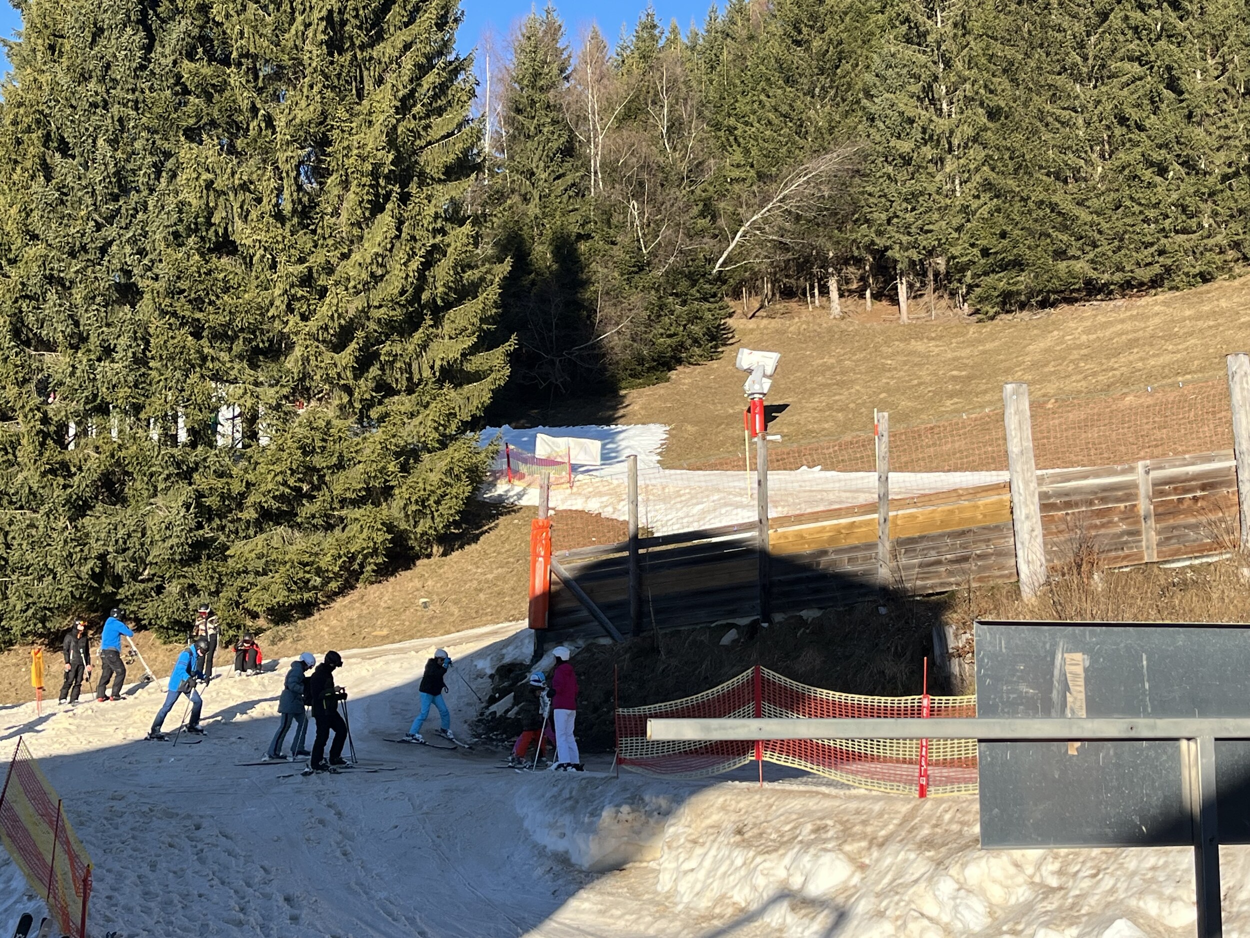 Wer auf diese dumme Idee gekommen ist? ski-andy wird es fast übel, er schliesst da lieber die Augen: Das Niveau der Skifahrer ist unglaublich tief. Darum sind schwarze Pisten leer. Der Steilhang kurz nach diesem Bild ist aber auch sehr eisig. Alles komplett zerstört: Und beim Kropfen braun und voller Steine. Dass morgen die Talabfahrt aufgehen soll, kann ich nicht glauben. Schon kurios, diese Bahn: Wir müssen zum Glück nur eine Gondel warten. So sind wir 15min zu früh für unseren bestellten Hotelbus um 15.30 Uhr unten. Komisch, dass das kaum einer vom Hotel nutzt. Heute früh waren wir zu dritt, jetzt zu zweit. Fazit: