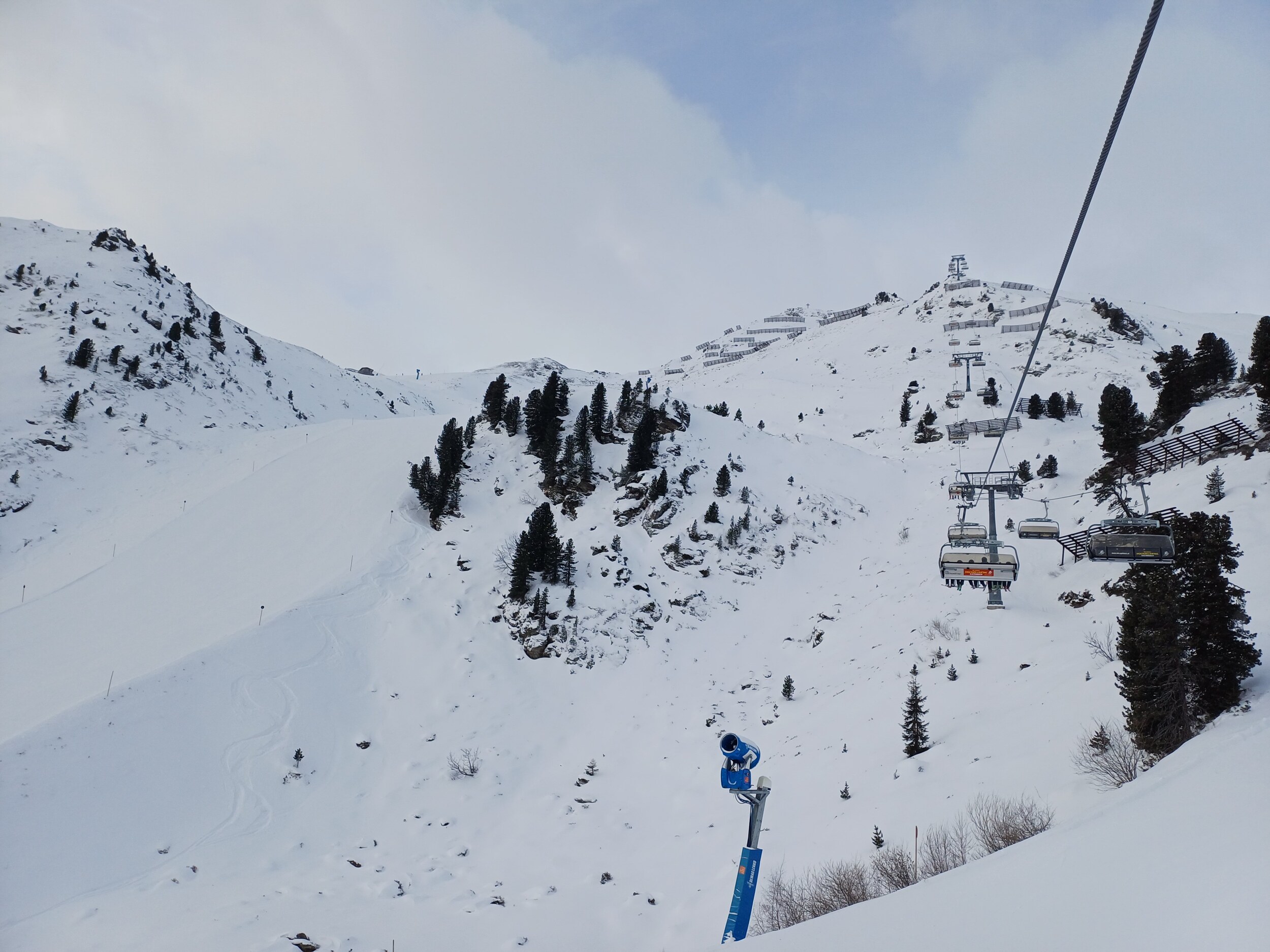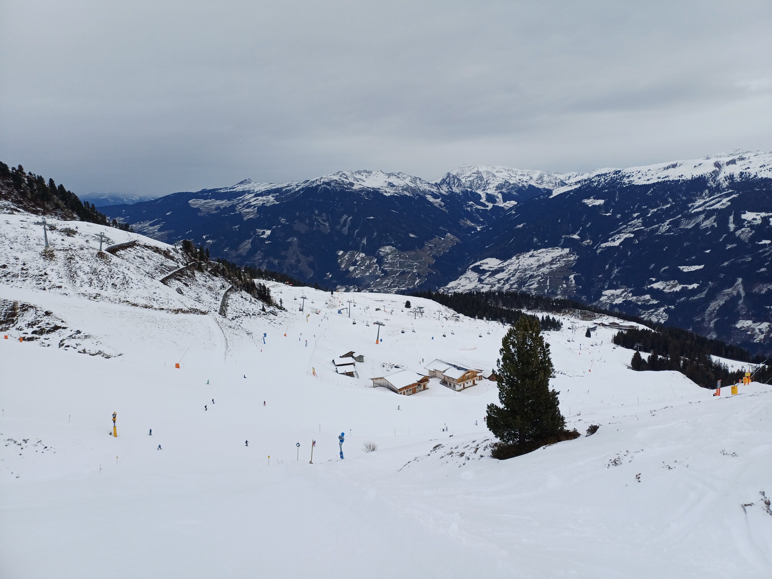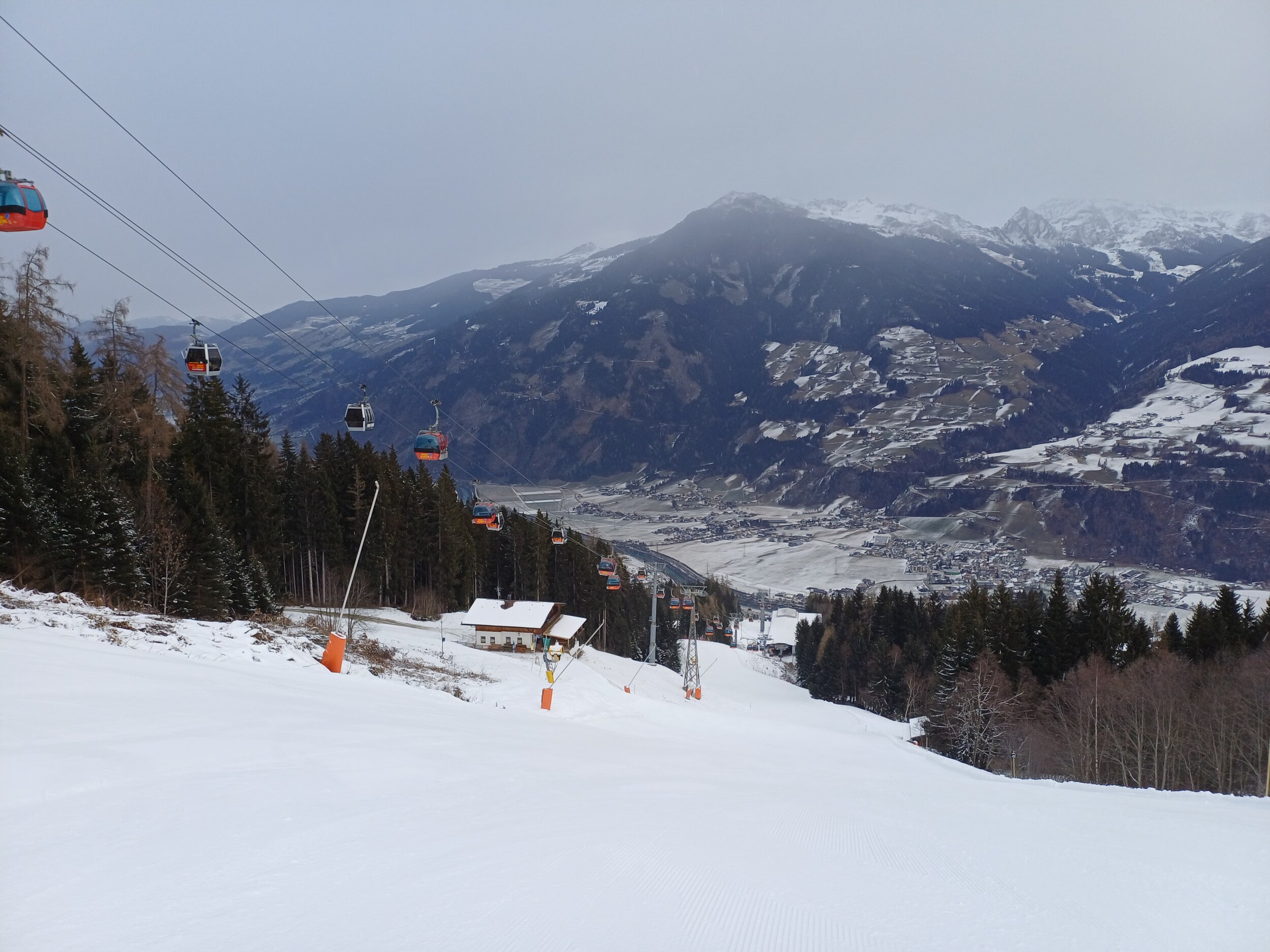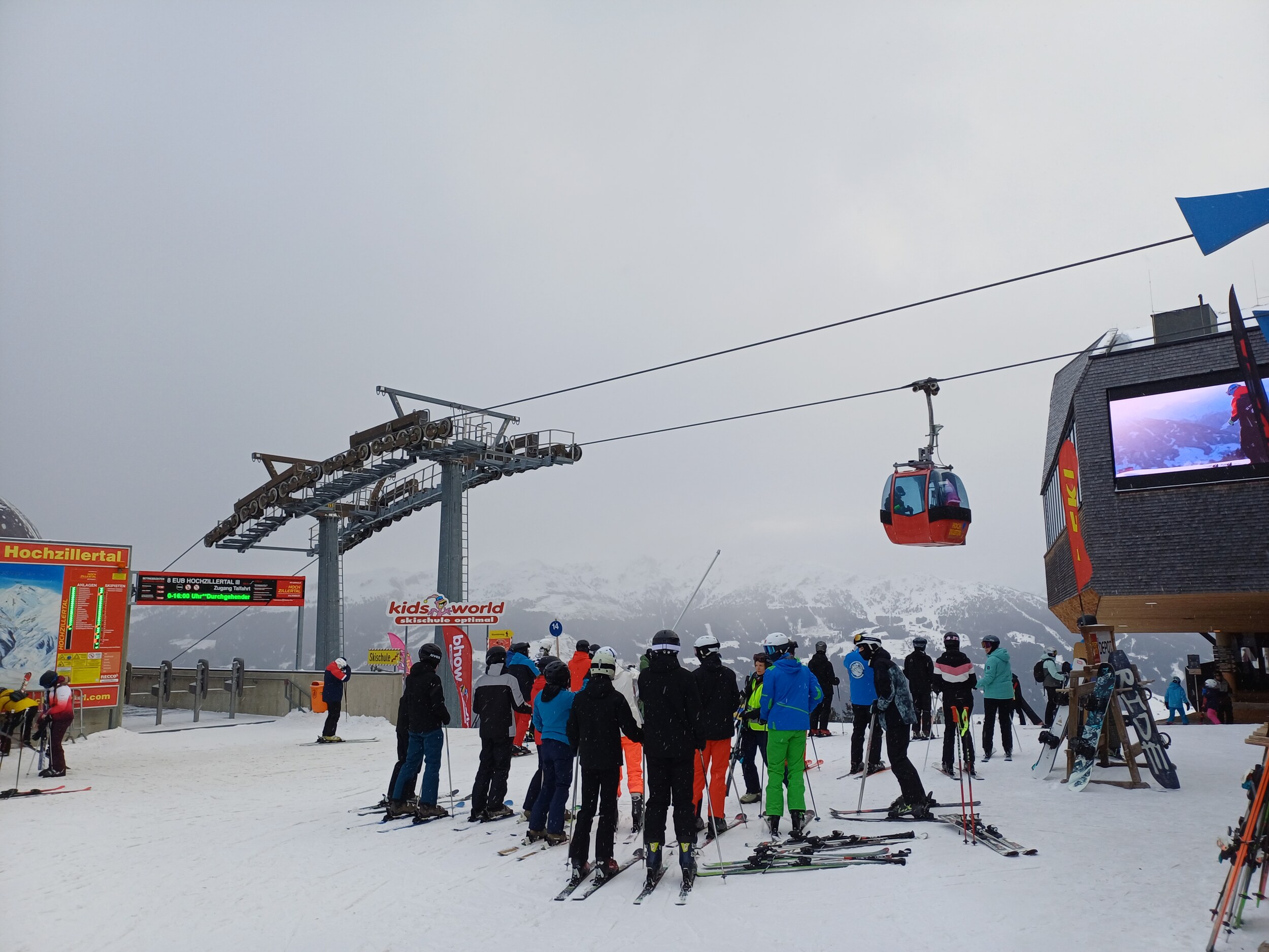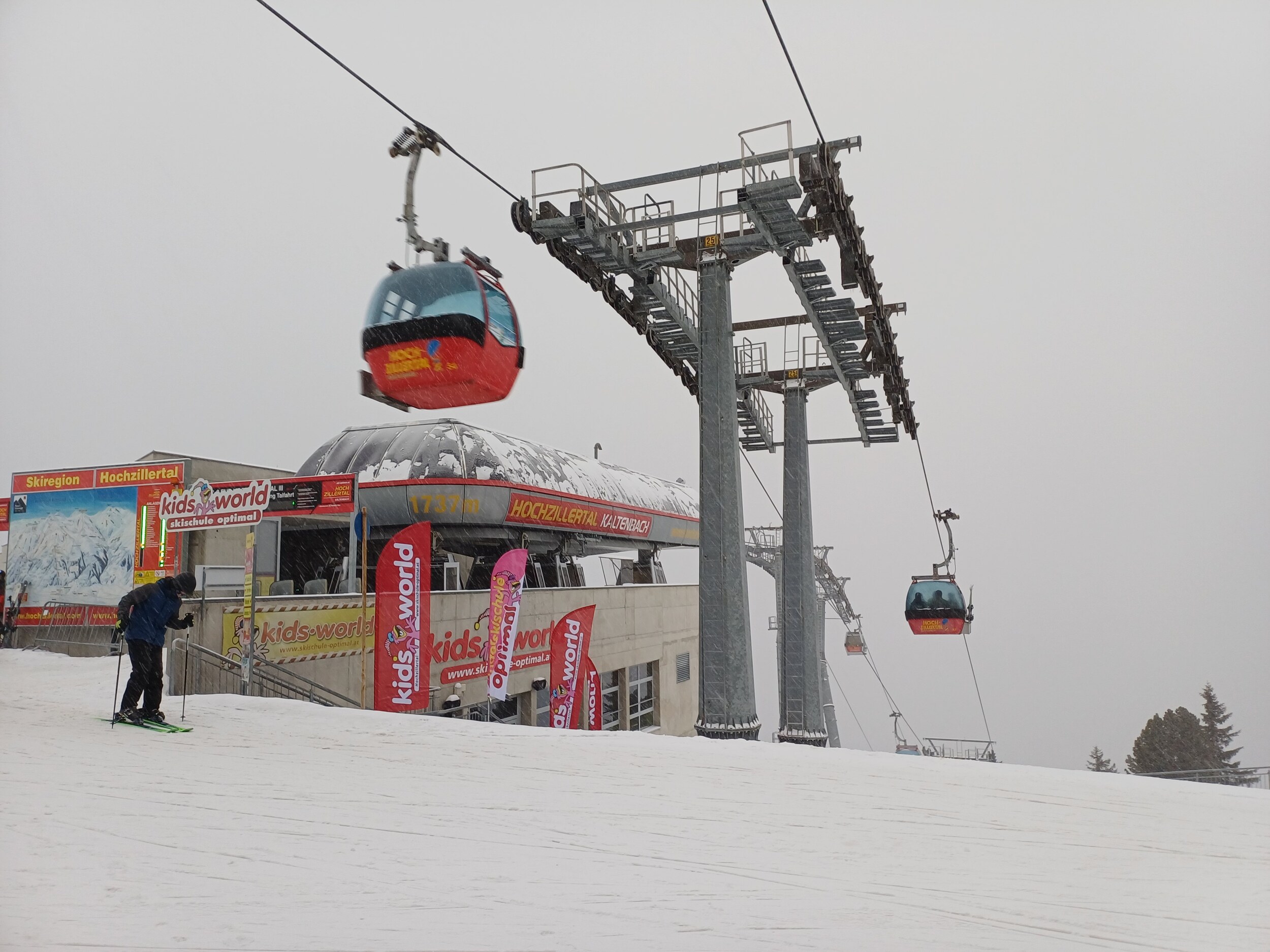 Heute nochmal Kaltenbach. Das Wetter ist bei weitem nicht so schlecht wie vorhergesagt. Von relevantem Schneefall bisher keine Spur. Etwas mehr los am industriellen Parkplatz. Wahrscheinlich mehr Tagesgäste, dafür weniger Urlauber. Kein Andrang an der Gondel.