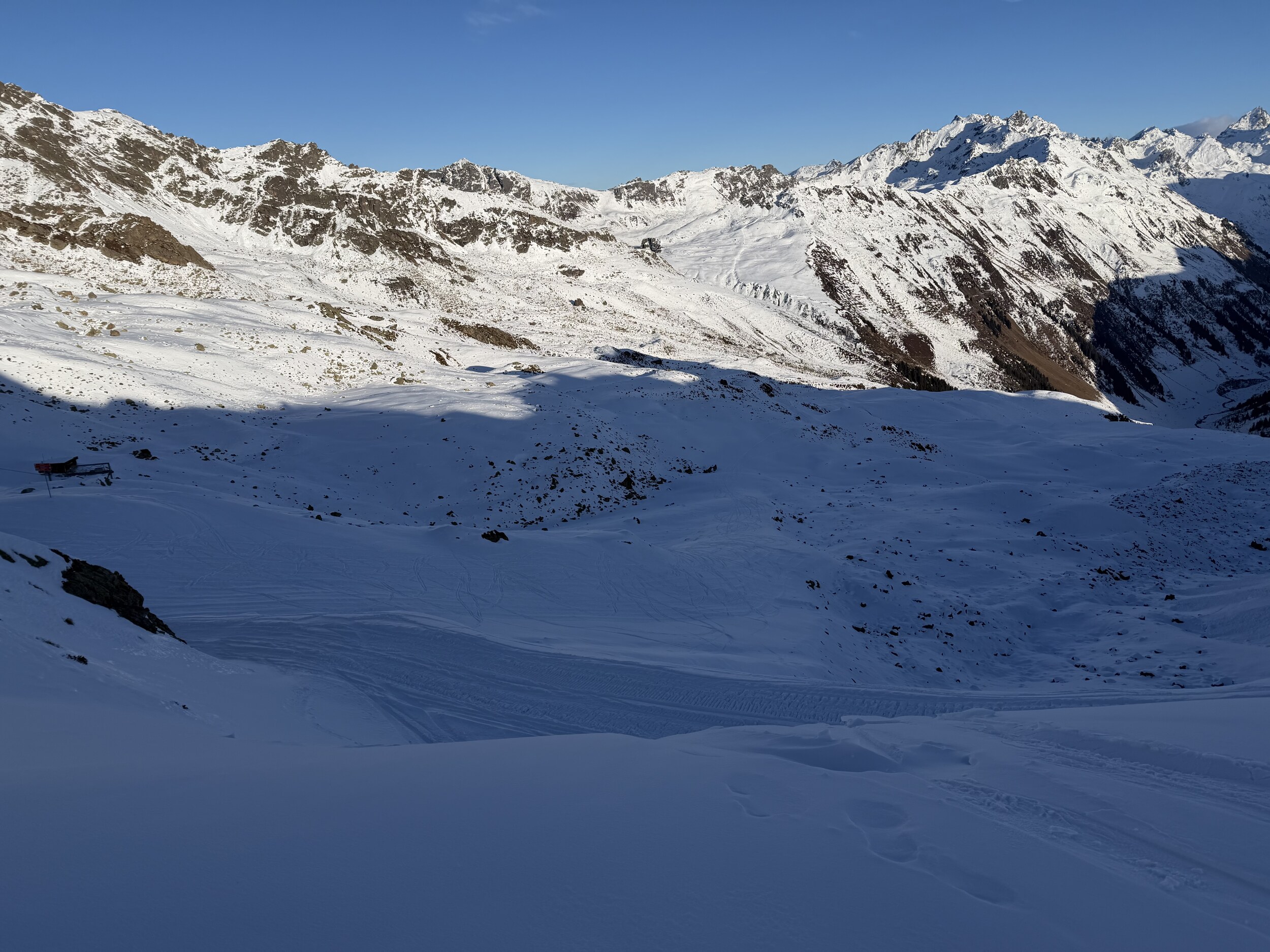 Die Pisten sind gut, hart und griffig. Nur eine kleine Eisfläche bei der Vertical. Bisher noch kein grosser Andrang.
