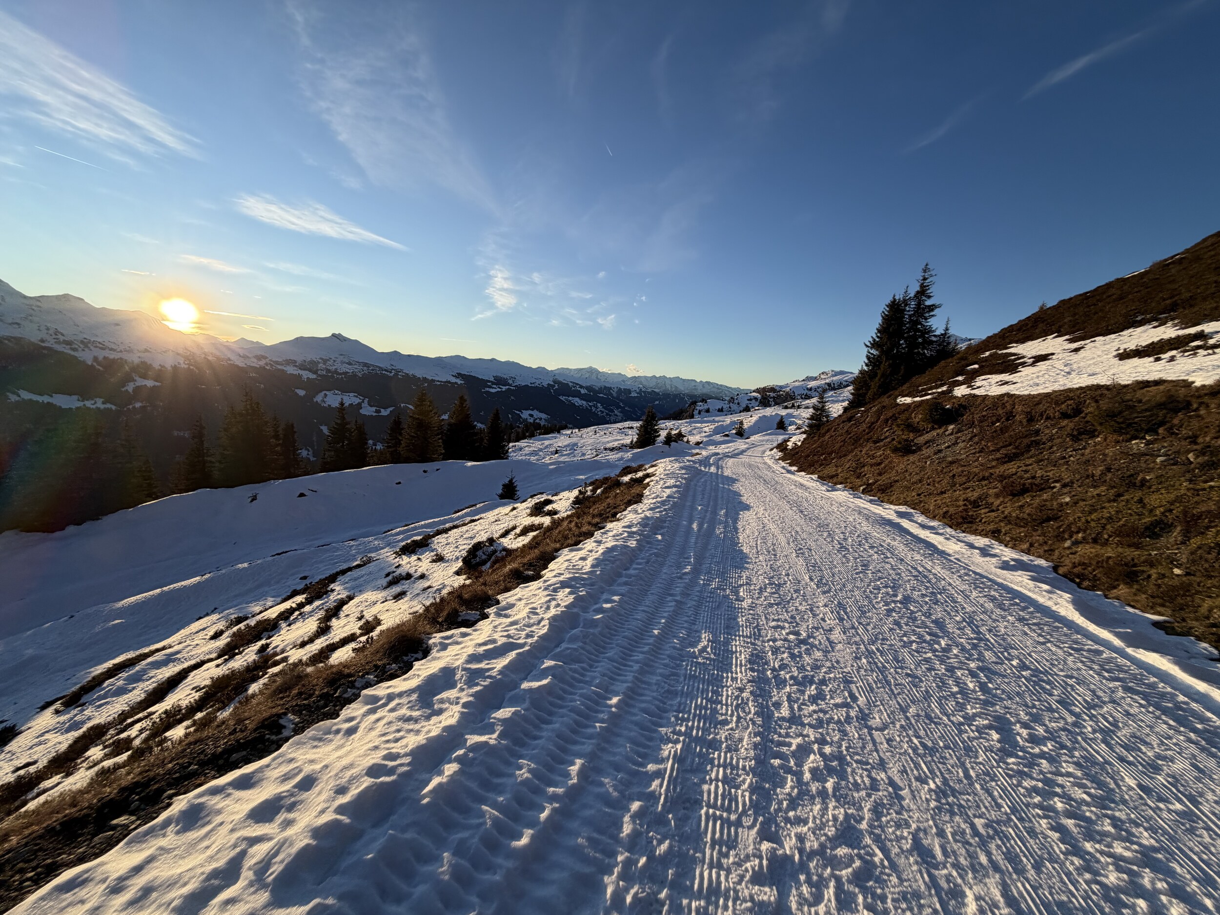 Da es den ganzen Tag wenig Leute hatte, ist die Piste in einem sehr guten Zustand ohne Buckel. Leider mit einigen eisigen Stellen, wo ich mit meinen alten Ski ohne Kanten null Grip habe.