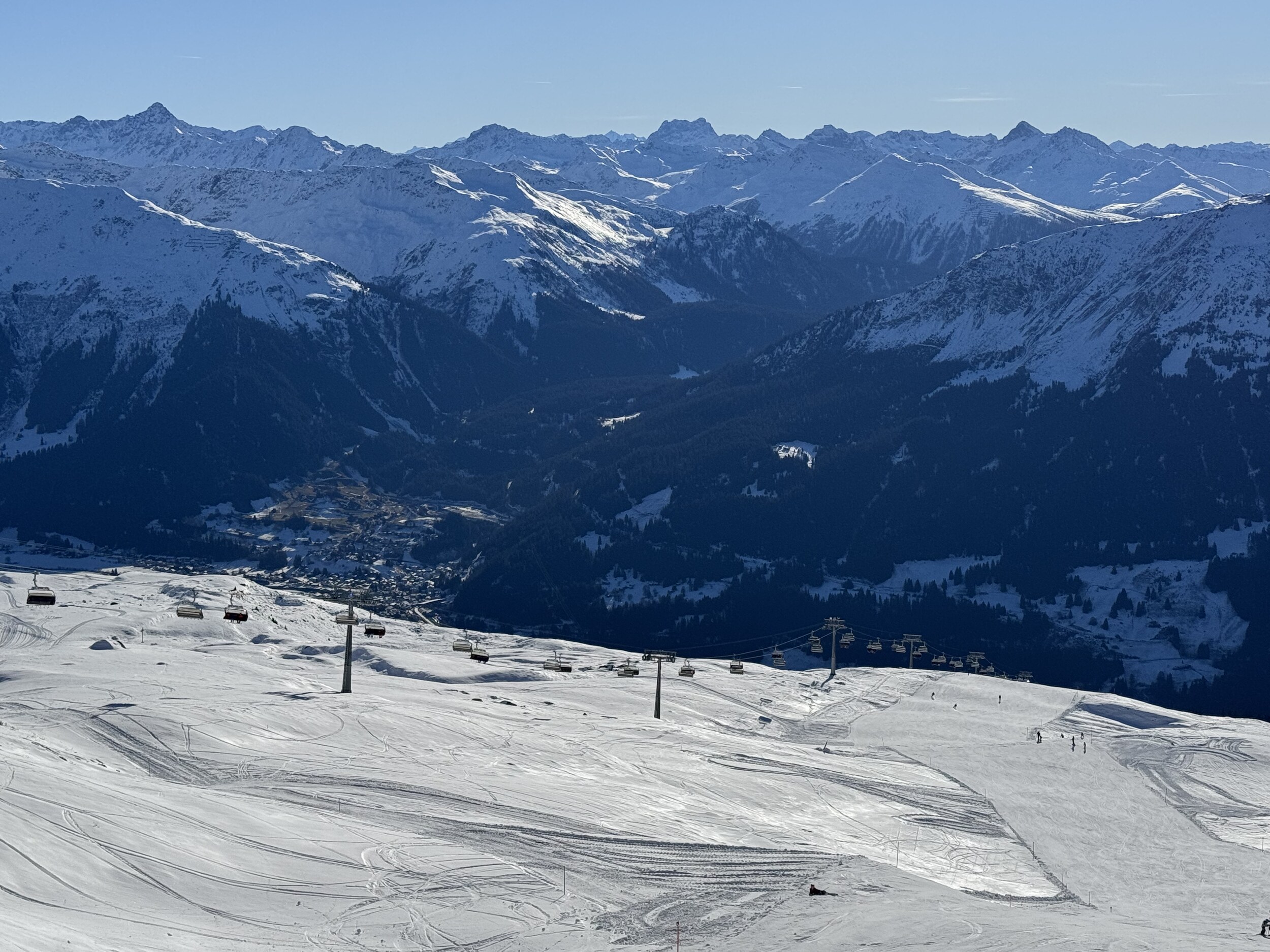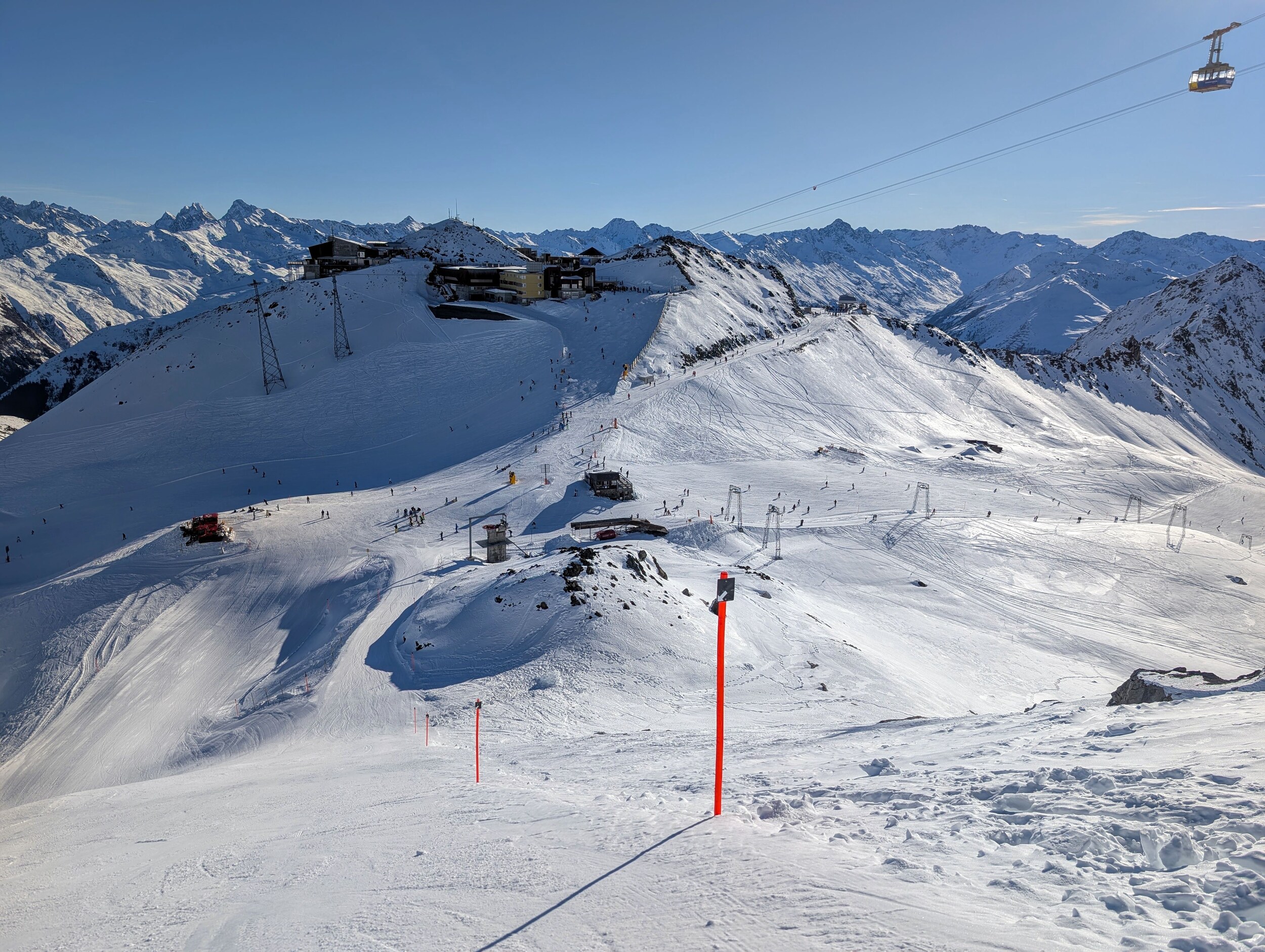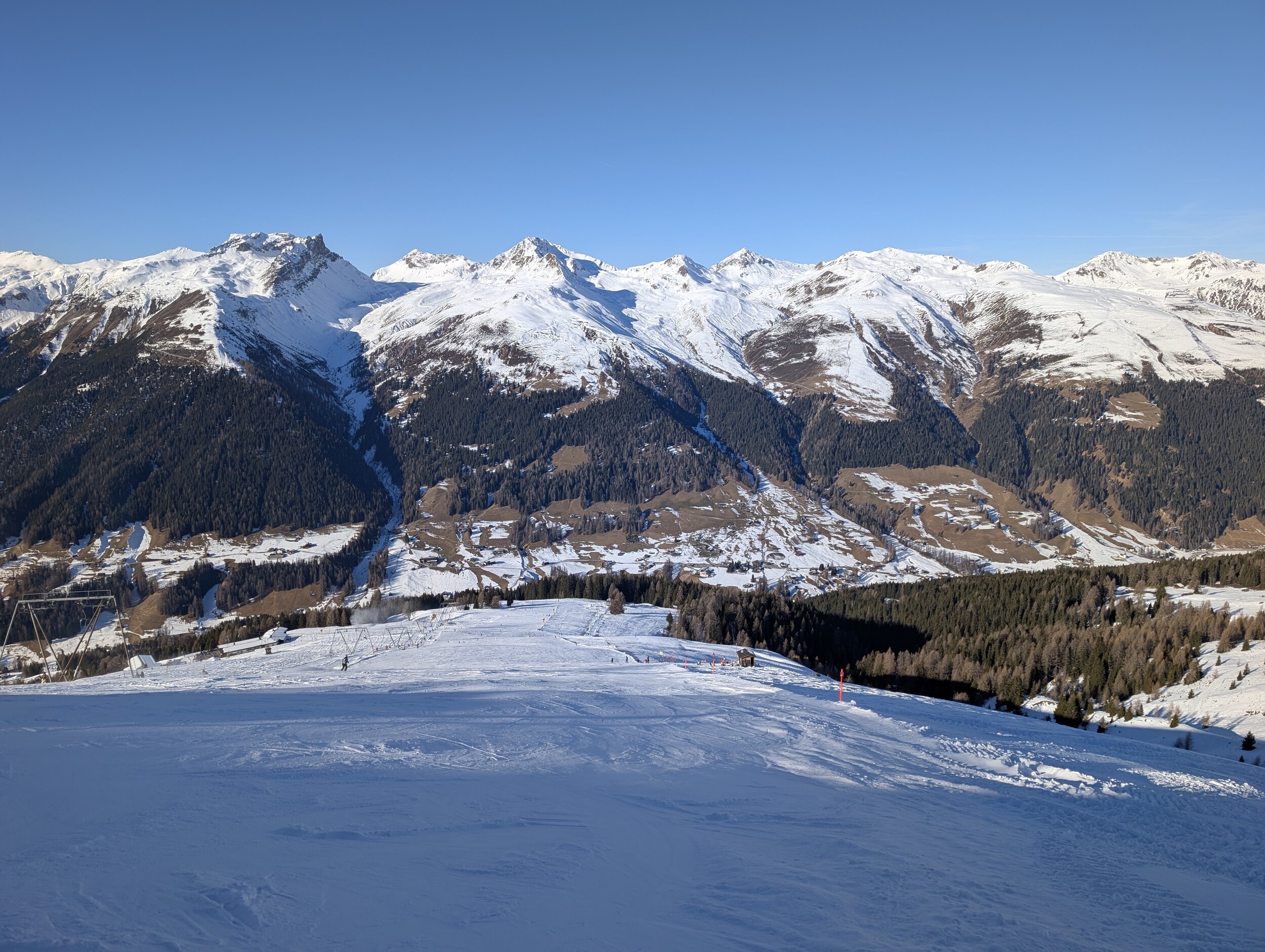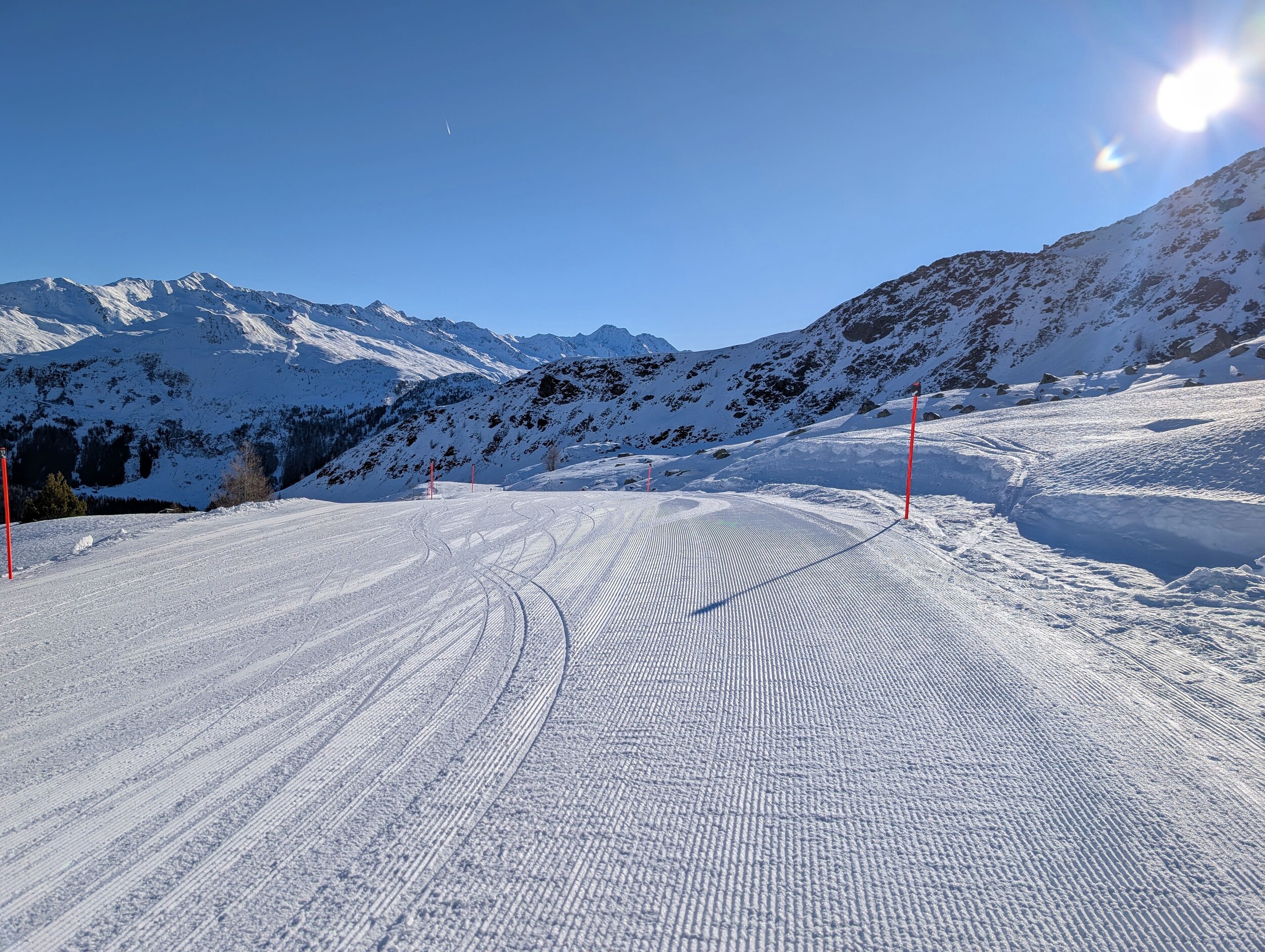 Heute zum Einfahren mit Kids auf Madrisa gegangen, im Wissen dass nur etwa 1/4 der Pisten geöffnet sind, also im Prinzip nur eine rote mit kleinen Varianten.