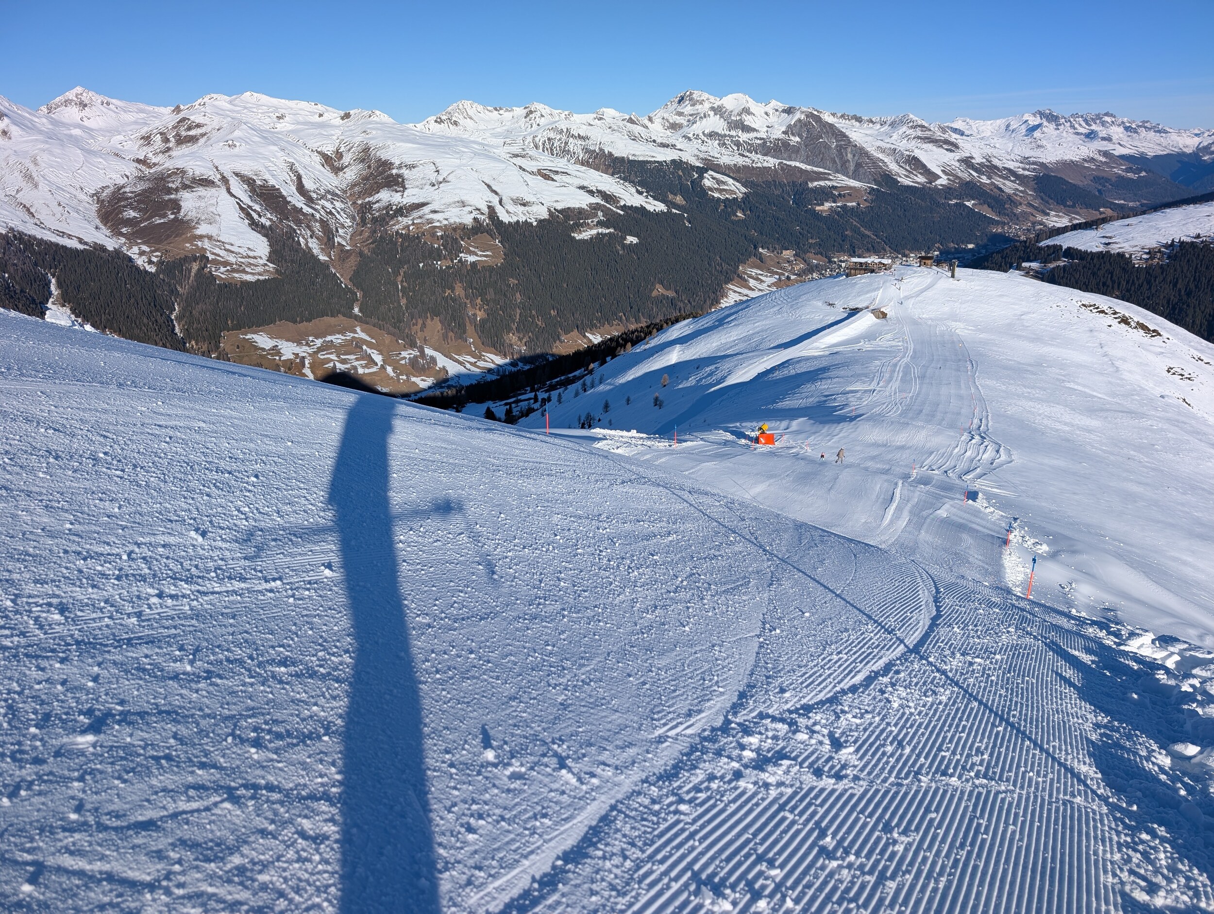 Oben ging es aber mit den Schlangen, zumindest beim Usser Isch und Clavadeler. Um 13 Uhr sind wir nochmals hoch. Die Pisten waren dann schon ziemlich zerfahren mit eisiger Unterlage, jedoch immer noch griffig.