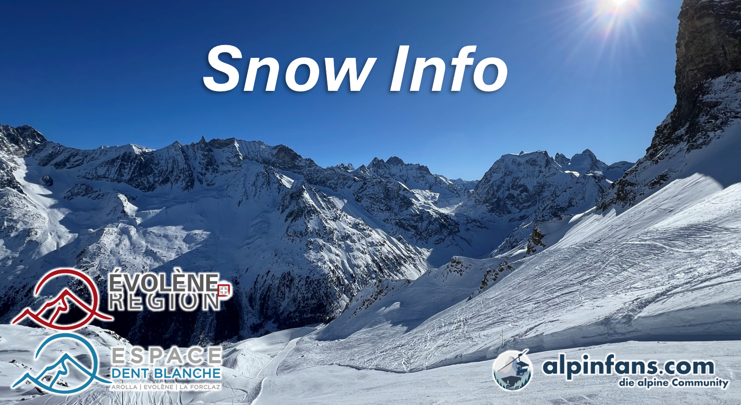 In diesem Thema findest du aktuelle Informationen über die Schneeverhältnisse in der Region von Evolène. Die drei Skigebiete von Arolla, Evolène und La Forclaz arbeiten unter dem Namen Espace Dent Blanche zusammen. Die Region befindet sich im Erringertal im Wallis.