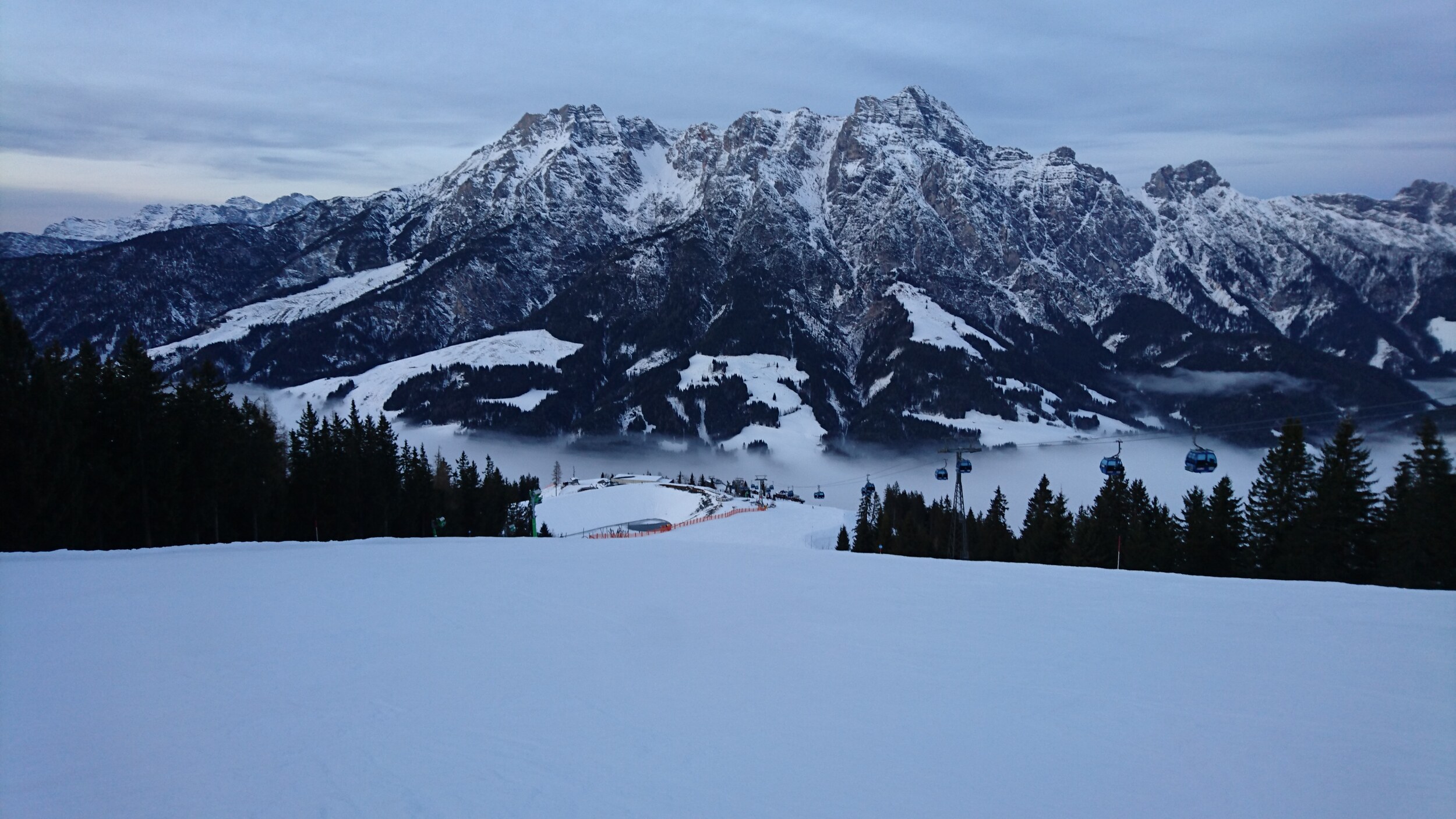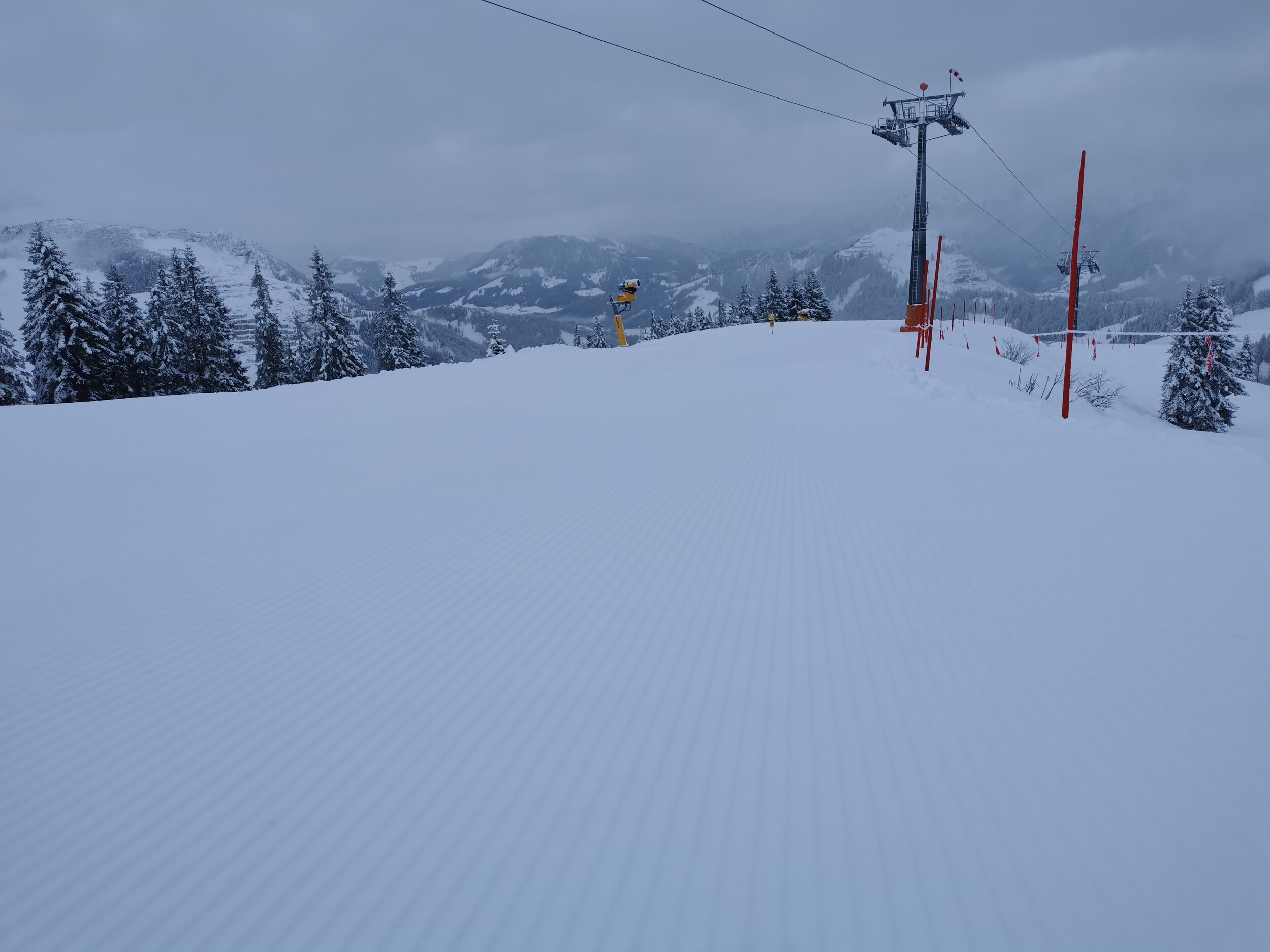 In Fieberbrunn auch steinfreie, gut gewalzte Pisten. Etwas auf der härteren Seite. Ohne Hügelbildung, wenig los. Eisig etwas auf der Talabfahrt Streuböden.