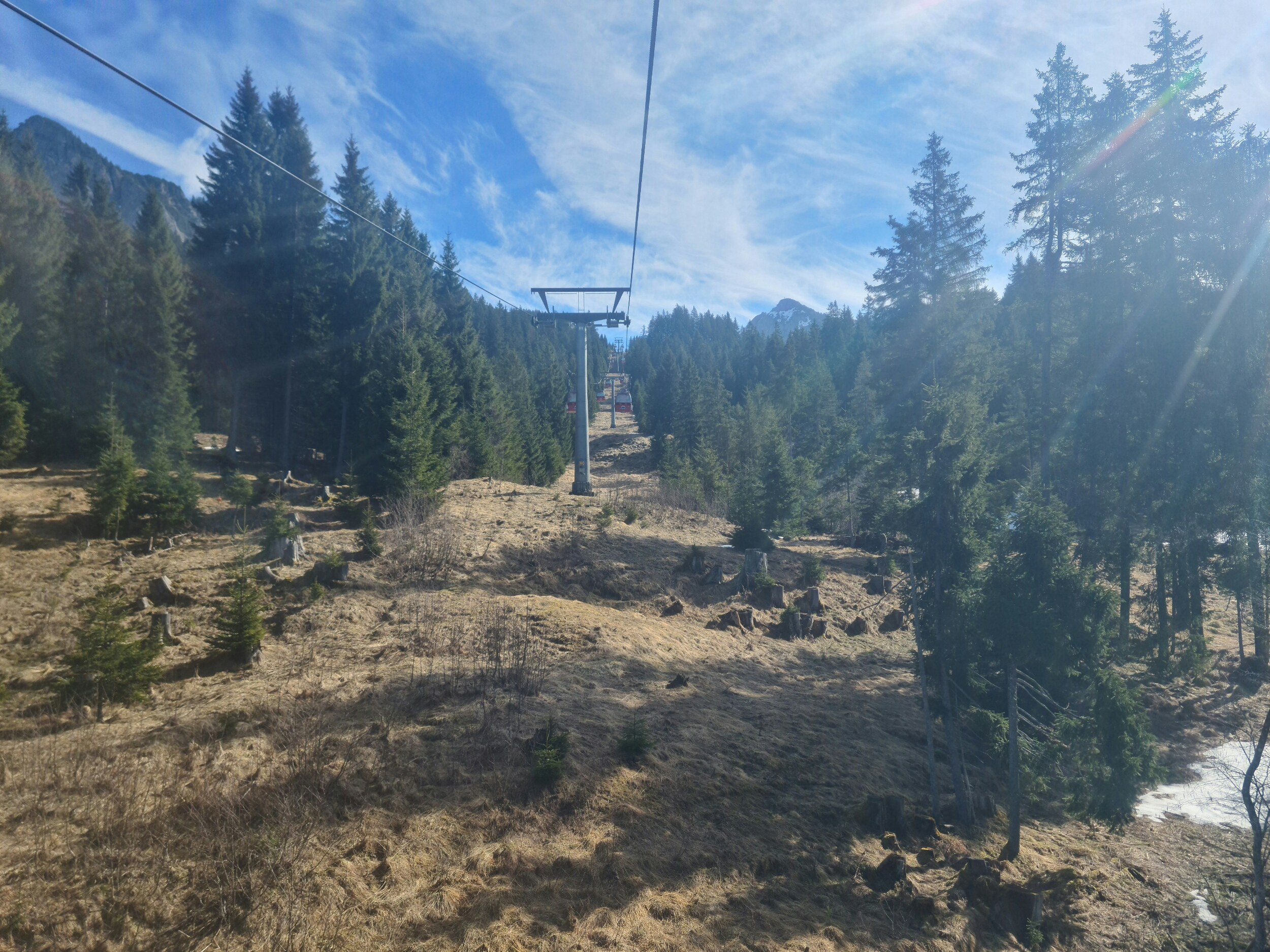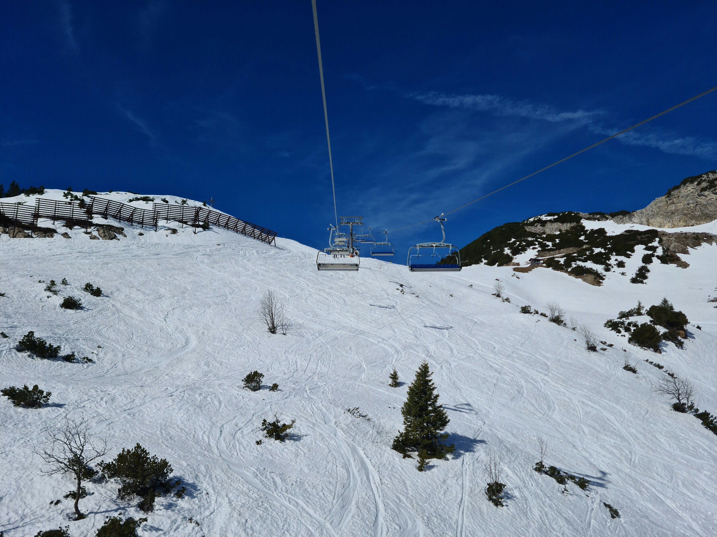 Bilder: #1- In der Kabinenbahn deuten zunächst nur noch Schneereste darauf hin, dass ich hier zum Skifahren hochfahre... #2- Das ist in der Sesselbahn Jochalpe dann zum Glück anders.