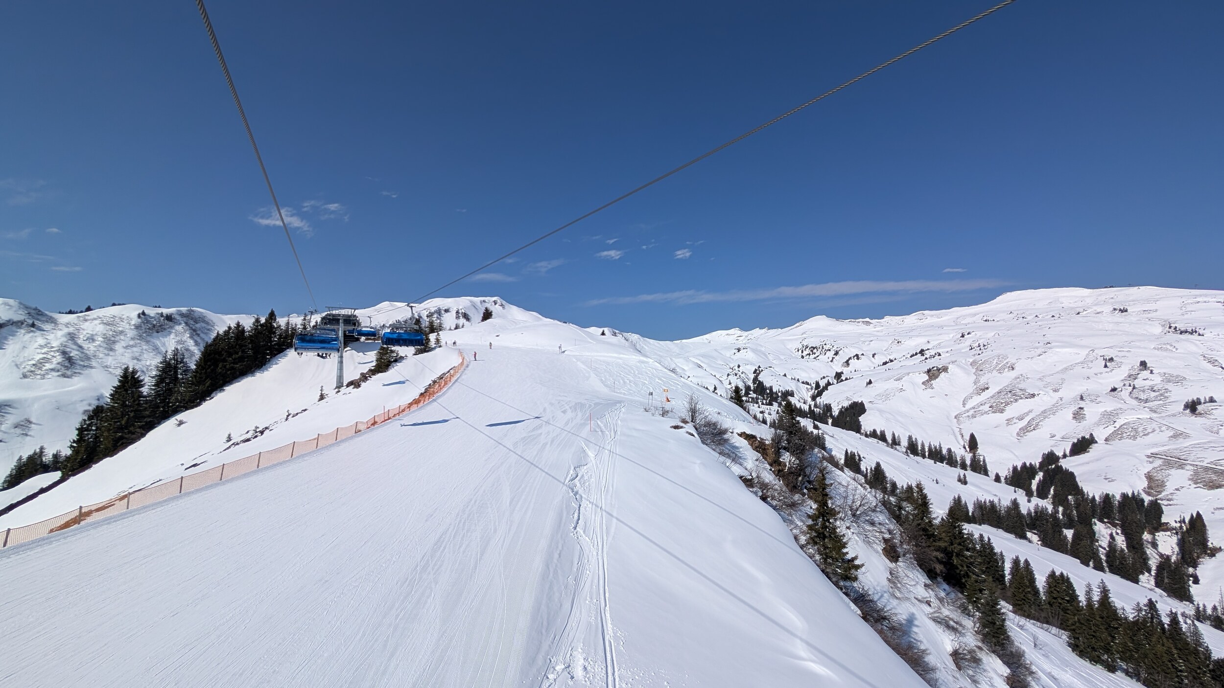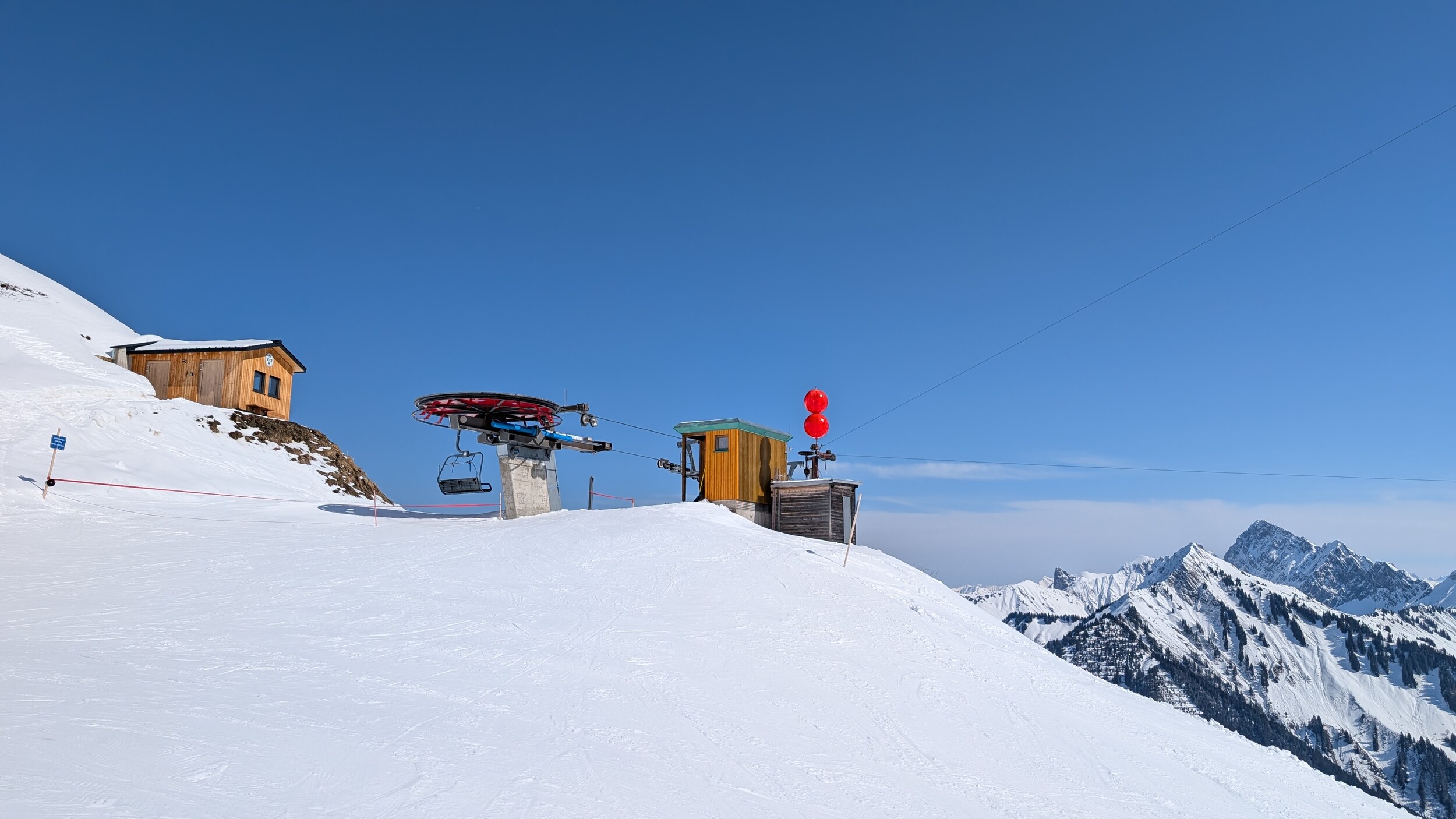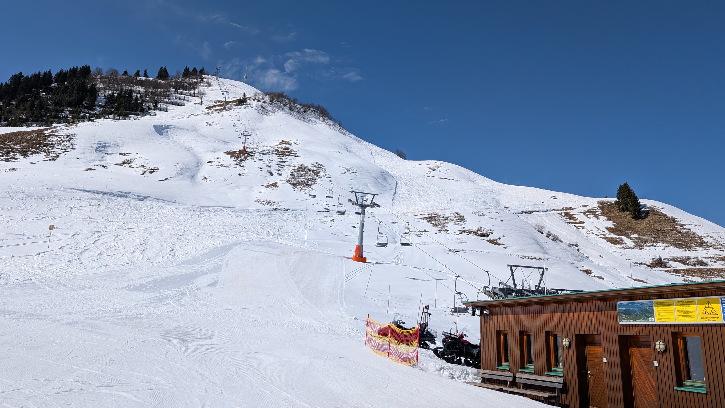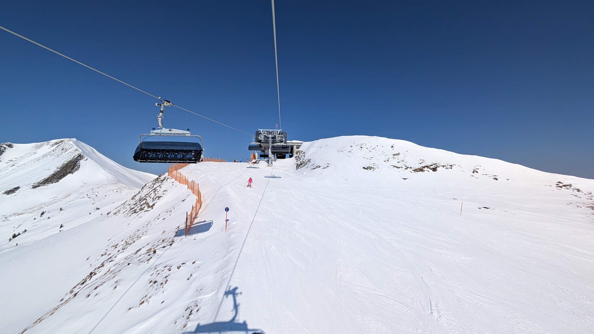 - Bei der Mittelstation kann man aussteigen und über einen Ziehweg weiter zum Vierersessellift kommen, oder man fährt über eine Skiroute wieder ins Tal, der zweite Abschnitt der Sesselbahn ist allerdings eigentlich komplett unnötig, mal gewinnt kaum an Höhe und wird nur weiter in Skigebiet nach hinten verlagert.