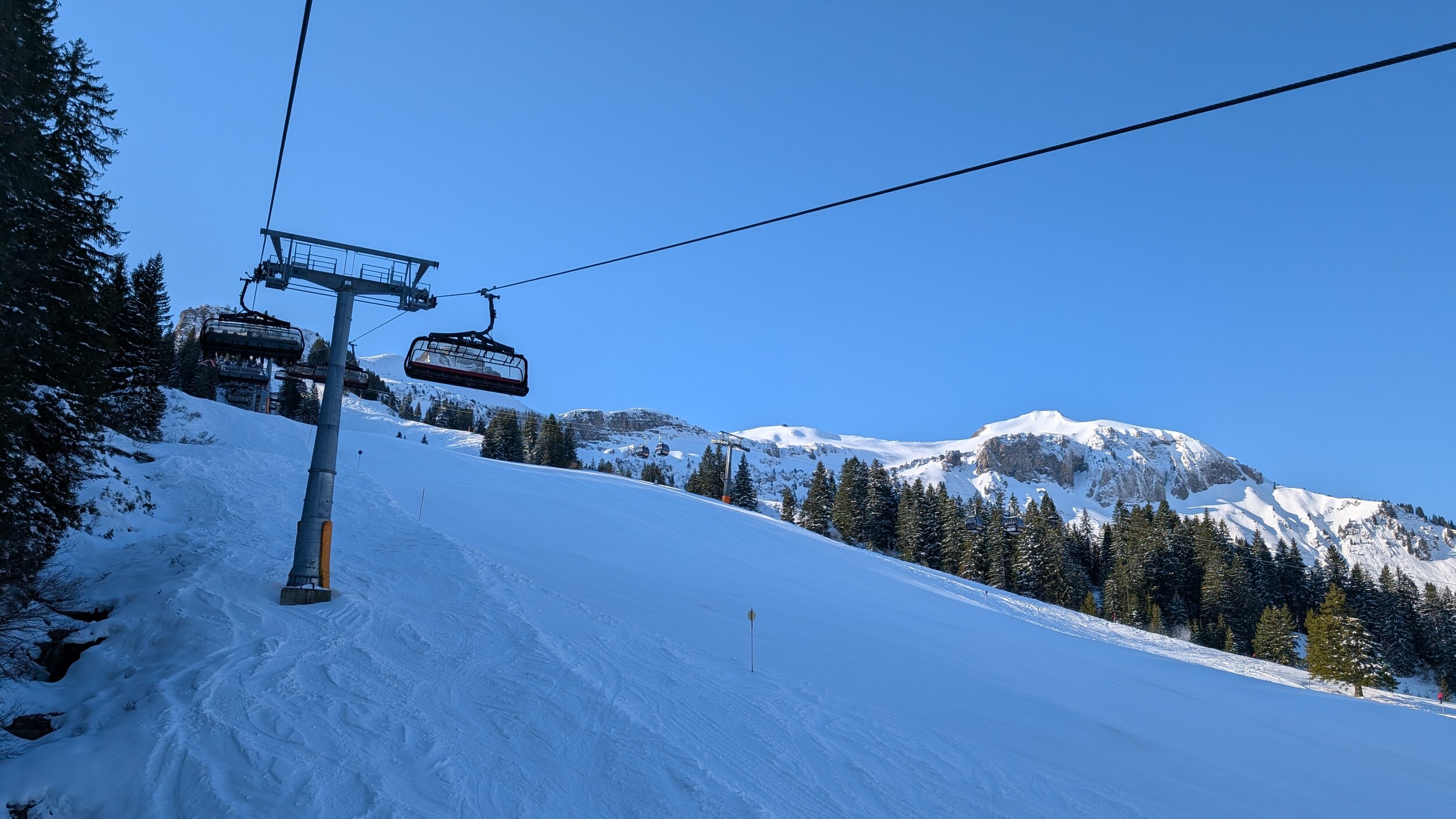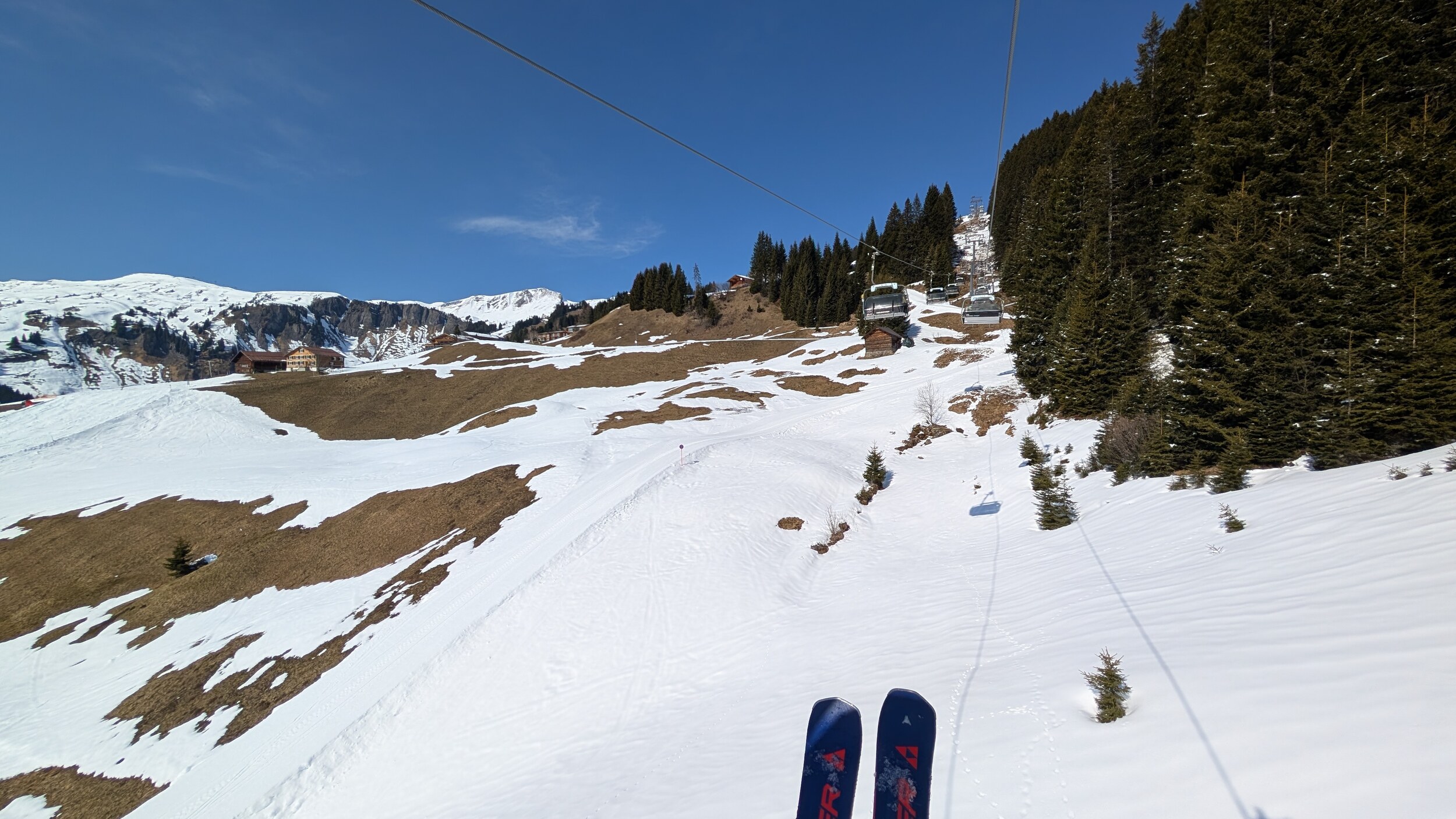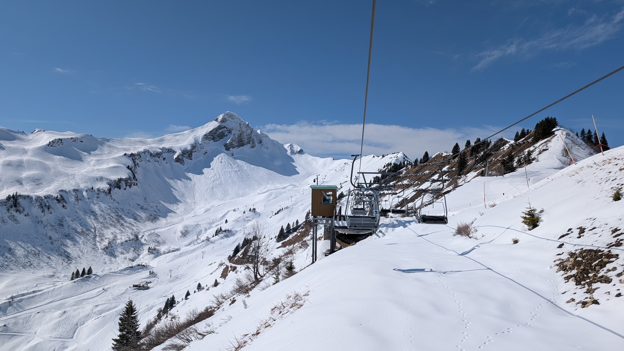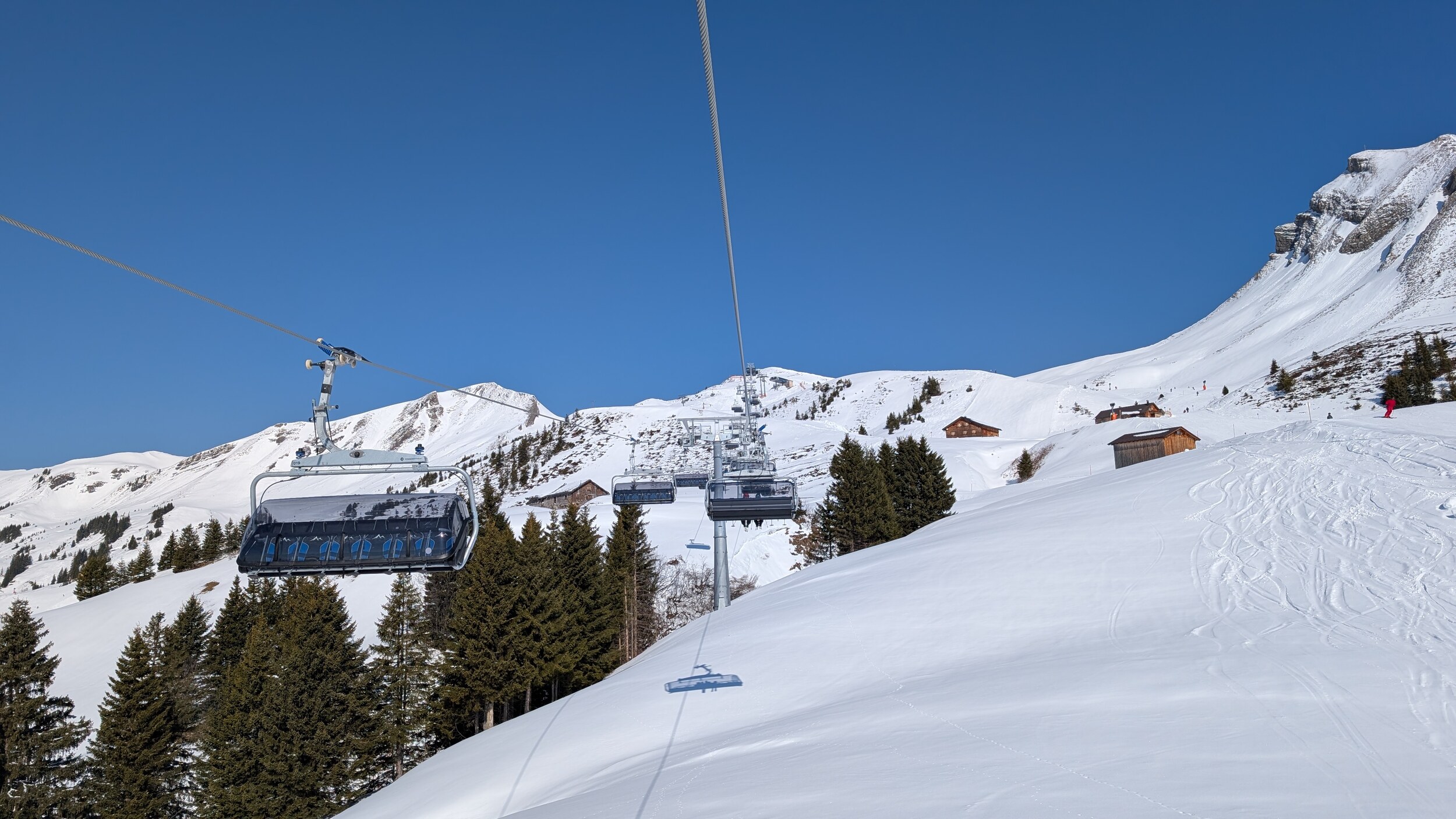 - Bei der Mittelstation kann man aussteigen und über einen Ziehweg weiter zum Vierersessellift kommen, oder man fährt über eine Skiroute wieder ins Tal, der zweite Abschnitt der Sesselbahn ist allerdings eigentlich komplett unnötig, mal gewinnt kaum an Höhe und wird nur weiter in Skigebiet nach hinten verlagert.