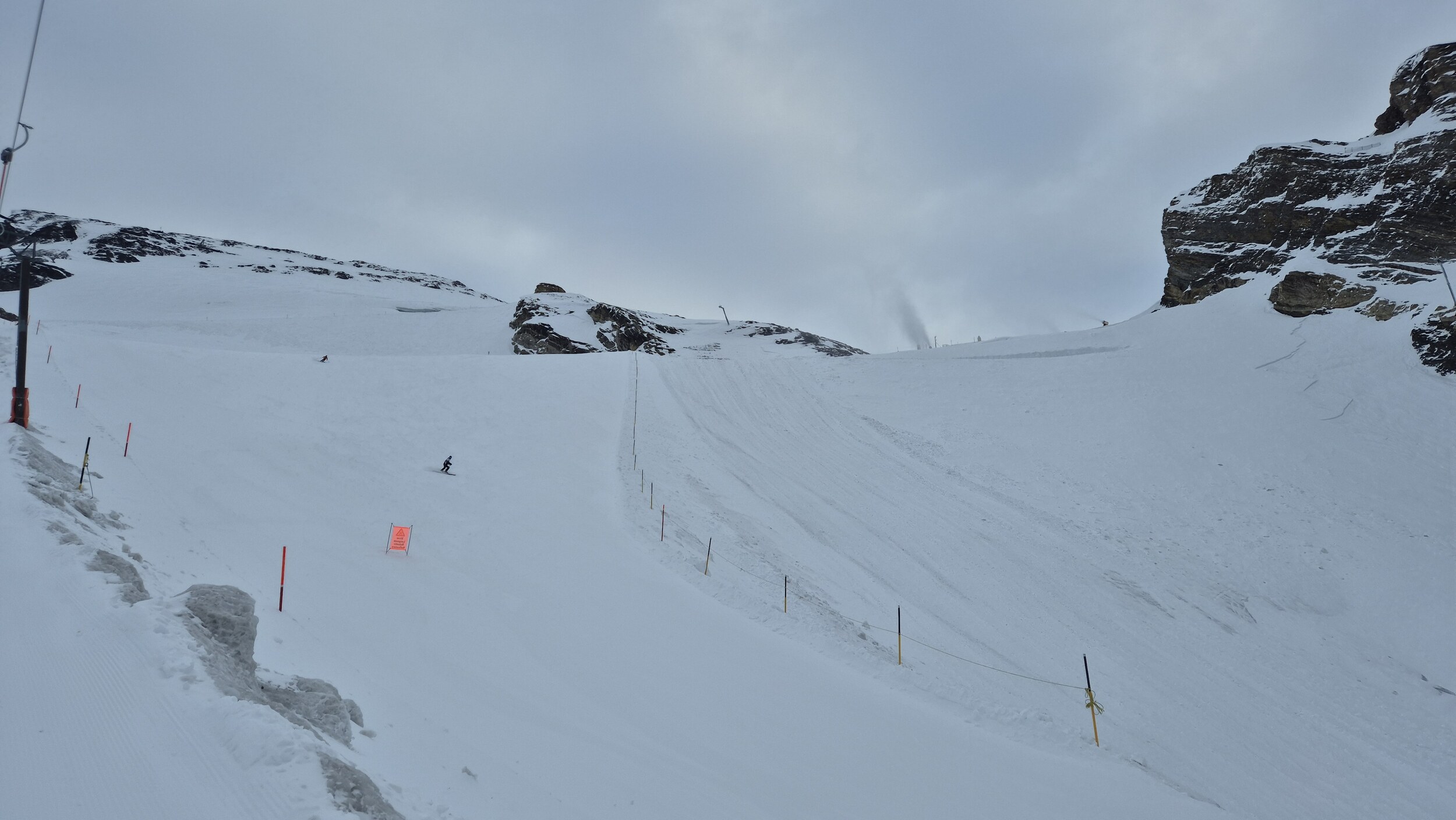 Schnee wurde vom Gletscher auf der Piste verschoben. Dazu laufen noch tagsüber einige Schneekanonen. Beide Varianten am Skilift sind schön griffig: