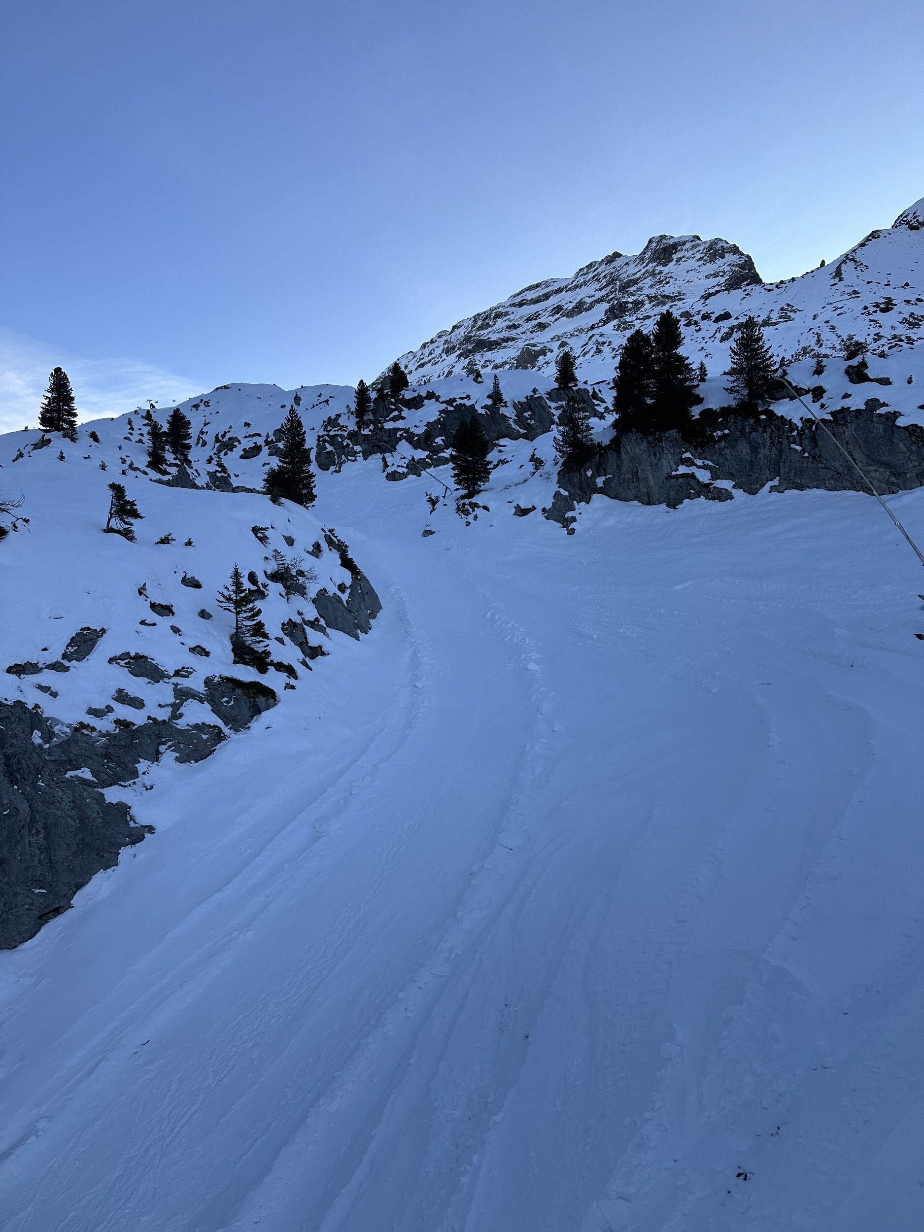 Nach einige Wiederholungen fahre ich die Rotegg runter. Sie ist die schlechste Piste heute. Wenig Schnee, meistens abgepresst, und einiges an Steine. Aber einmal muss es sein: