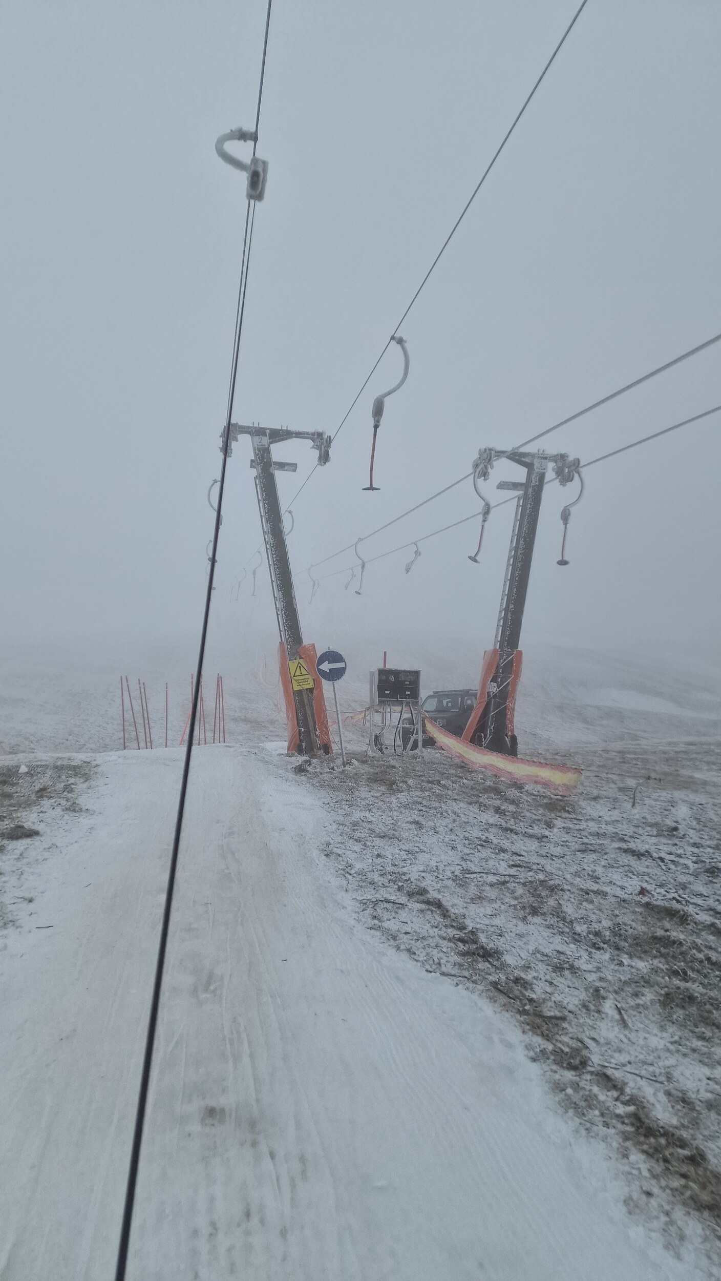 Zudem hat man das Seil vom Resi so stark beschneit, dass das schon ungesund aussieht. Das Bild ist leider nicht sonderlich gut, aber man kann glaube ich trotzdem den Durchhang aufgrund der Vereisung sehen. Normalerweise ist das Seil auf gleicher Höhe wie beim anderen Lift. Liftaufsicht aus dem Auto