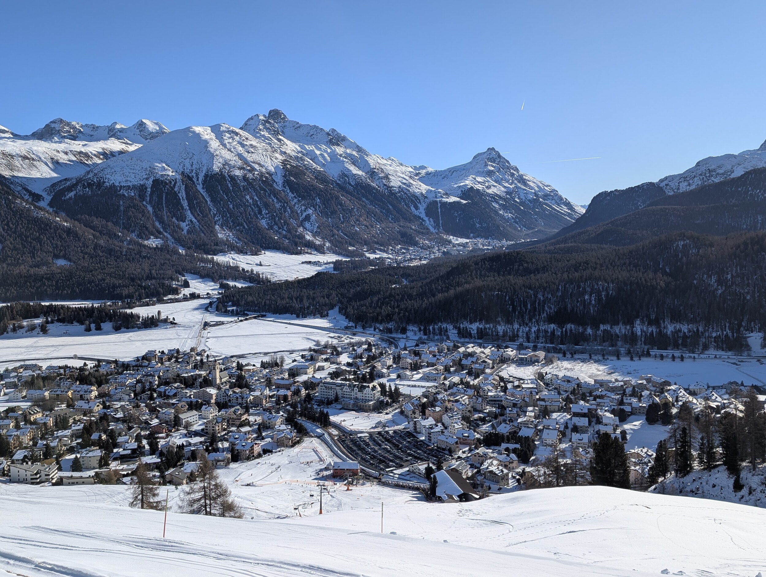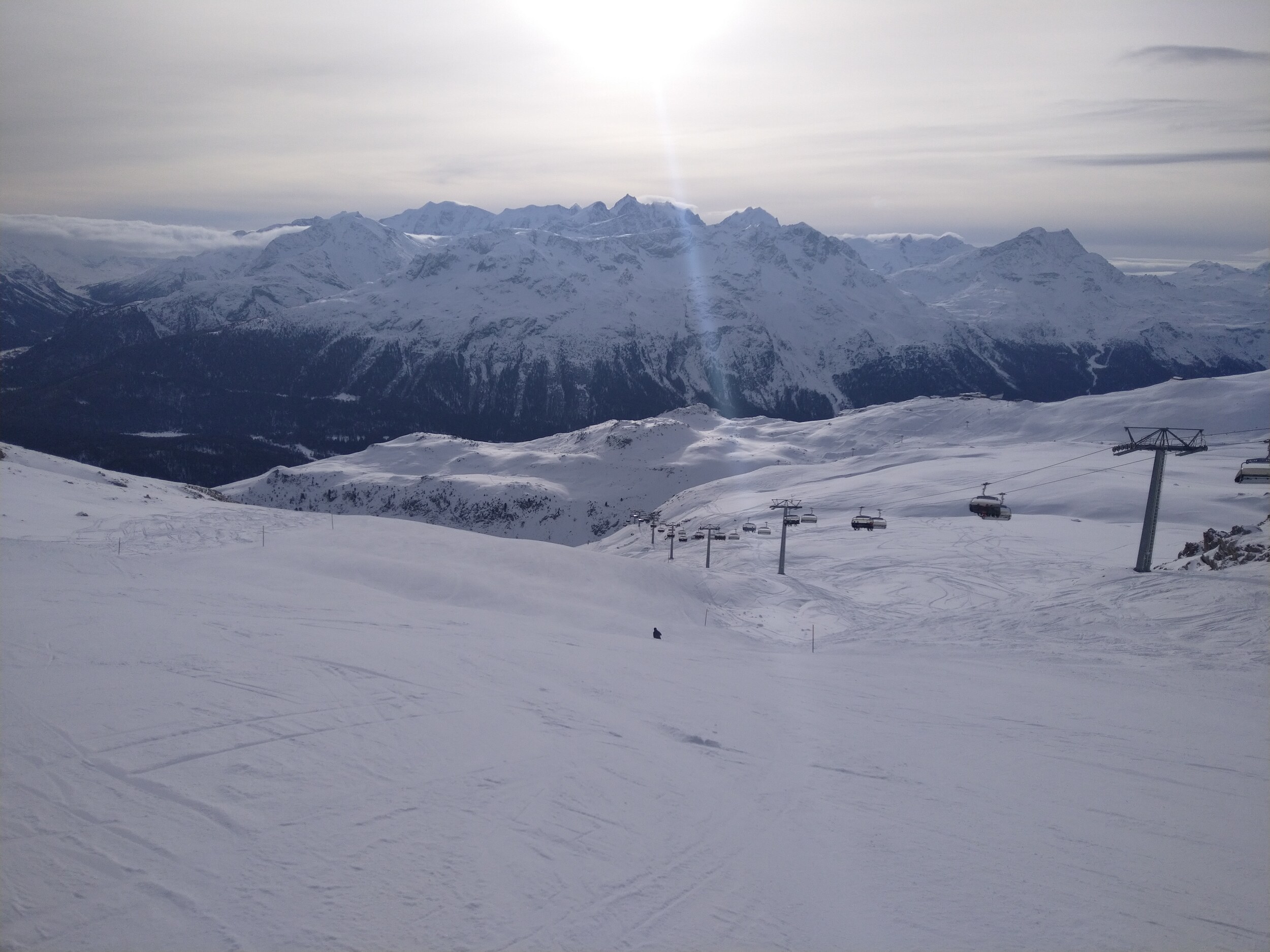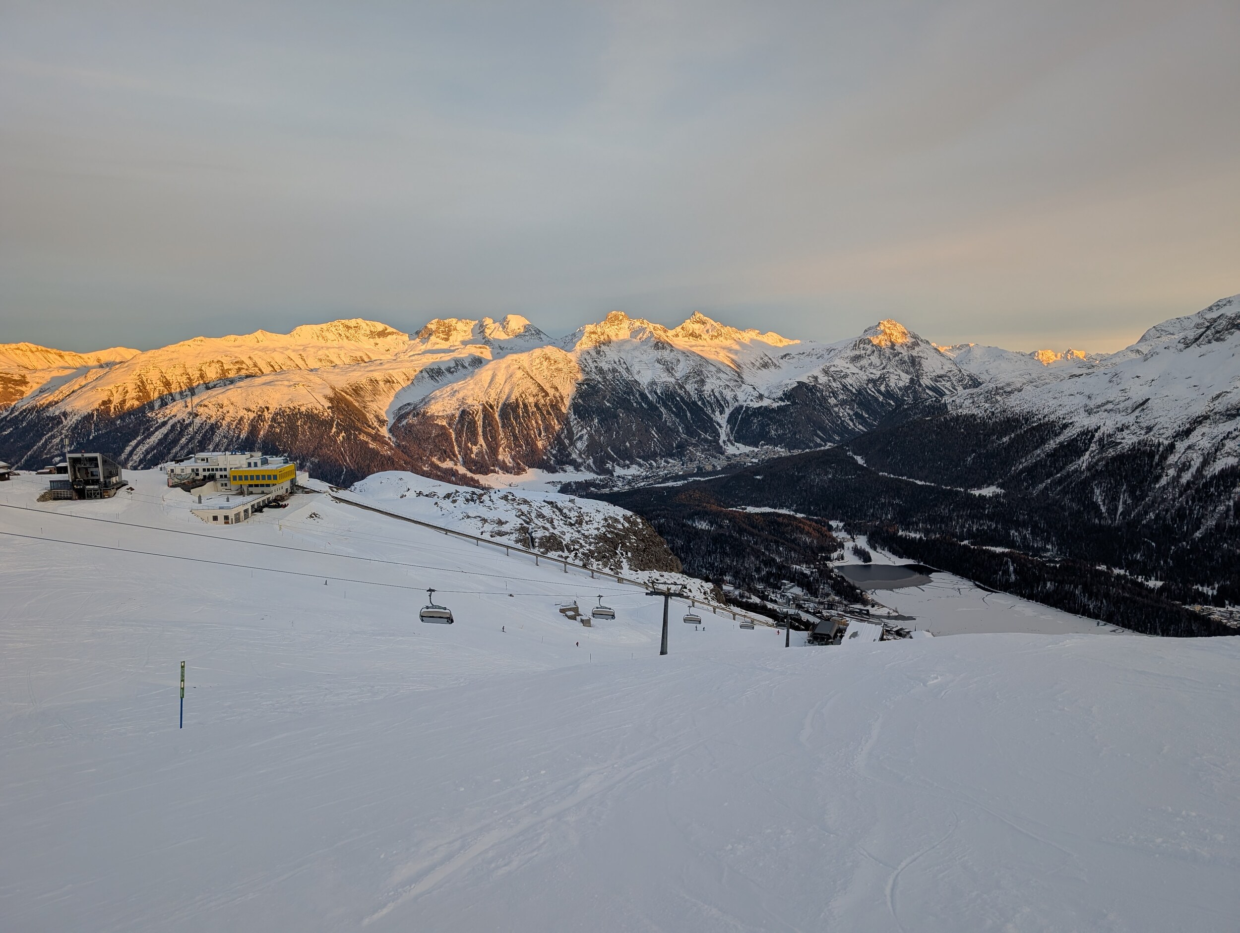 Ich war die letzten beiden Tage in St. Moritz auf den Pisten unterwegs. Gestern waren wir nur auf Corviglia, heute wechselten wir um 10:18 Uhr noch auf den Corvatsch. Immer wieder positiv hervorzuheben ist der frühere Betriebsbeginn, der auch erstaunlich gut angenommen wird. In der Jugendherberge waren um 7 Uhr beim Frühstück schon Hochbetrieb.