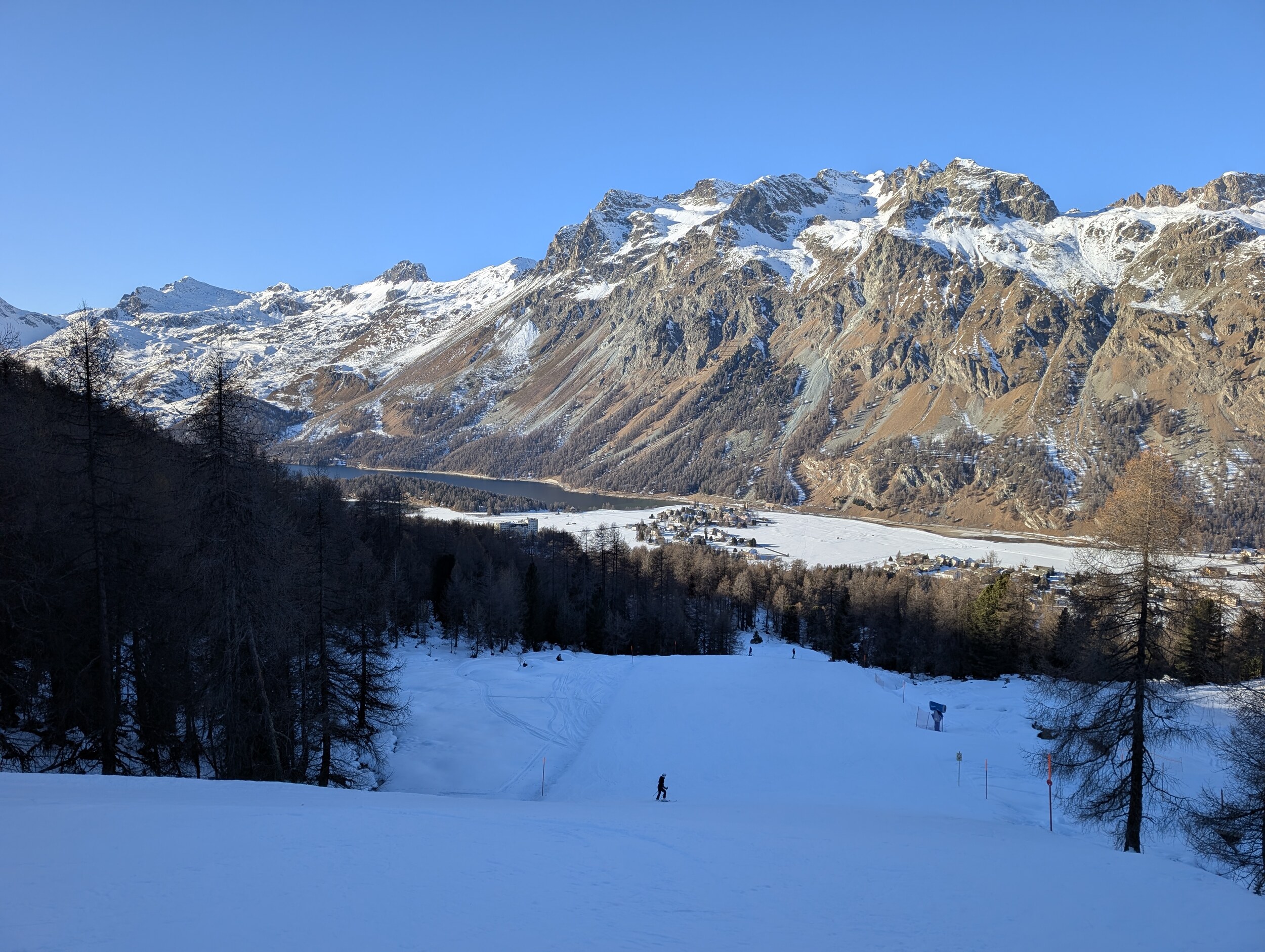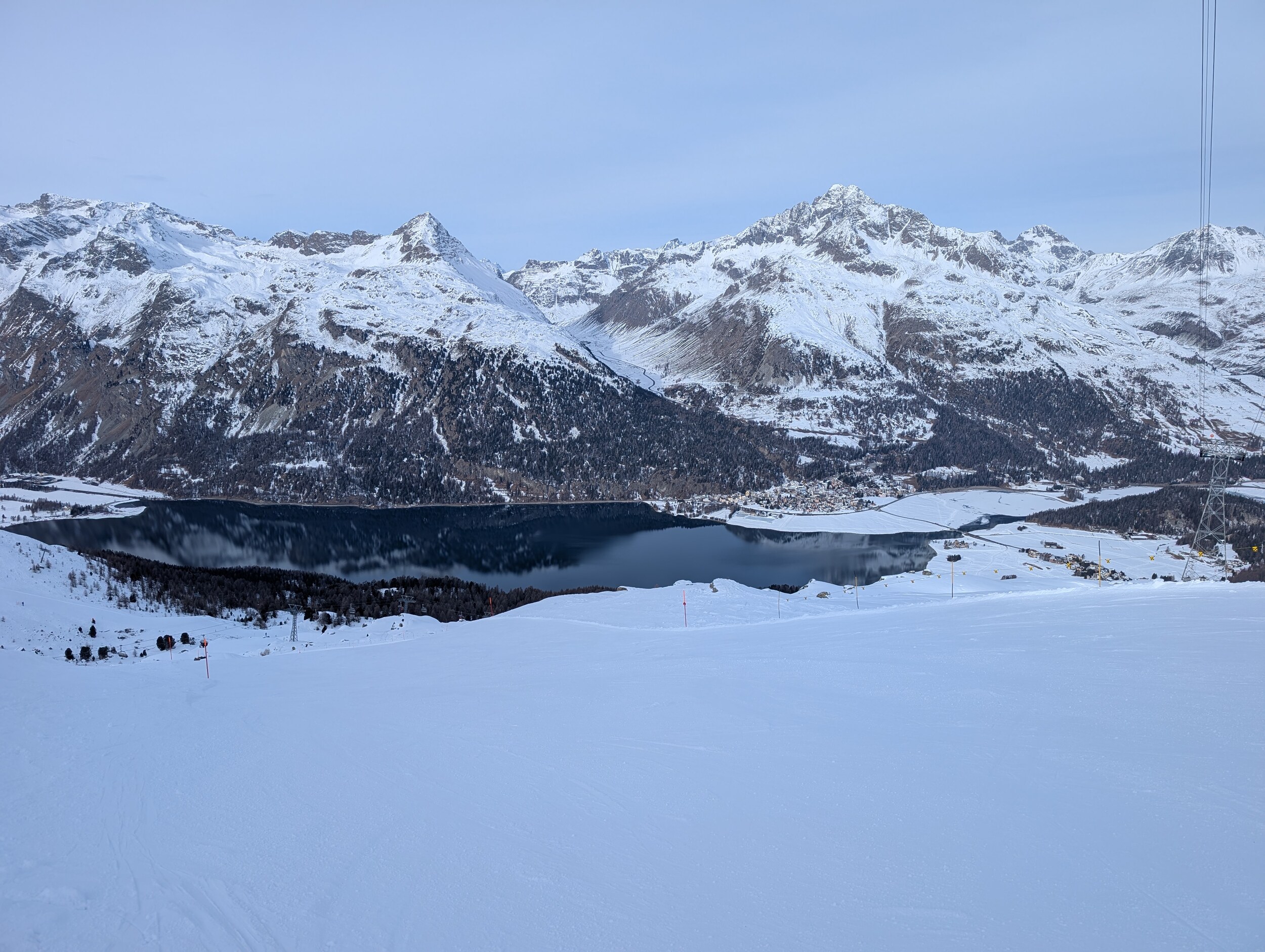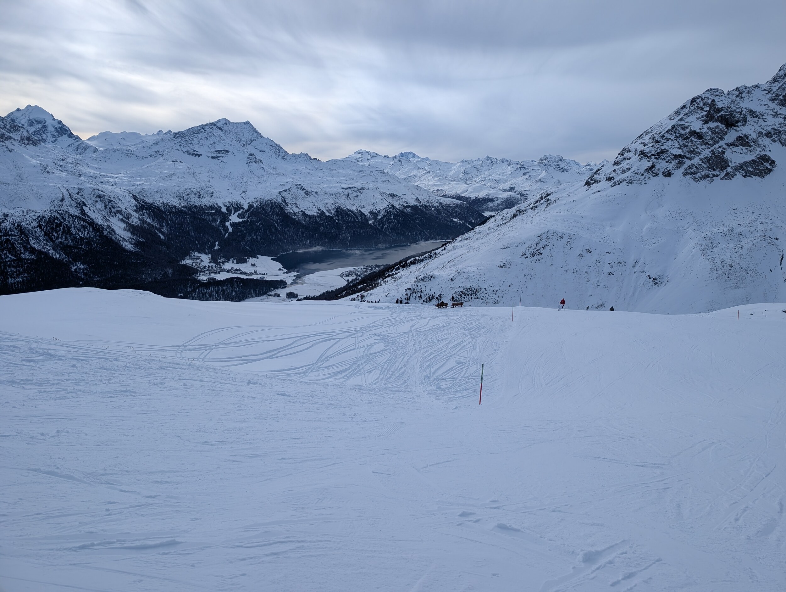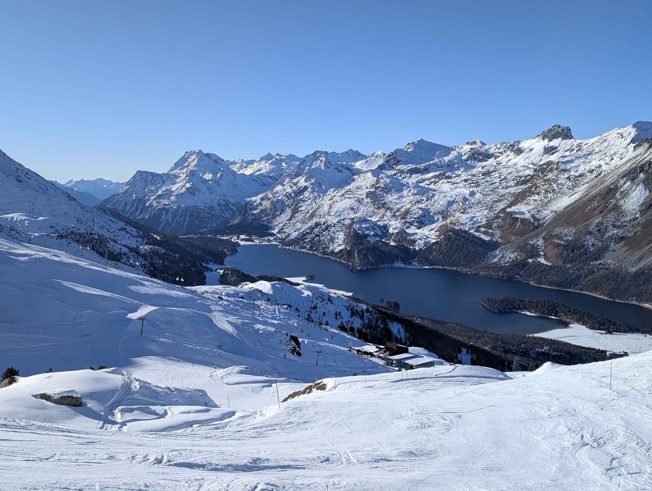 Nun hole ich den Rucksack und mache mich auf den Weg Richtung Salastrains und Randolins, bevor der Wechsel an den Corvatsch ansteht. Gut, dass es nicht nur den Plateau Nair-Sessel gibt. Links gehts immer zügig. Edit 12:55 Uhr. Wie immer problemloser Wechsel an den Corvatsch. Zuvor nach einer Stärkung in der speditiven Quattro-Bar noch etwas "randolinsen" sowie die tolle Schwarze 9 Muntanella geniessen: Die äussere Piste am Randolins hat ganz gut gehalten und ist weiter griffig und vor allem leer: Wunderbare Tiefblicke auf die Oberengadiner Seenplatte: Edit 14:15 Uhr. Perfekte Anschlusszeit. Bus trifft 3min vor Abfahrt der Pendelbahn ein. So muss Skigebietswechsel. In einem Zug hoch auf den Gipfel für den ersten richtigen Pulverschnee der Saison.