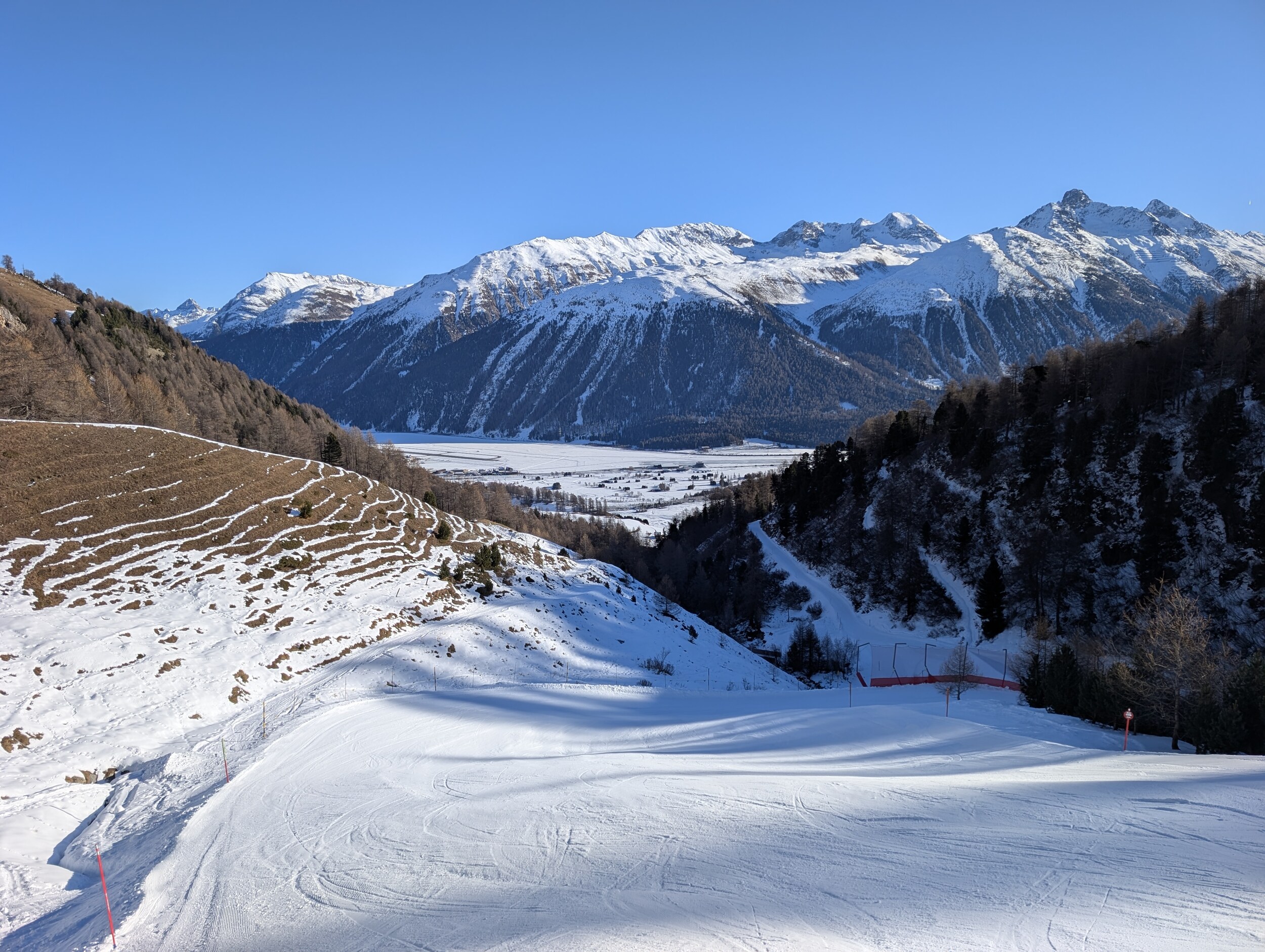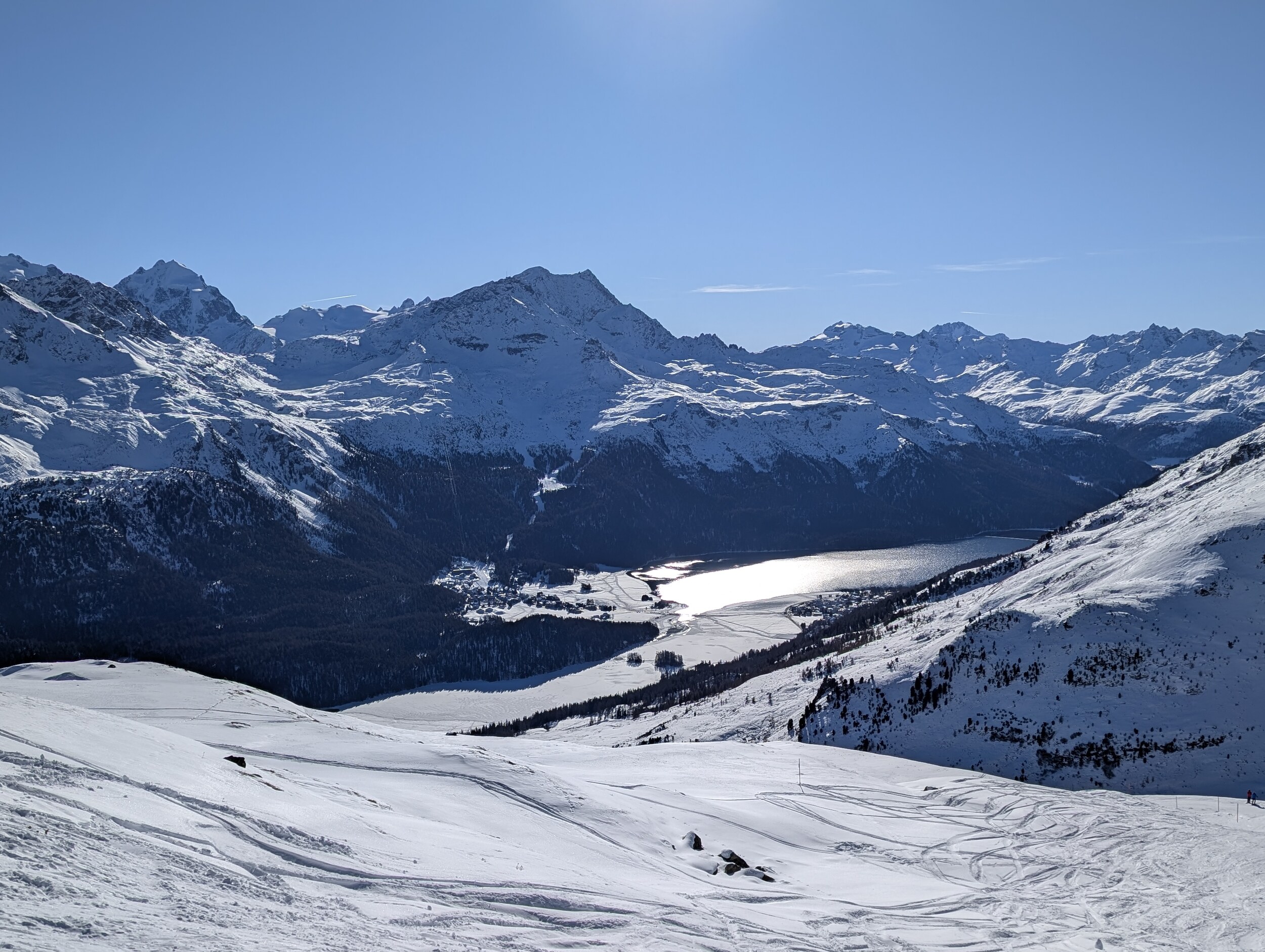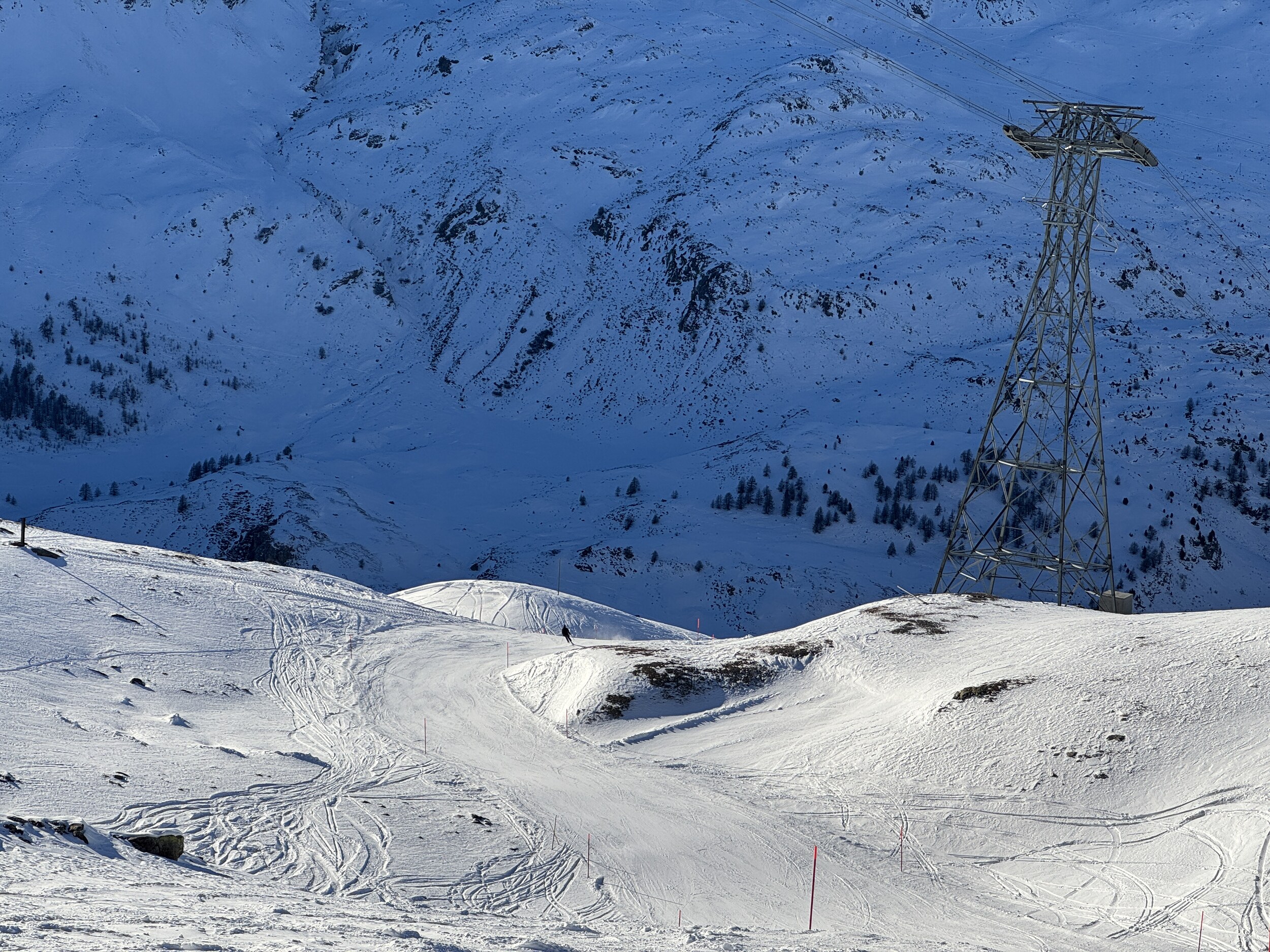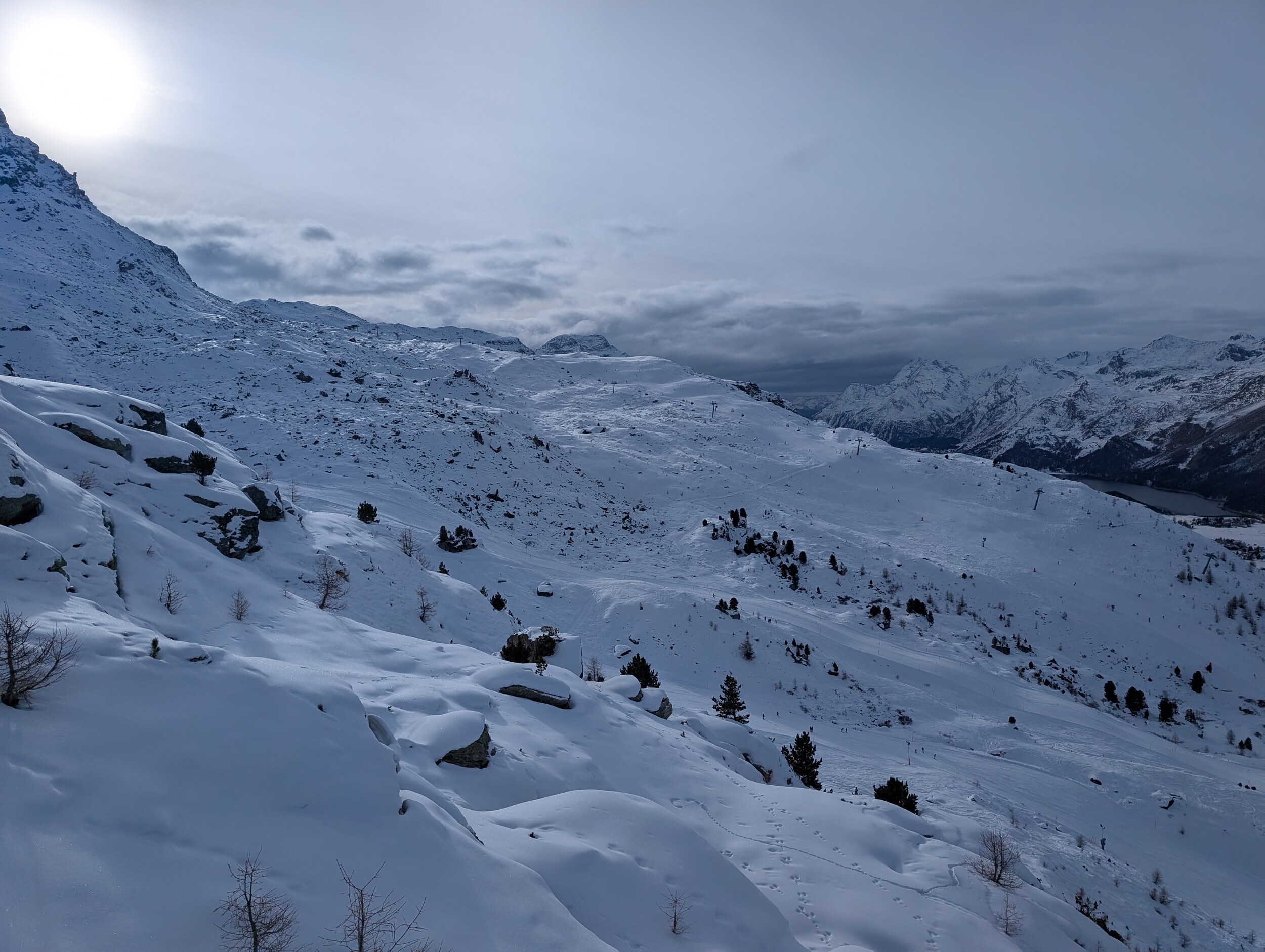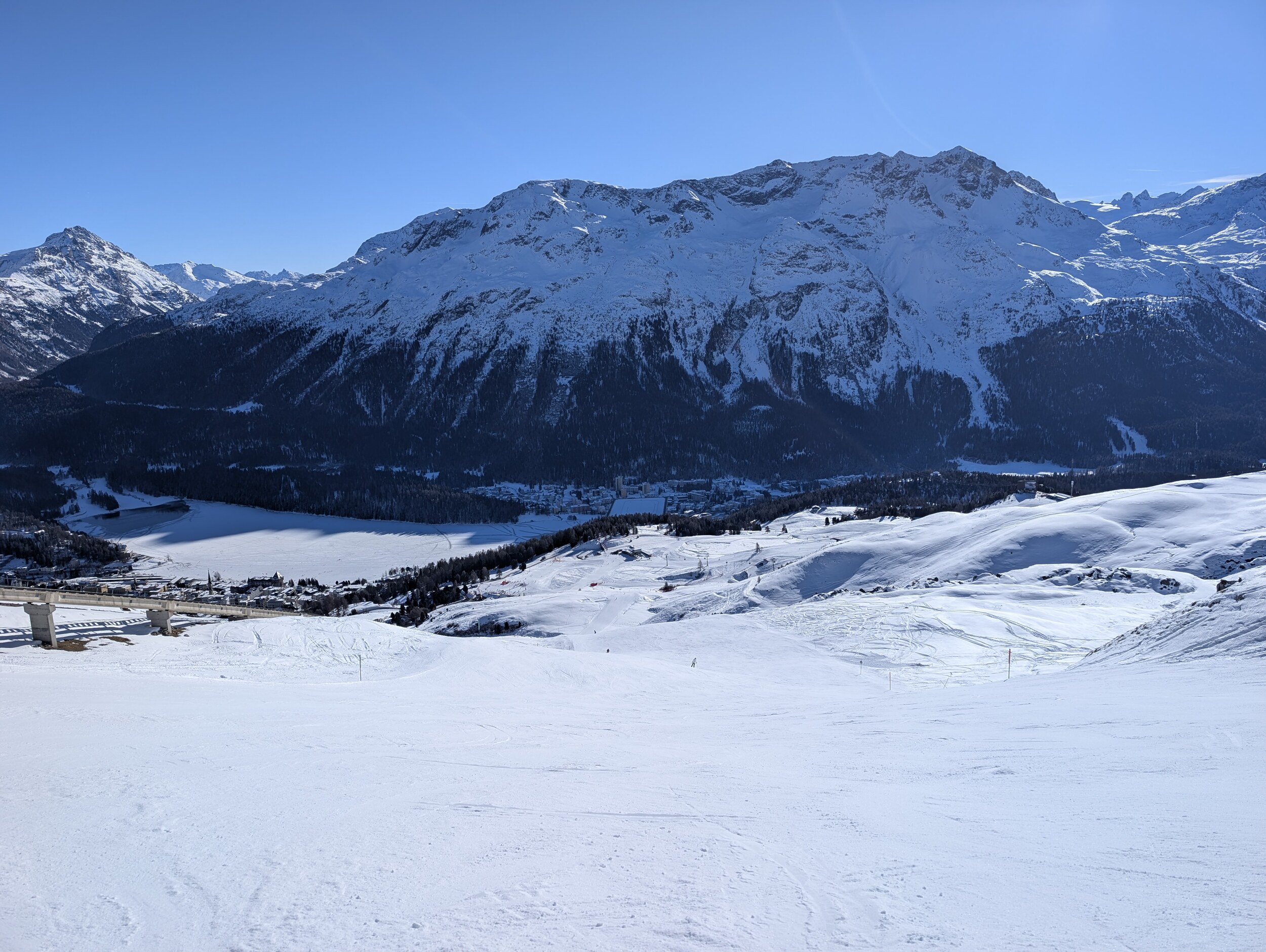 Nun hole ich den Rucksack und mache mich auf den Weg Richtung Salastrains und Randolins, bevor der Wechsel an den Corvatsch ansteht. Gut, dass es nicht nur den Plateau Nair-Sessel gibt. Links gehts immer zügig. Edit 12:55 Uhr. Wie immer problemloser Wechsel an den Corvatsch. Zuvor nach einer Stärkung in der speditiven Quattro-Bar noch etwas "randolinsen" sowie die tolle Schwarze 9 Muntanella geniessen: Die äussere Piste am Randolins hat ganz gut gehalten und ist weiter griffig und vor allem leer: Wunderbare Tiefblicke auf die Oberengadiner Seenplatte: Edit 14:15 Uhr. Perfekte Anschlusszeit. Bus trifft 3min vor Abfahrt der Pendelbahn ein. So muss Skigebietswechsel. In einem Zug hoch auf den Gipfel für den ersten richtigen Pulverschnee der Saison.