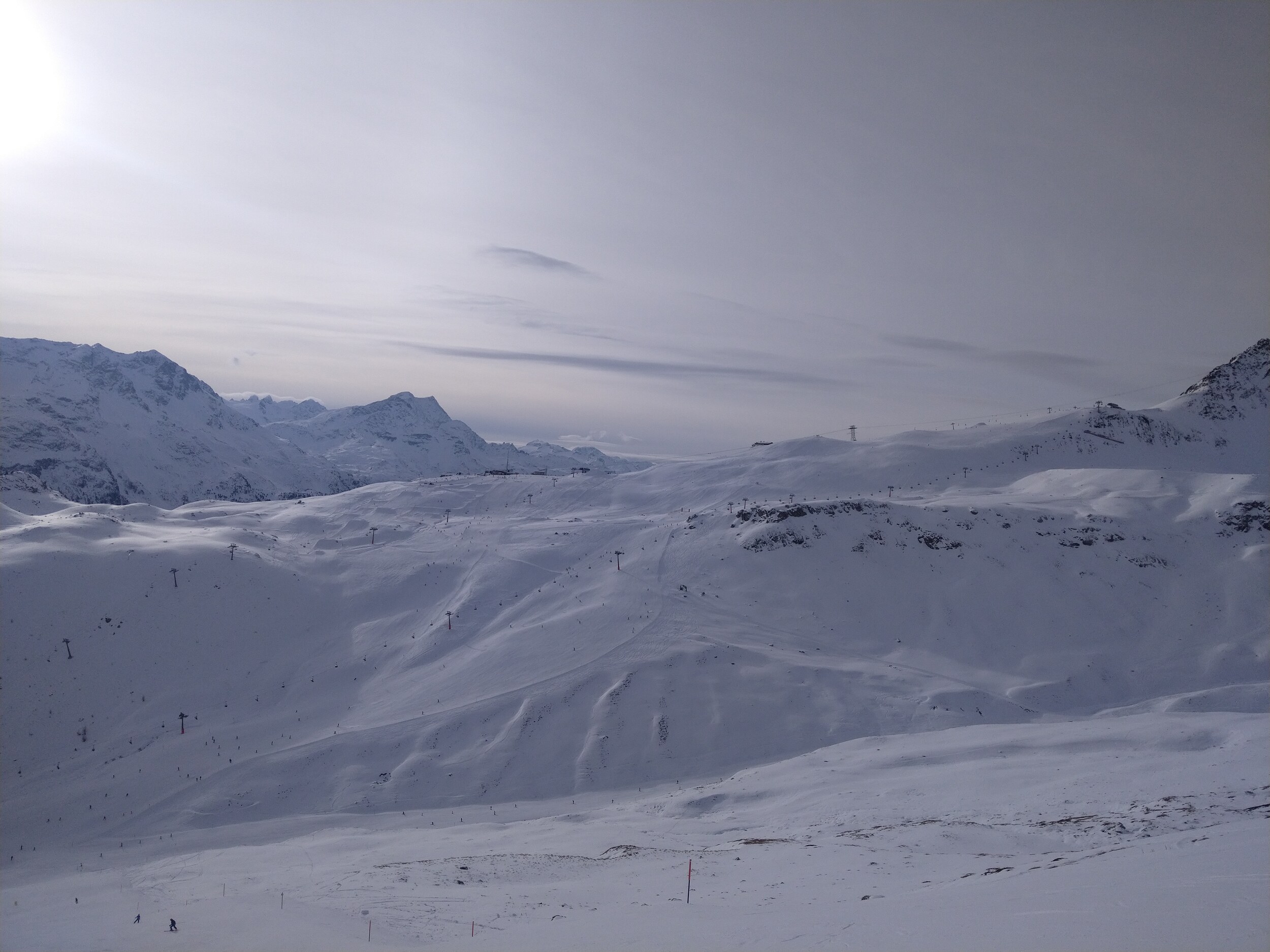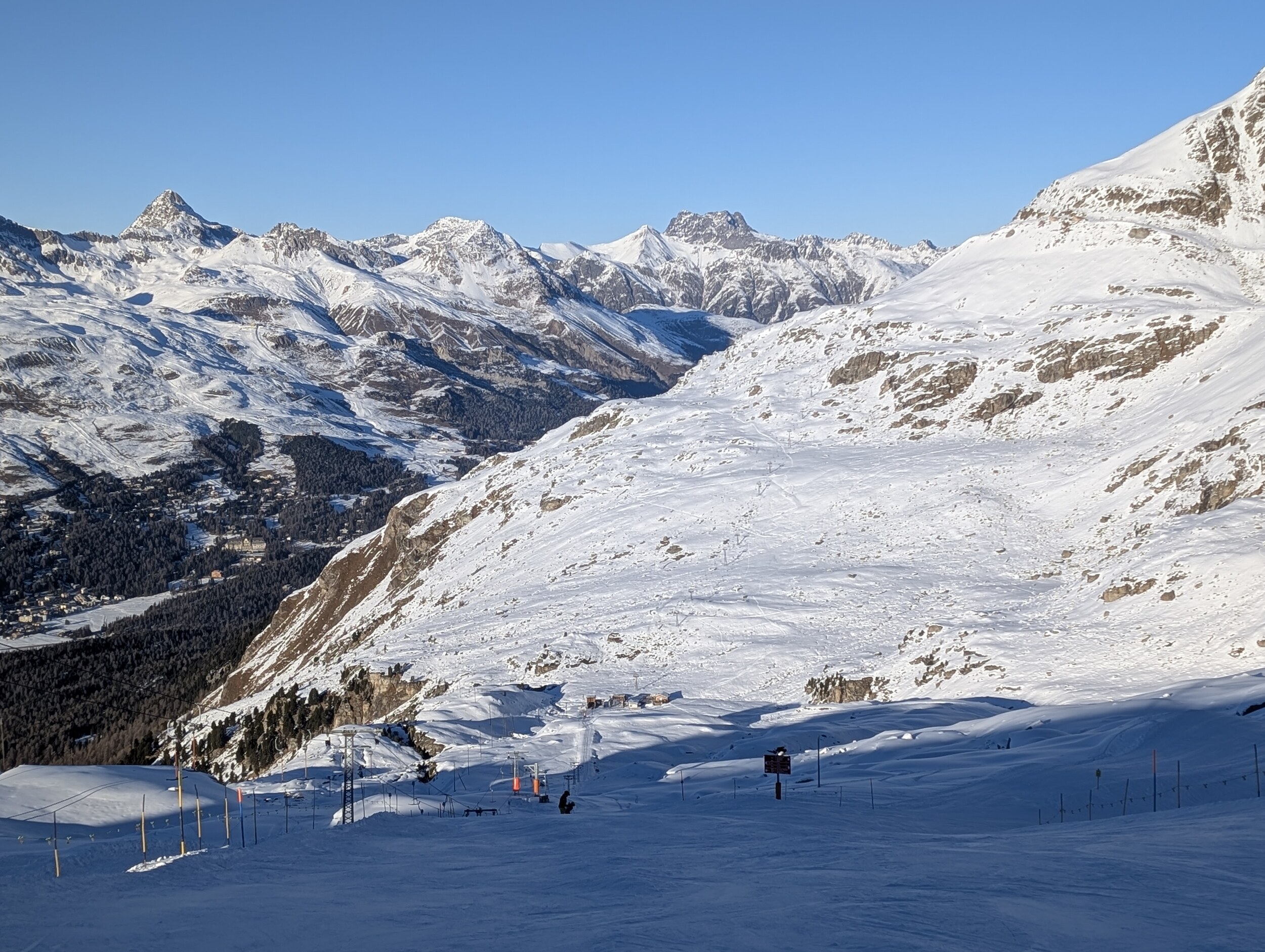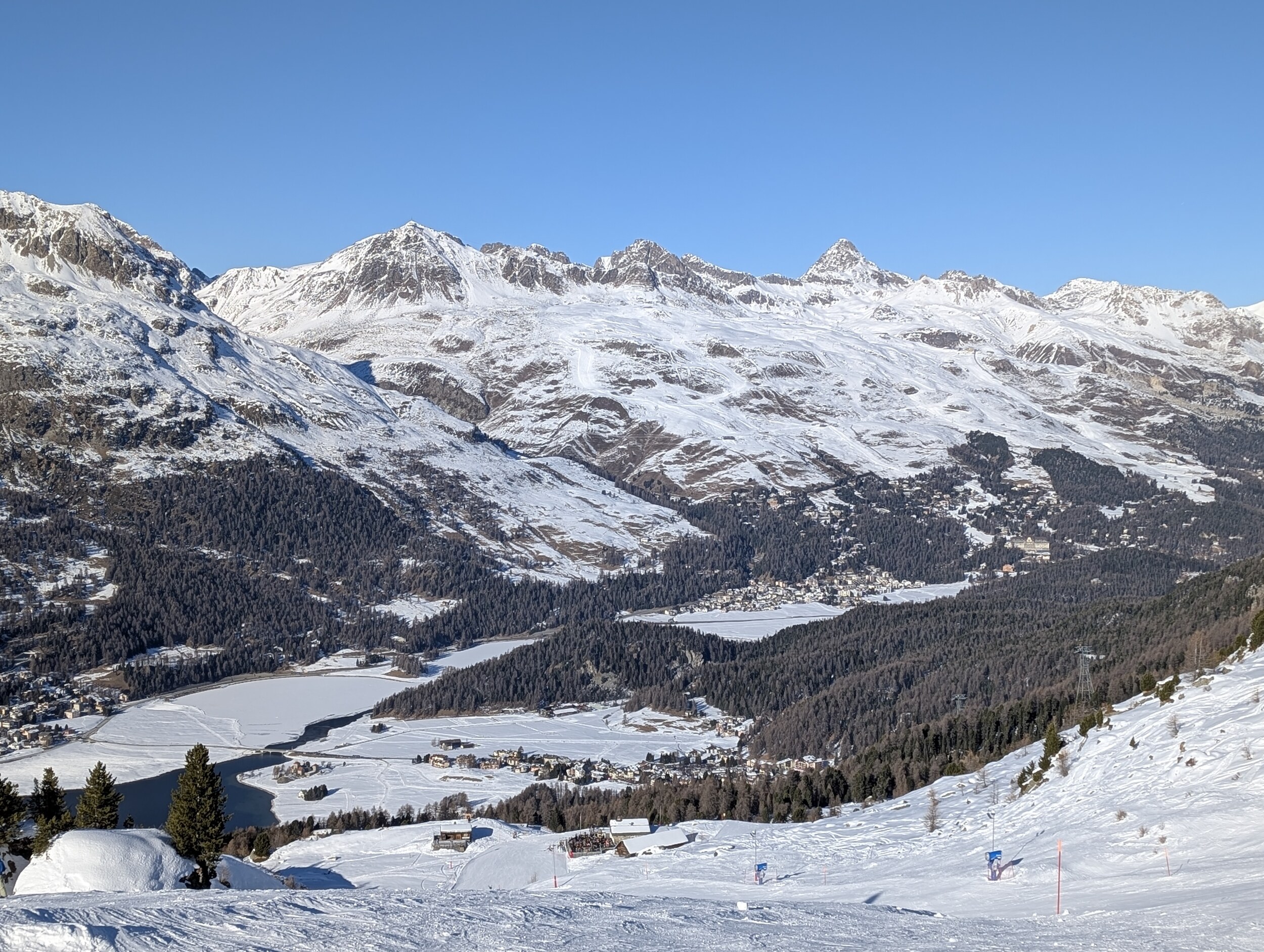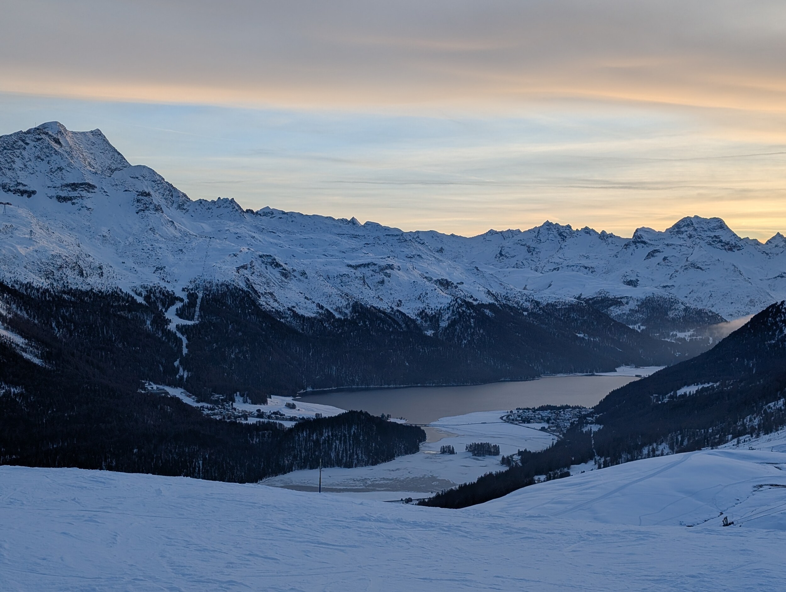 Nun hole ich den Rucksack und mache mich auf den Weg Richtung Salastrains und Randolins, bevor der Wechsel an den Corvatsch ansteht. Gut, dass es nicht nur den Plateau Nair-Sessel gibt. Links gehts immer zügig. Edit 12:55 Uhr. Wie immer problemloser Wechsel an den Corvatsch. Zuvor nach einer Stärkung in der speditiven Quattro-Bar noch etwas "randolinsen" sowie die tolle Schwarze 9 Muntanella geniessen: Die äussere Piste am Randolins hat ganz gut gehalten und ist weiter griffig und vor allem leer: Wunderbare Tiefblicke auf die Oberengadiner Seenplatte: Edit 14:15 Uhr. Perfekte Anschlusszeit. Bus trifft 3min vor Abfahrt der Pendelbahn ein. So muss Skigebietswechsel. In einem Zug hoch auf den Gipfel für den ersten richtigen Pulverschnee der Saison.
