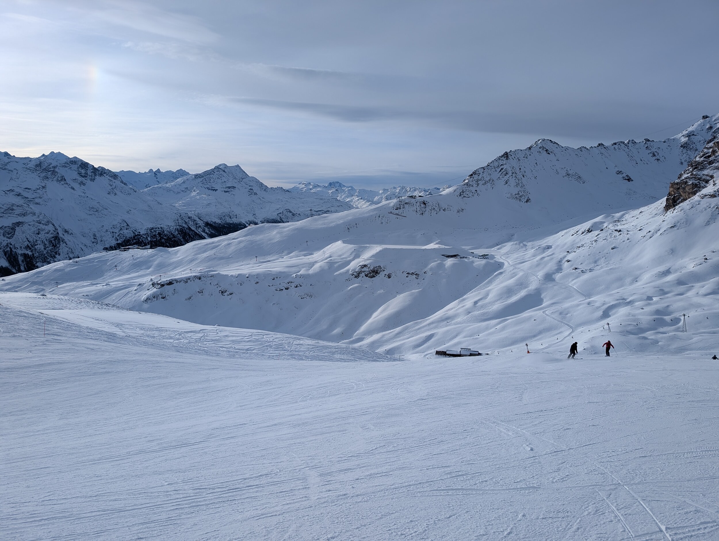 Edit 10:45 Uhr: Viele Leute am Trais Fluors. Wir fahren die neue Abenteuerpiste und gehen direkt zum Glüna-Sessel. Auch hier sehr viel los und schon ziemlich abgefahrene Pisten.