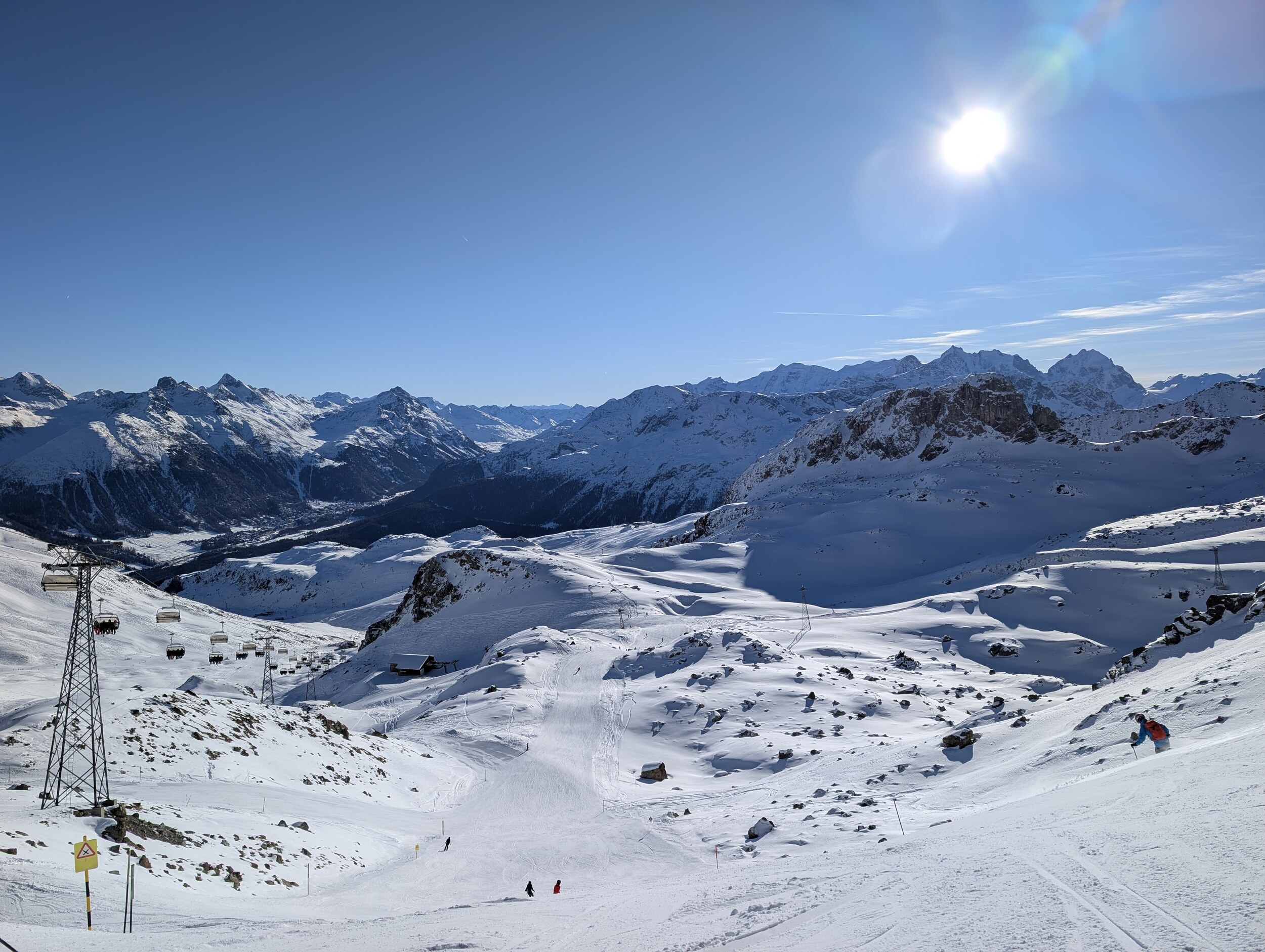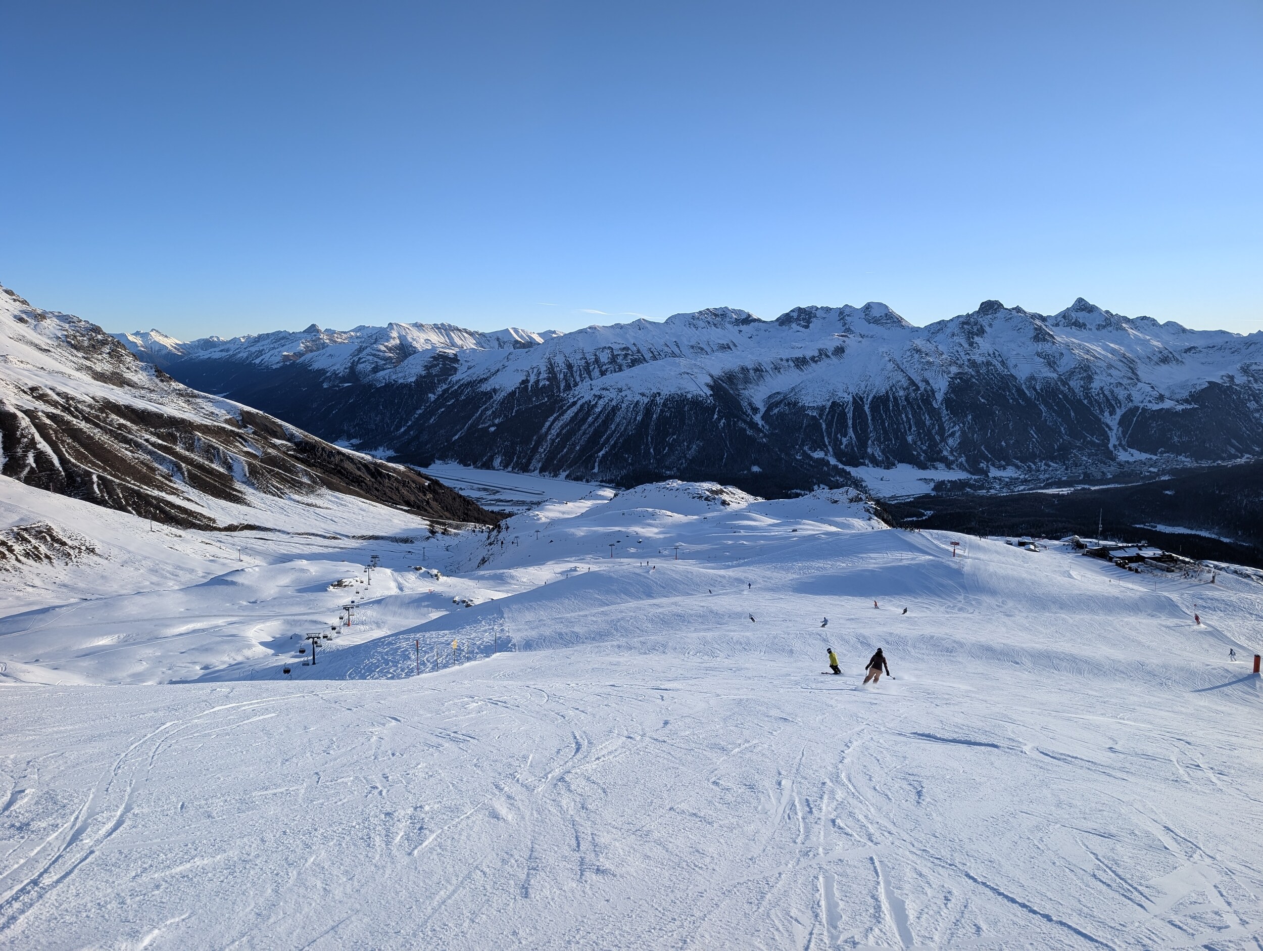 Die Verhältnisse auf Corviglia waren im Vergleich zu Santa Caterina und Livigno die Tage davor nochmals härter bzw. aus meiner Sicht teilweise schon eisig. Das gilt insebsondere für die rote und schwarze Piste am Trais Fluors sowie die beiden Pisten am neuen Randolins-Sessel. Andrang war durchaus vorhanden, allerdings gab es nur vereinzelt max. 5 Minuten Wartezeit.