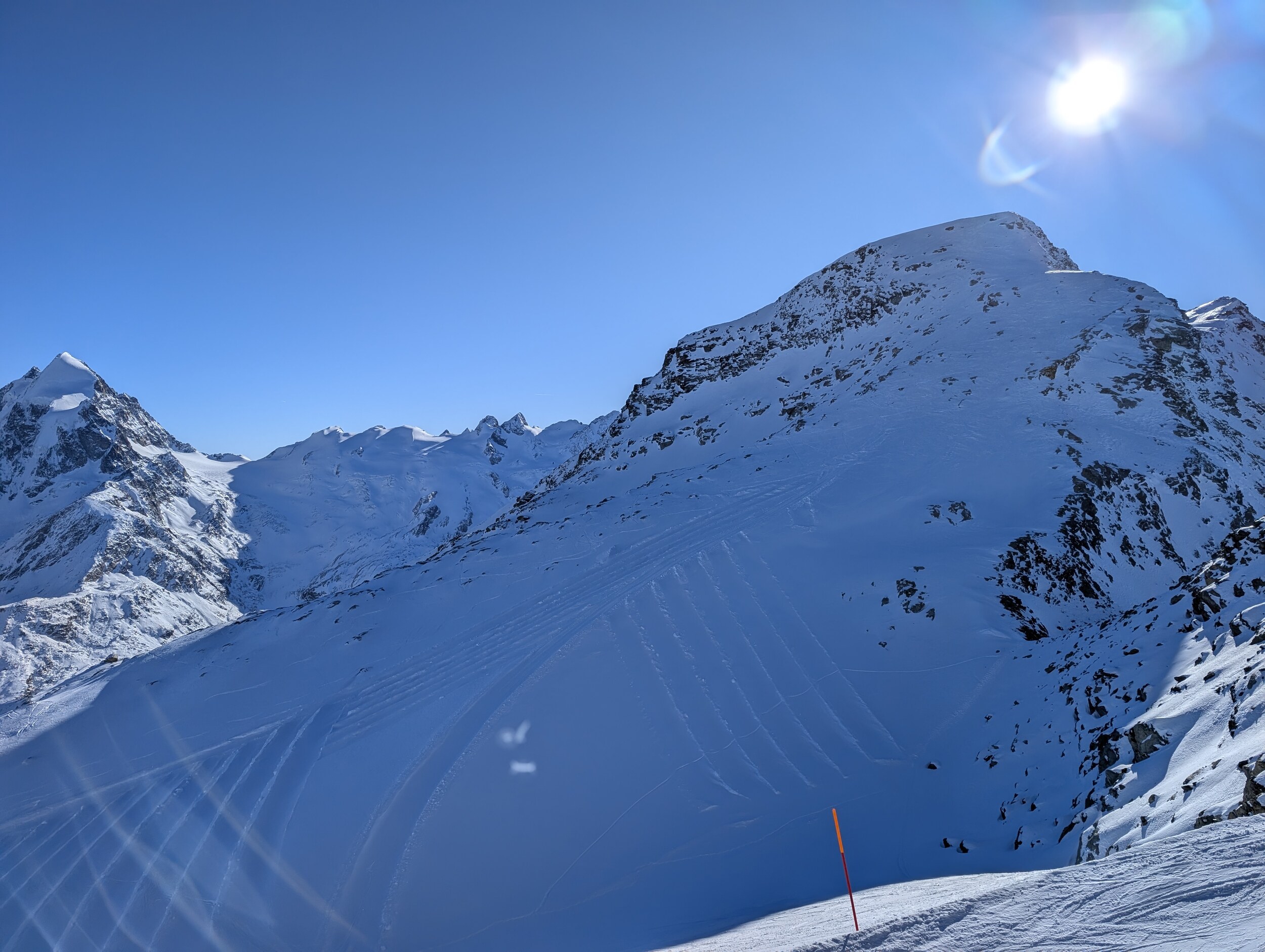 Corvatsch Gipfelblicke: Blick zur Corviglia: Der erste Hang ist absolut top. Dann hat es vereinzelt ziemliche Eisplatten. Am äusseren Rand fahren ist ein willkommener Tipp.