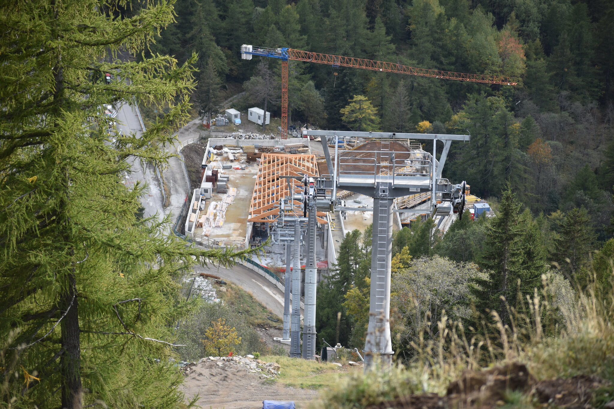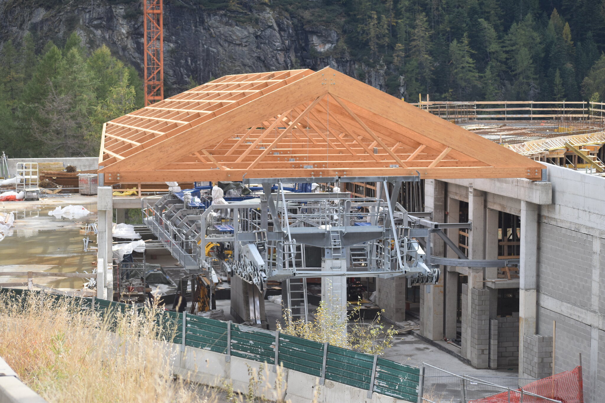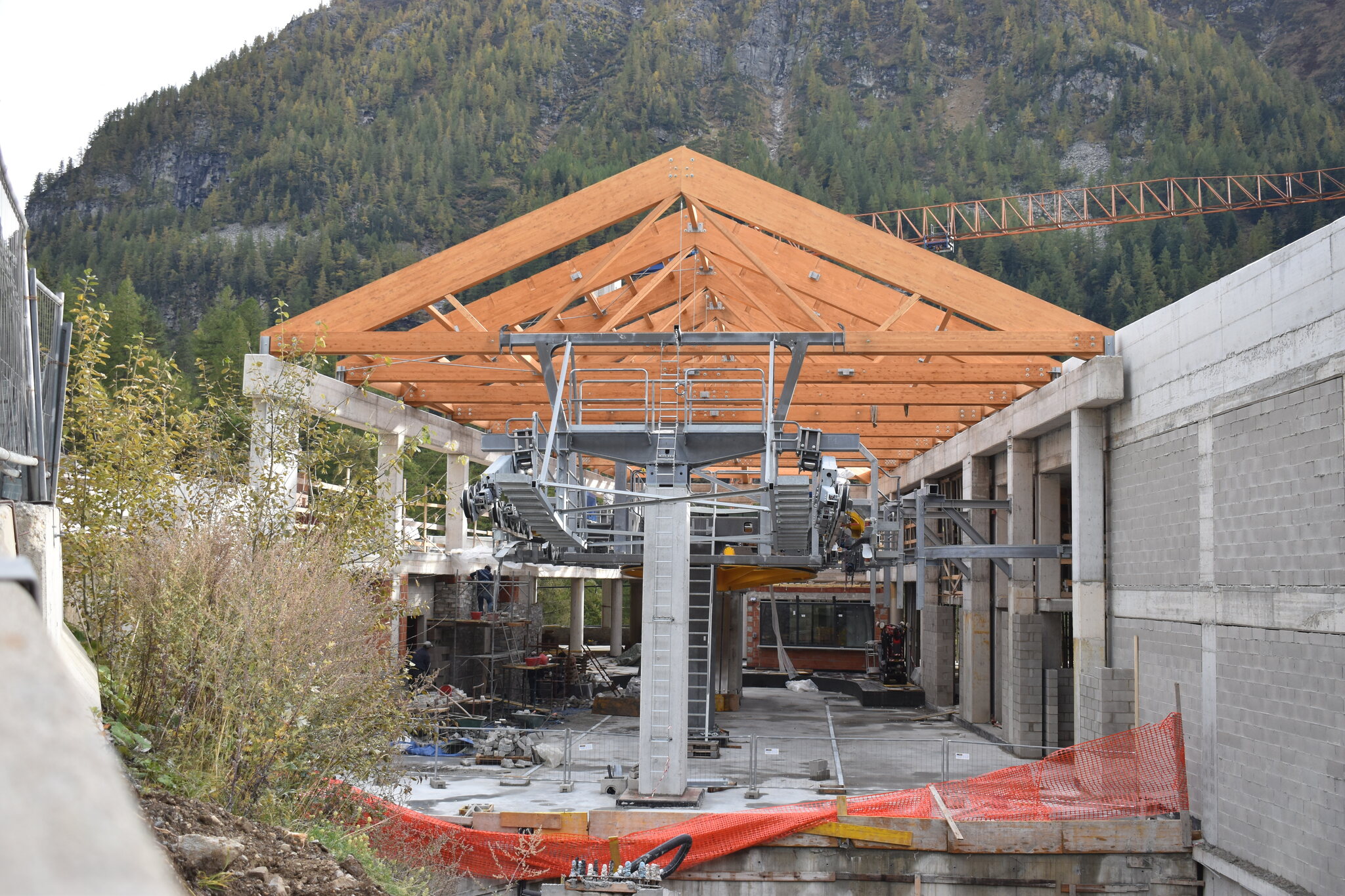 Ich war gestern auf der Baustelle. Im Tal ist seit den letzten Fotos nicht viel passiert, die Dachkonstruktion steht mittlerweile. Alle Stützen sind montiert. (oder fast, denn im Montageplatz beim Dorfeingang liegt noch ein einzelnes kurzes Rundrohrelement)