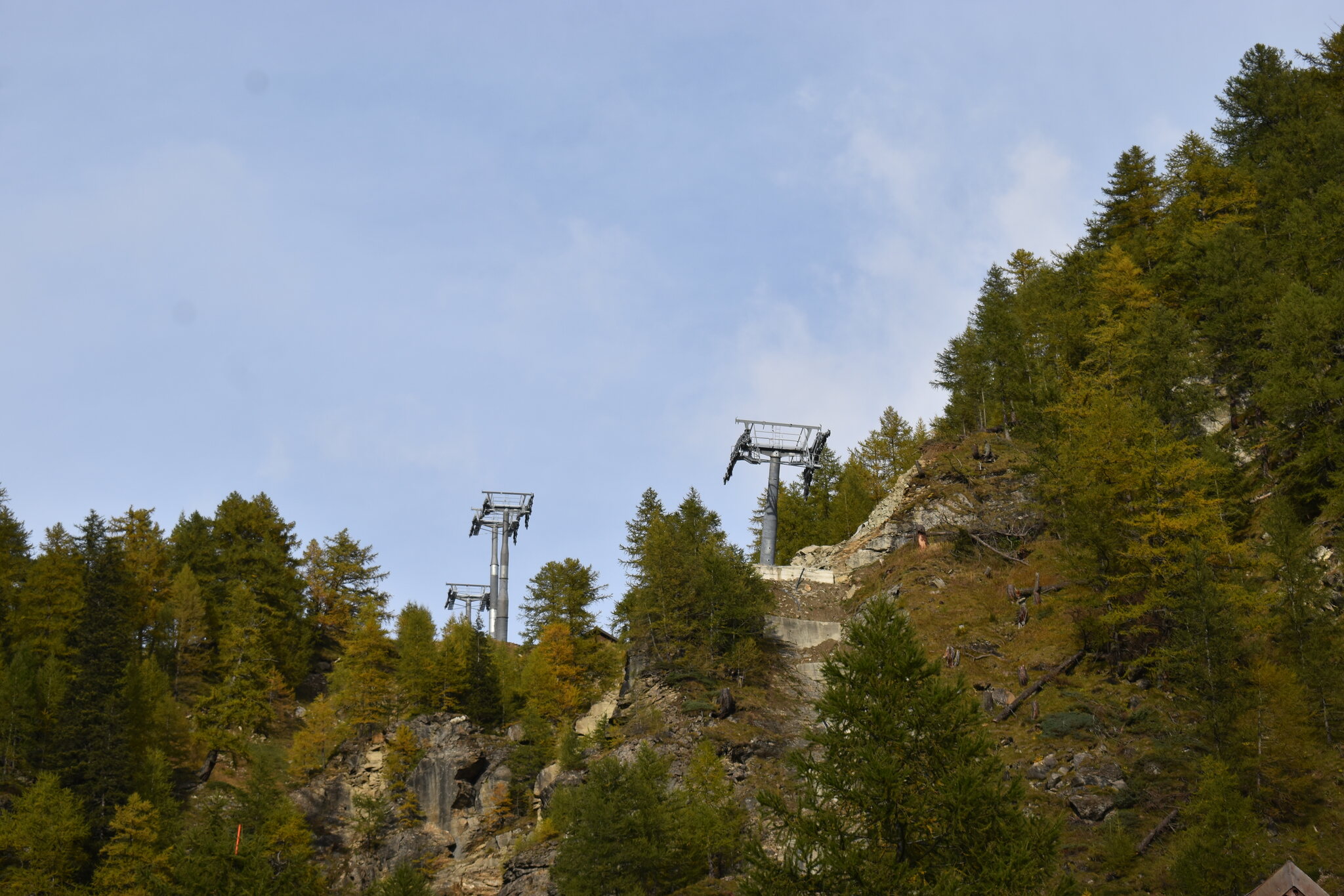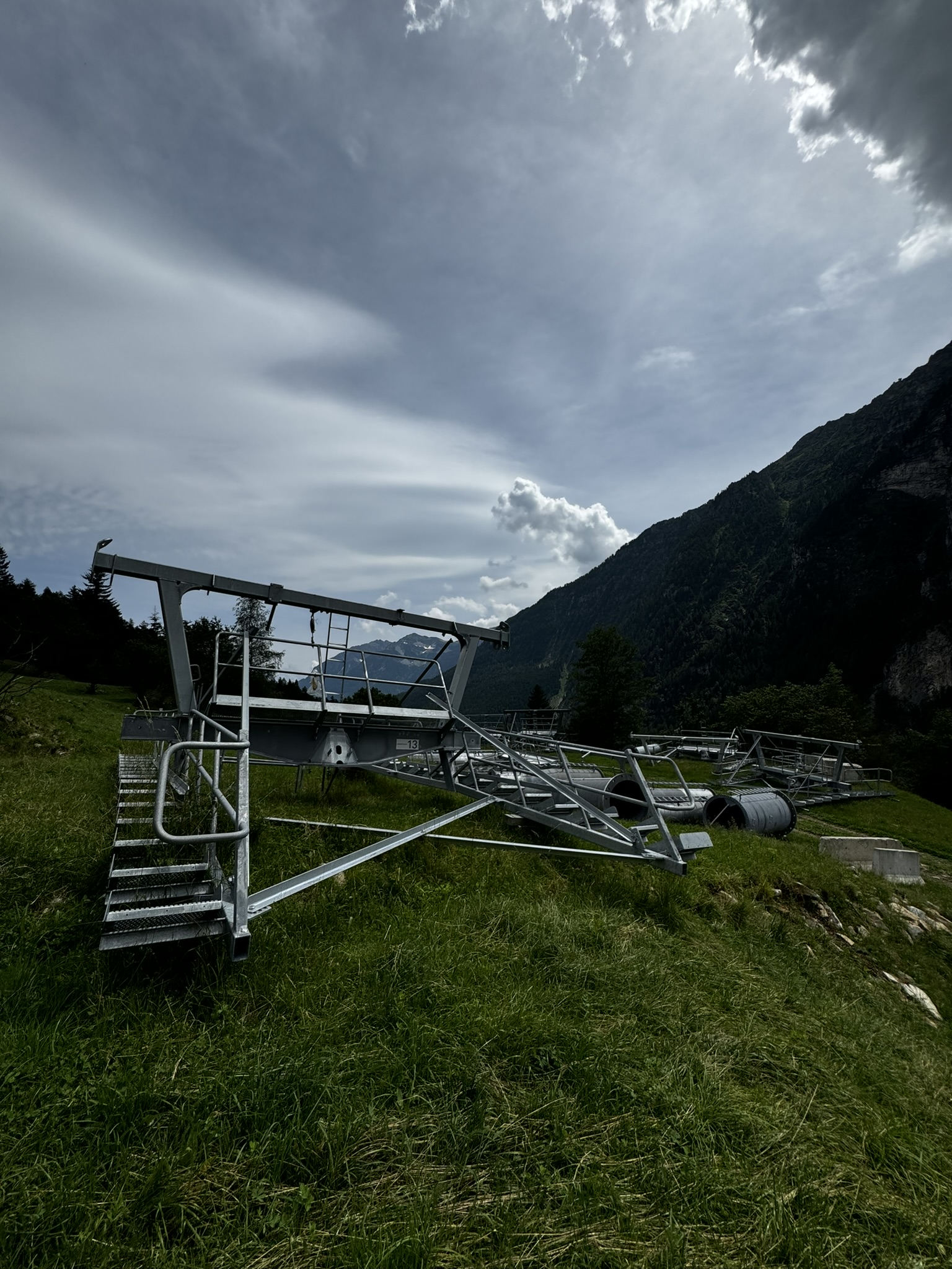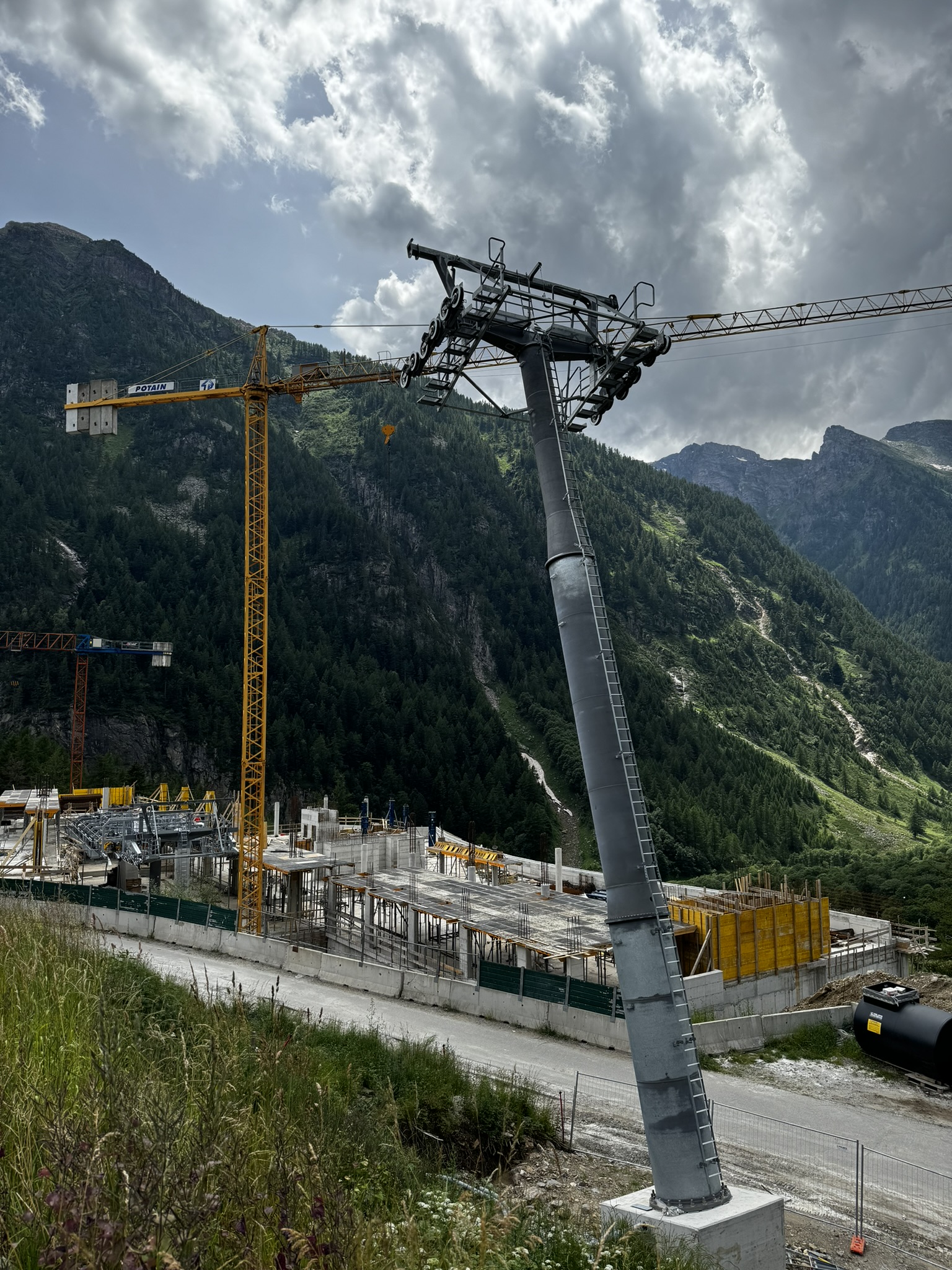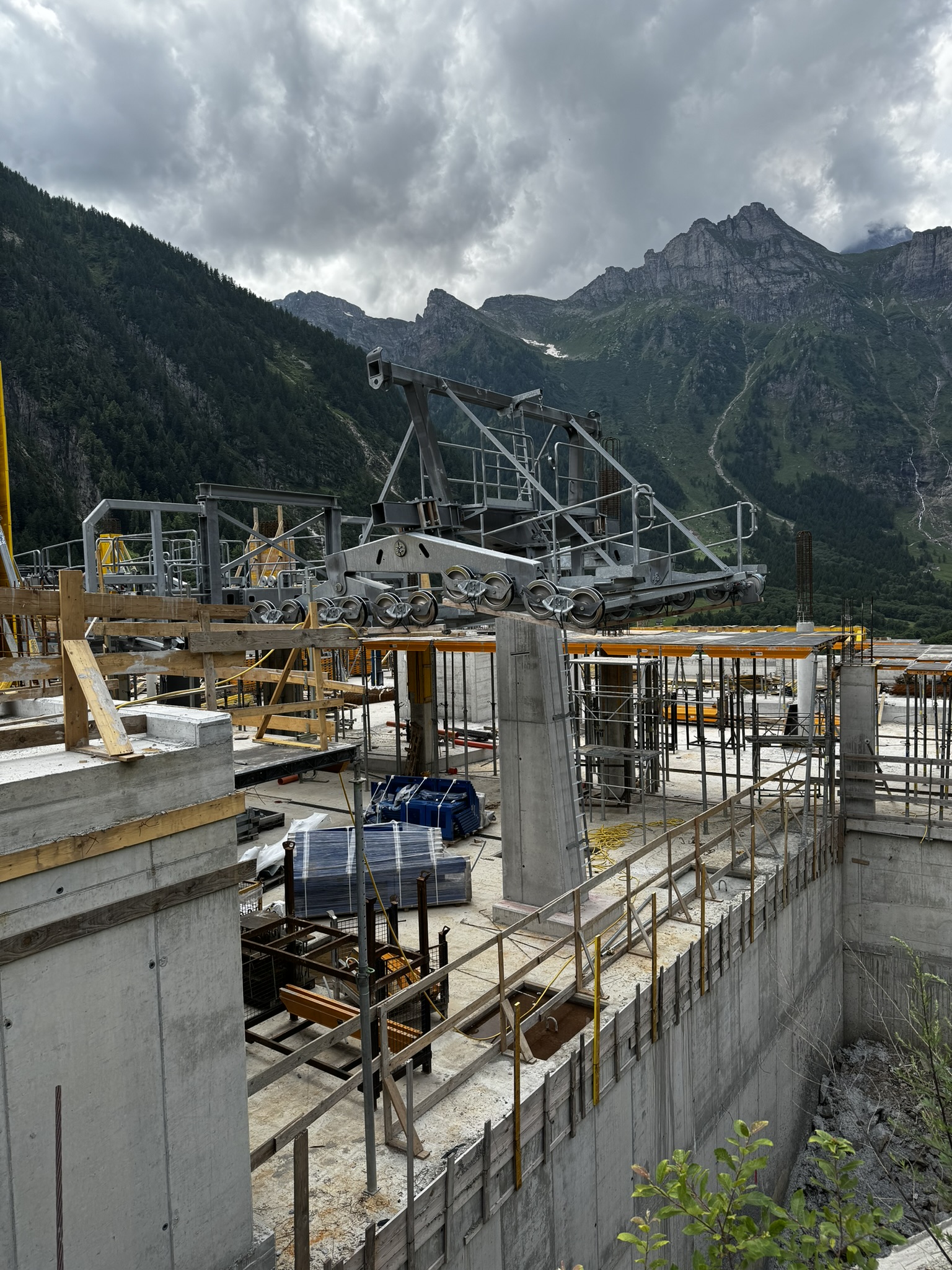 Ich war gestern auf der Baustelle. Im Tal ist seit den letzten Fotos nicht viel passiert, die Dachkonstruktion steht mittlerweile. Alle Stützen sind montiert. (oder fast, denn im Montageplatz beim Dorfeingang liegt noch ein einzelnes kurzes Rundrohrelement)