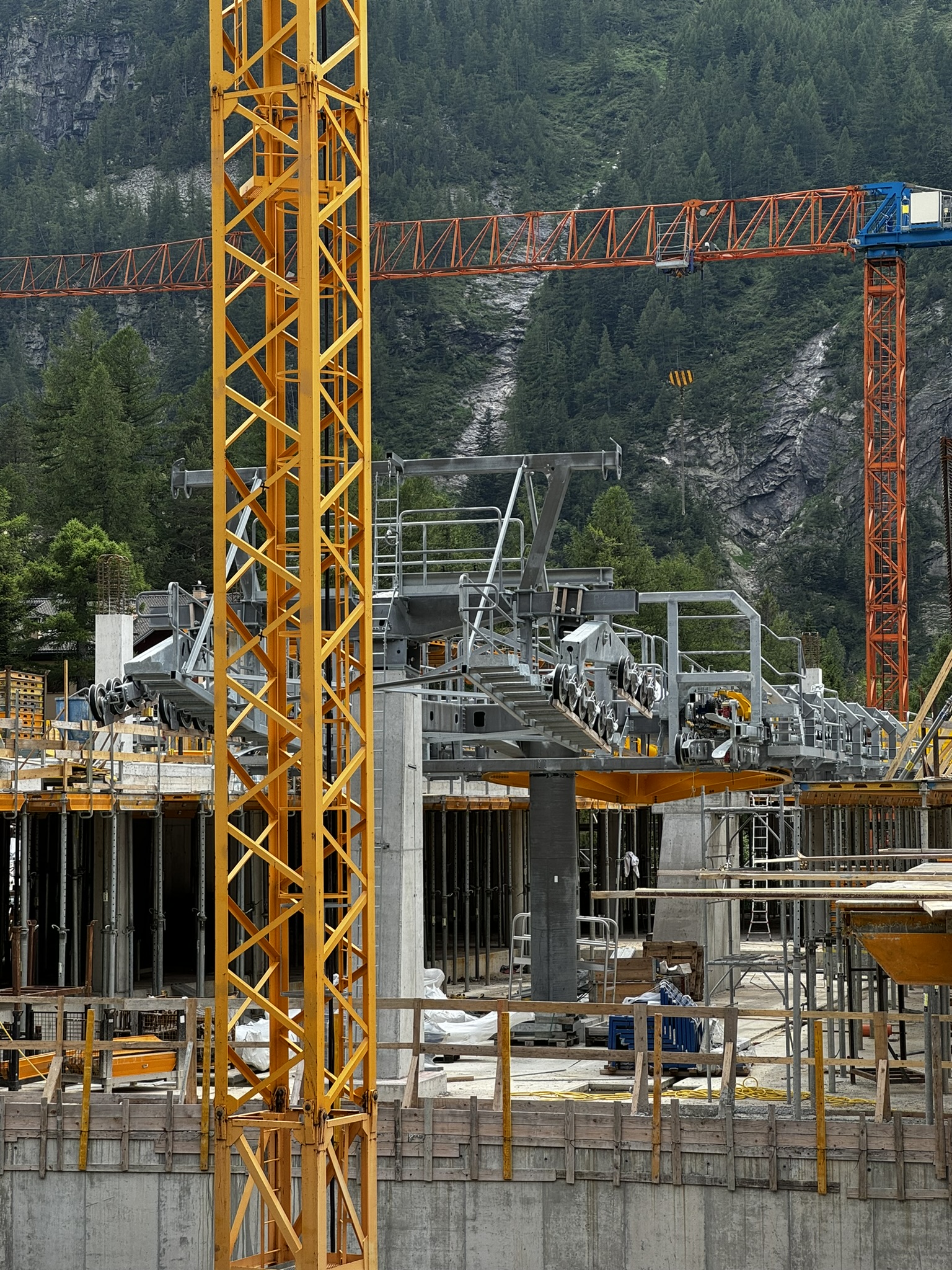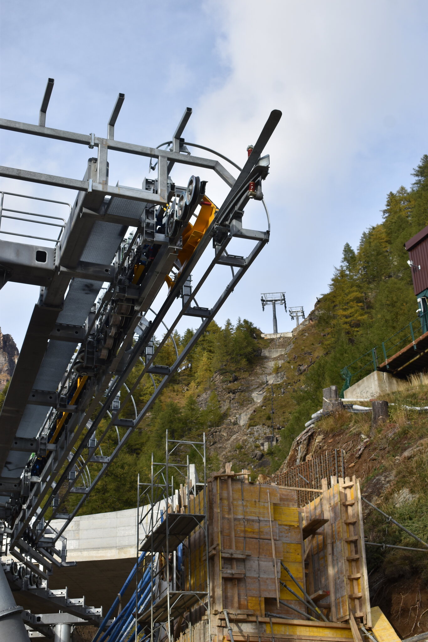 Dann bin ich zur Mittelstation hochgefahren. Dort siehts leider sehr bitter aus. Das Stationsgebäude ist im Rohbau. Die Technik unweit vorgeschritten. Es wurde jedoch (Obwohl Sonntag 17:30 Uhr) daran gearbeitet. Im Tal waren Arbeiter daran, die Natursteinverkleidung an der Station aufzukleben. An der Mittelstation waren Montageteams von Bartholet und Baumeister am Werk.