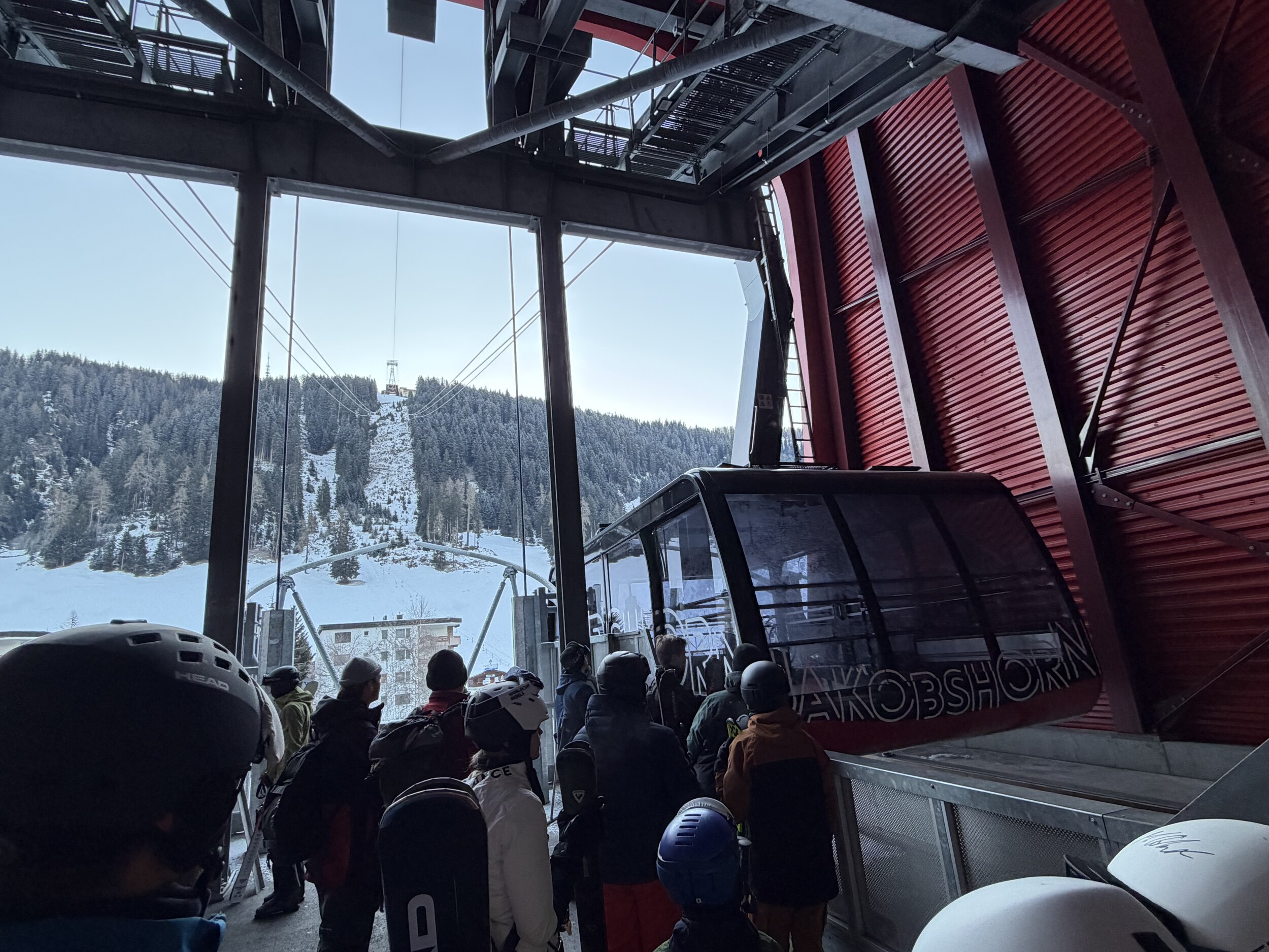 Jetzt um 14:40 (nach Spenglercup Final) hat es nur noch wenige Leute und wir warten 15 Minuten auf Abfahrt der Gondel unten....