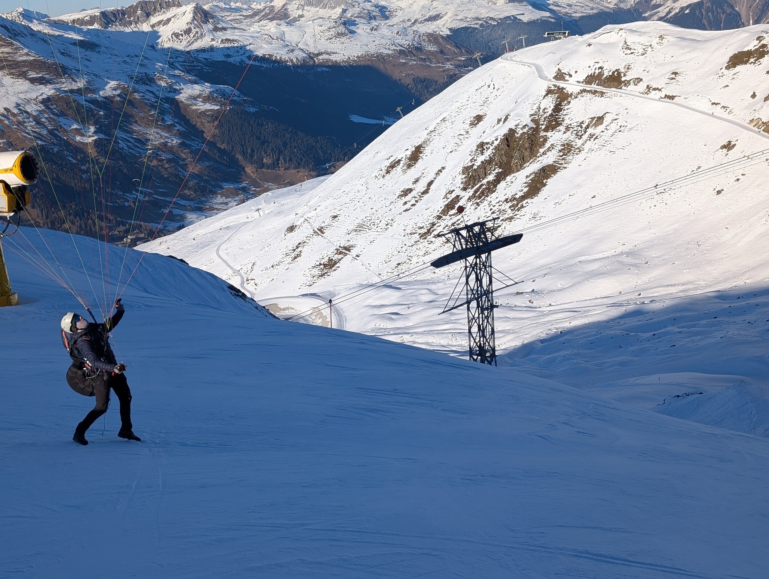 Blick von der EUB: Skischul-Run wird oben beschneit: Hauptertäli: Zuunterst die letzten paar Meter leider ein Minenfeld: Wow, sogar das Iglu-Resort haben sie hinbekommen: Die 24 wäre machbar: Die 21 am Anfang in voller Breite: Die Talabfahrt ist ebenso ein Traum, gemäss Talabfahrt-Racer viel besser als gestern als es eisig war.