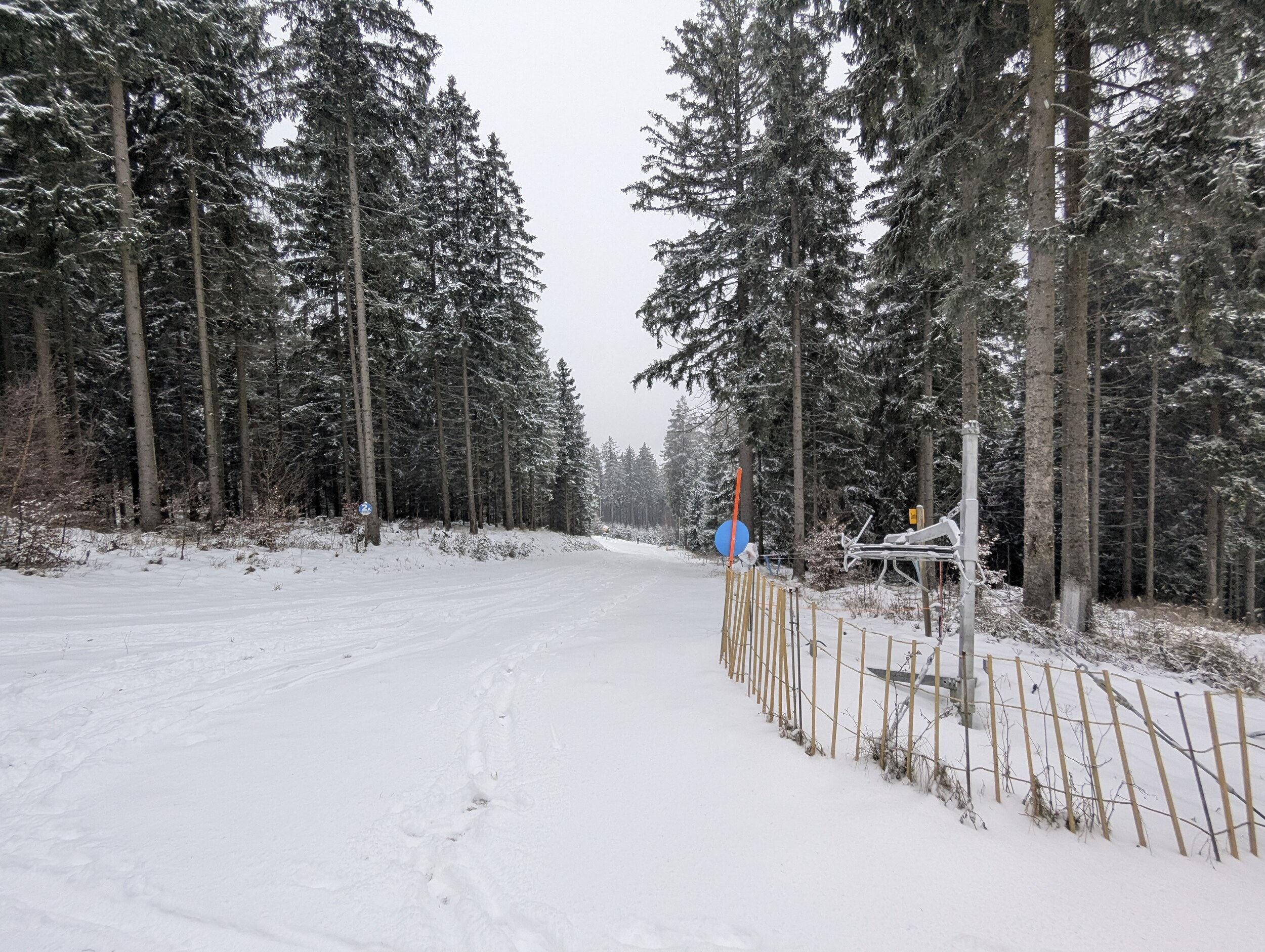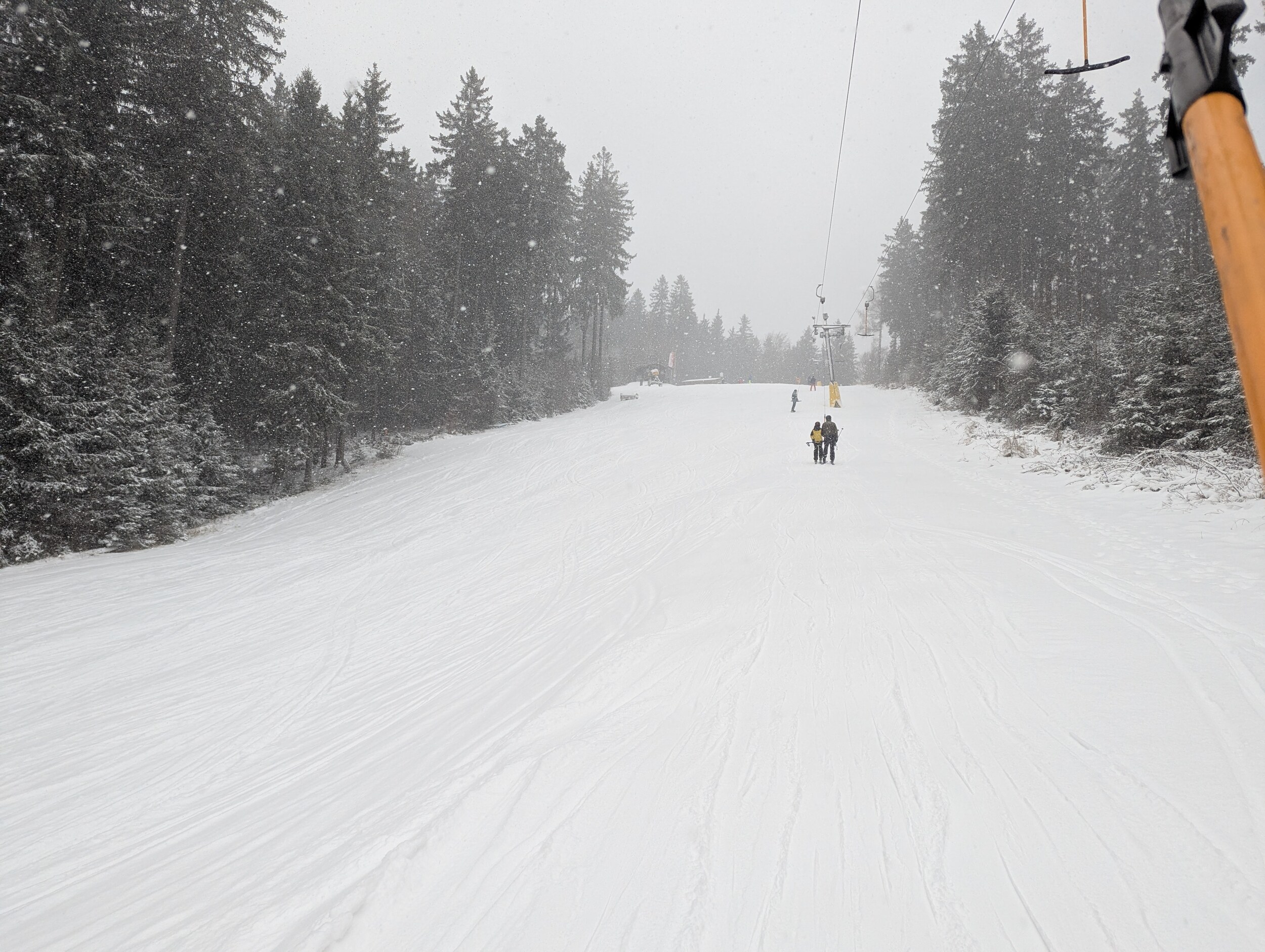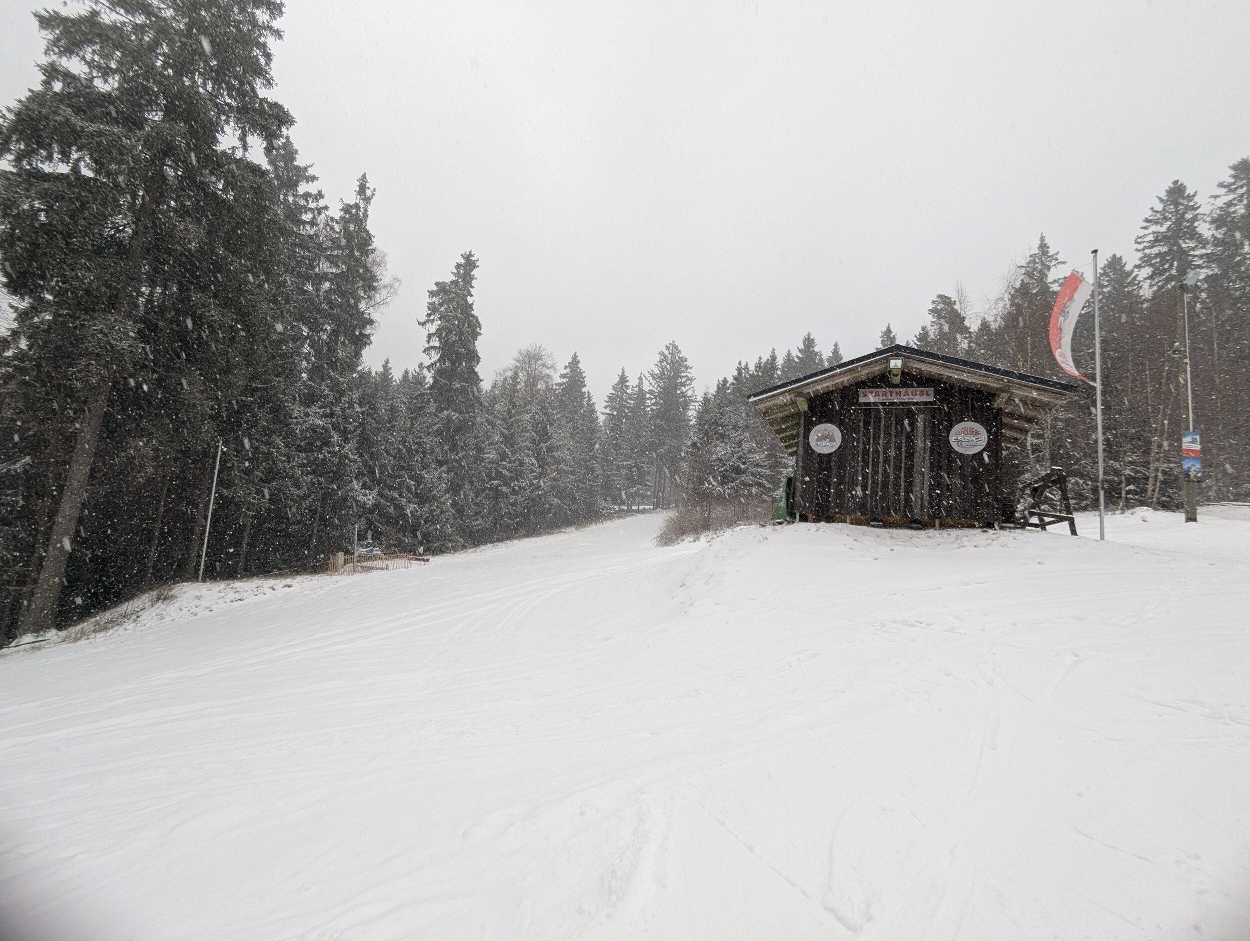 Offen ist aktuell nur die direkte Piste am Lift sowie der untere Übungslift als Zubringer vom Parkplatz. Die offene Piste ist beschneit und hatte ca. 5 cm Neuschnee oben drauf. Los war schon gut was aber mehr als 2 Bügel musste man nie warten.