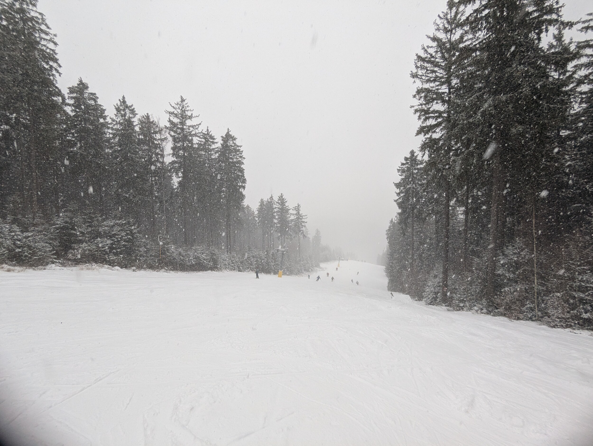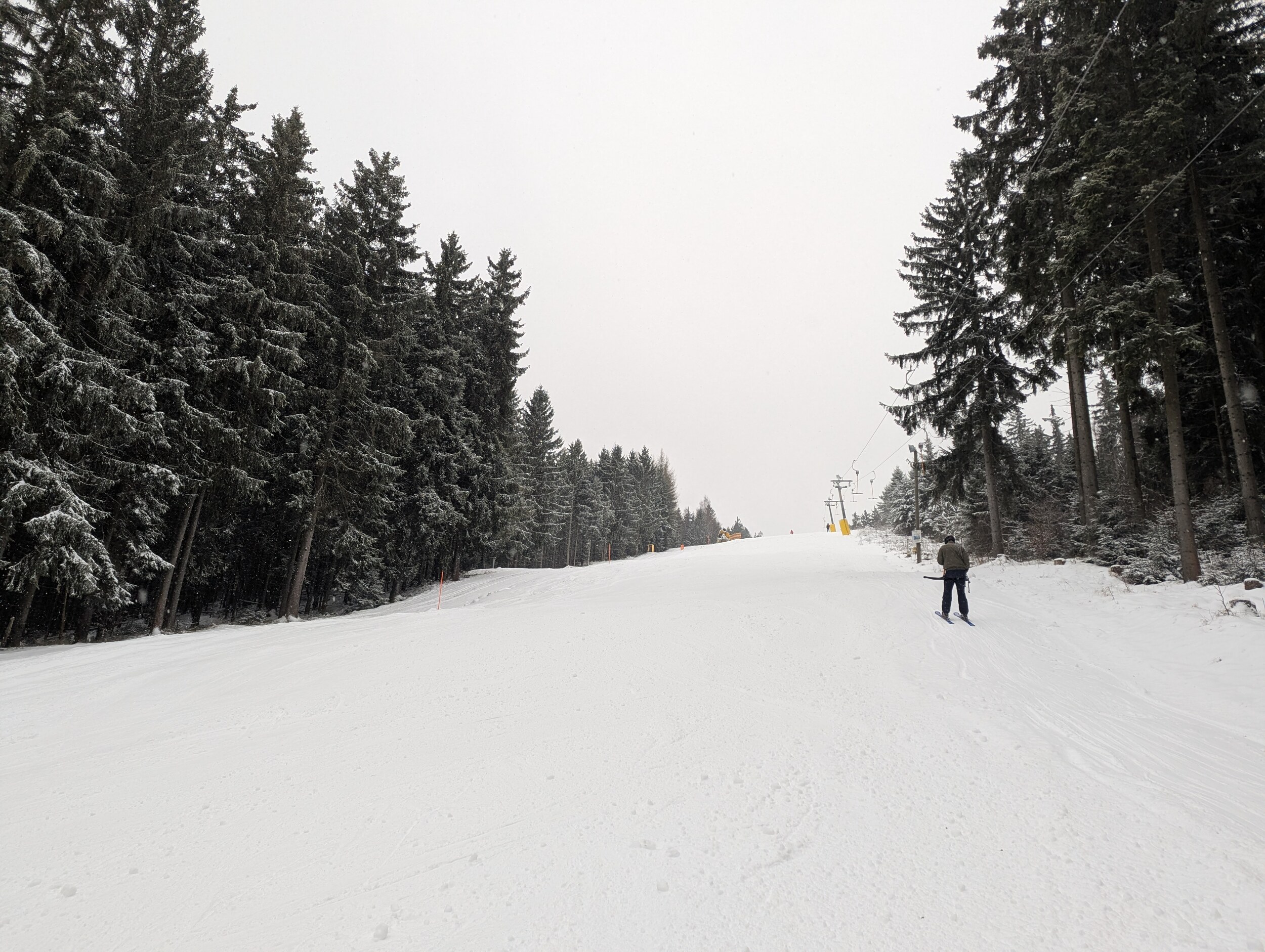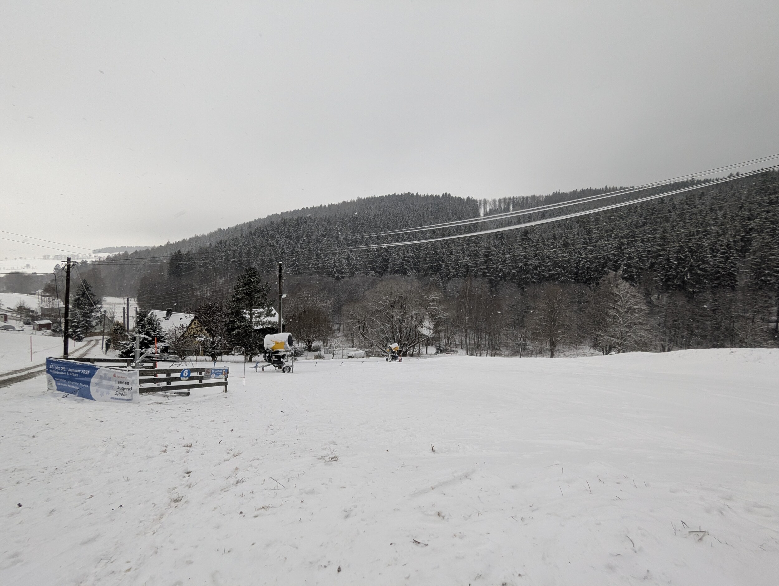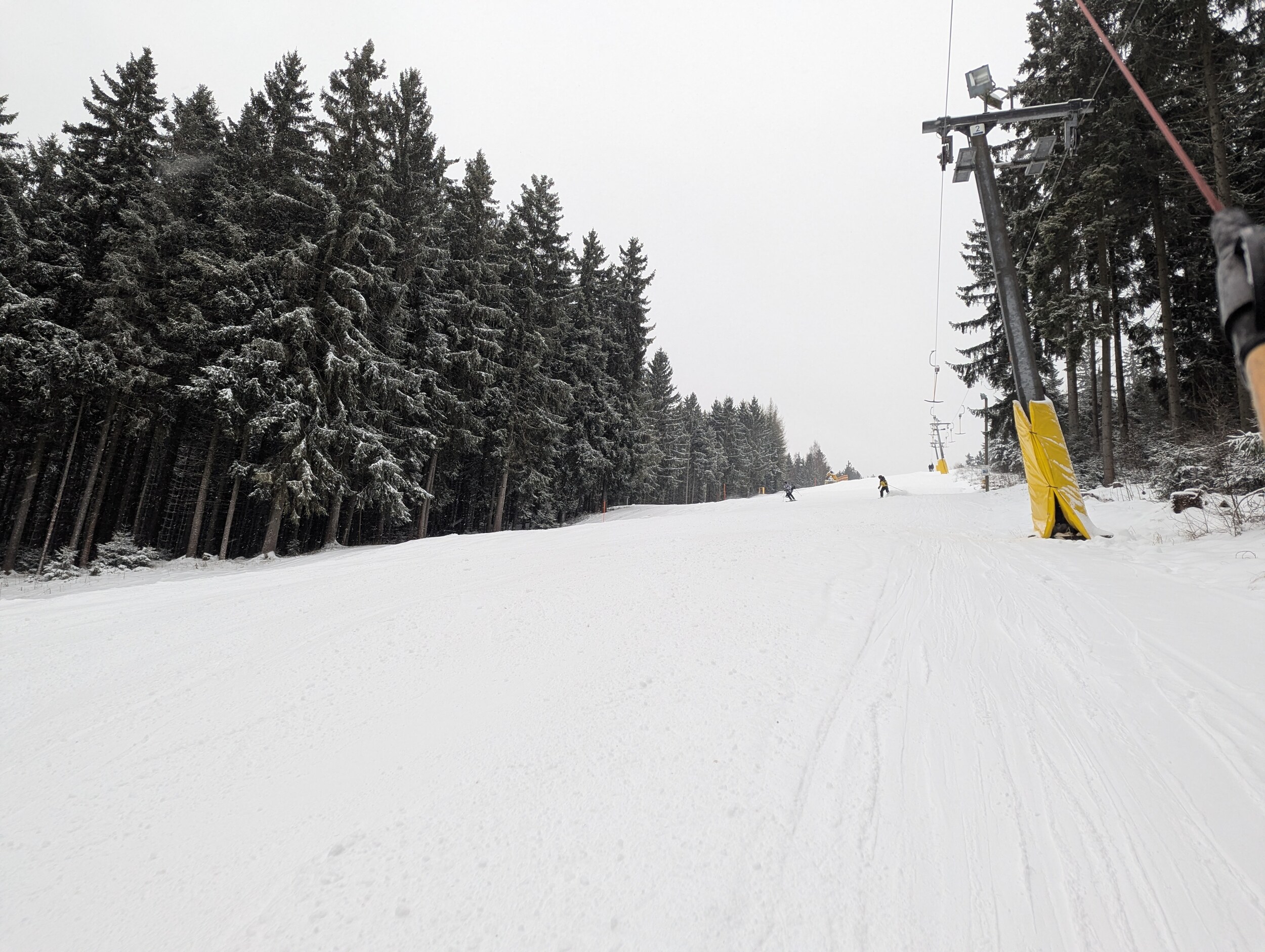 Die Piste war teils wie häufig an Tag 1 noch etwas unrund präpariert und ganz unten gab es etwas Beschneiungshügel. Durch den Neuschnee aber dennoch spaßig. Auf 10 m hatte es mal etwas Kiesel. Schön ist vor allem das die Piste doch für Mittelgebirge recht steil ist. Zudem kam beim Schneefall Winterstimmung endlich auf.