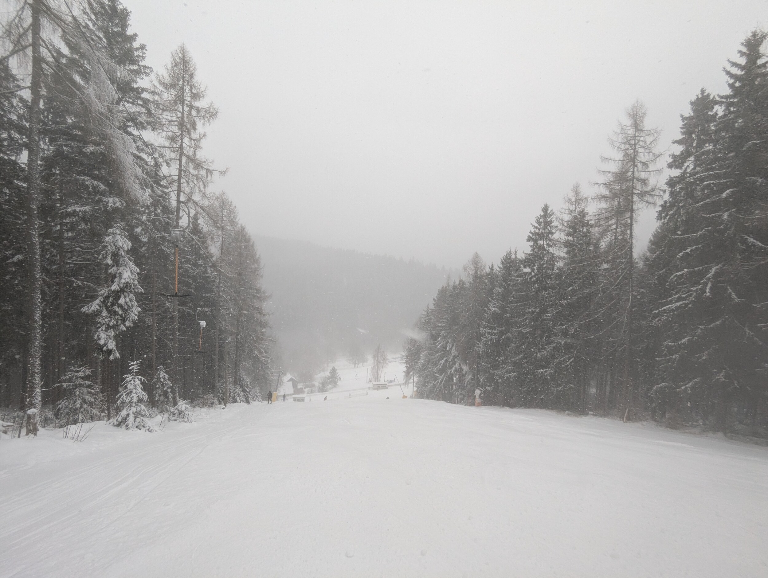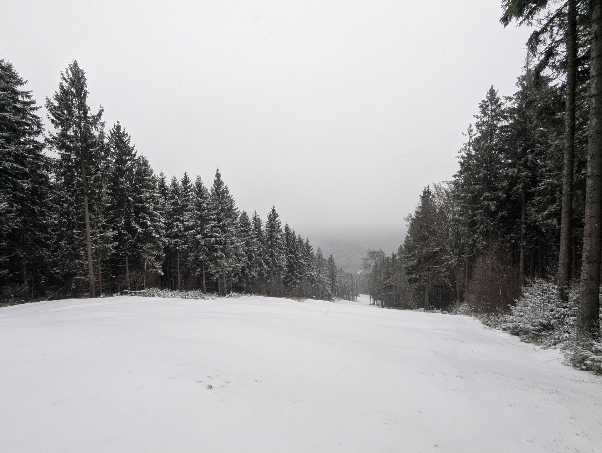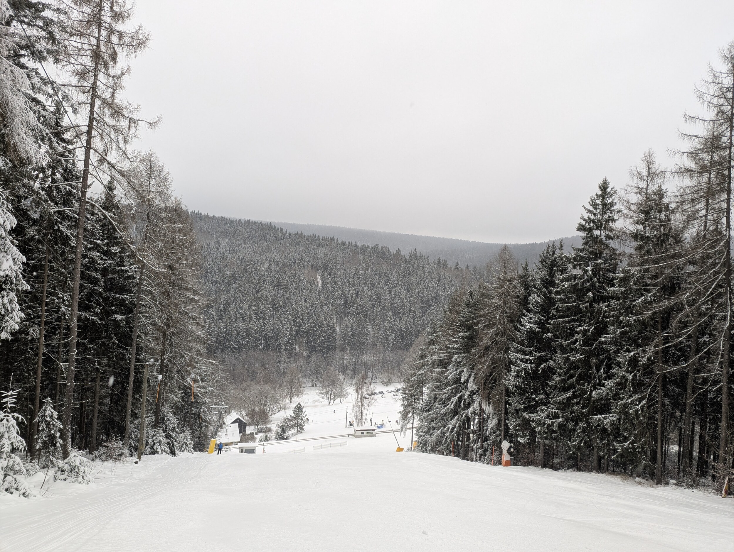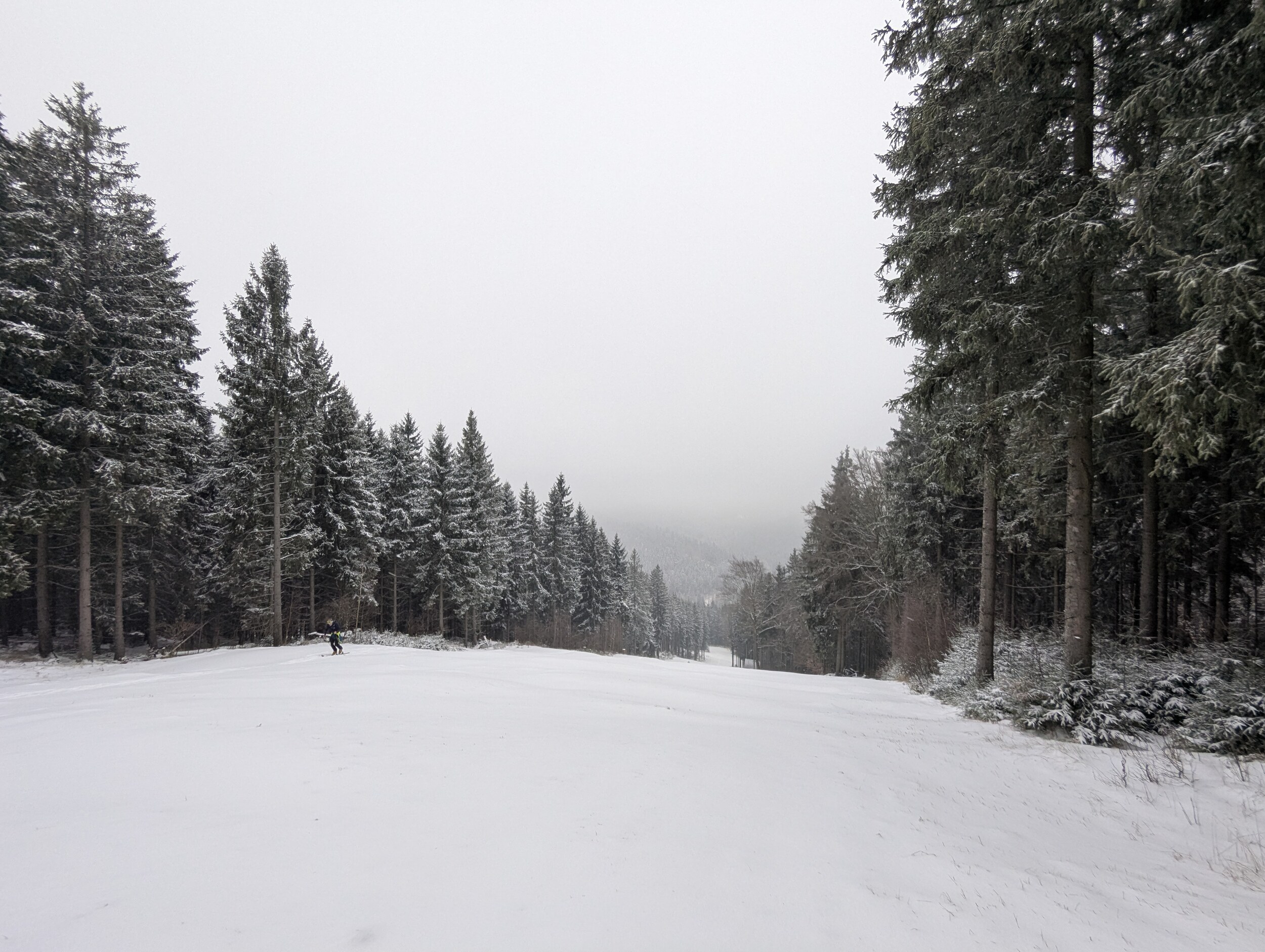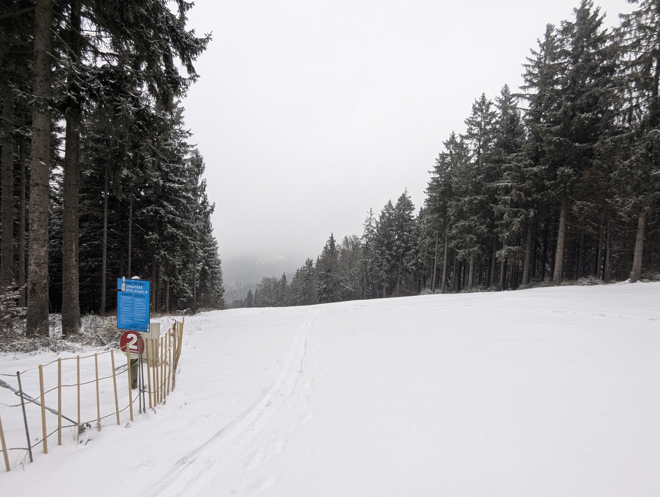 Die Piste war teils wie häufig an Tag 1 noch etwas unrund präpariert und ganz unten gab es etwas Beschneiungshügel. Durch den Neuschnee aber dennoch spaßig. Auf 10 m hatte es mal etwas Kiesel. Schön ist vor allem das die Piste doch für Mittelgebirge recht steil ist. Zudem kam beim Schneefall Winterstimmung endlich auf.