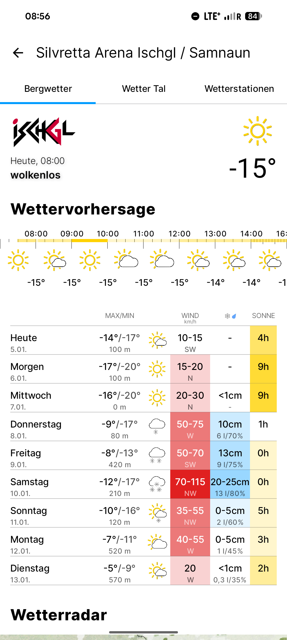 Die lange Wand hat aktuell ab ca. 10.45 Uhr Sonne, die 33/38 auch, die 40 etwa 11.15 Uhr. Etwa gleichzeitig auch die Pisten um die Idalp.