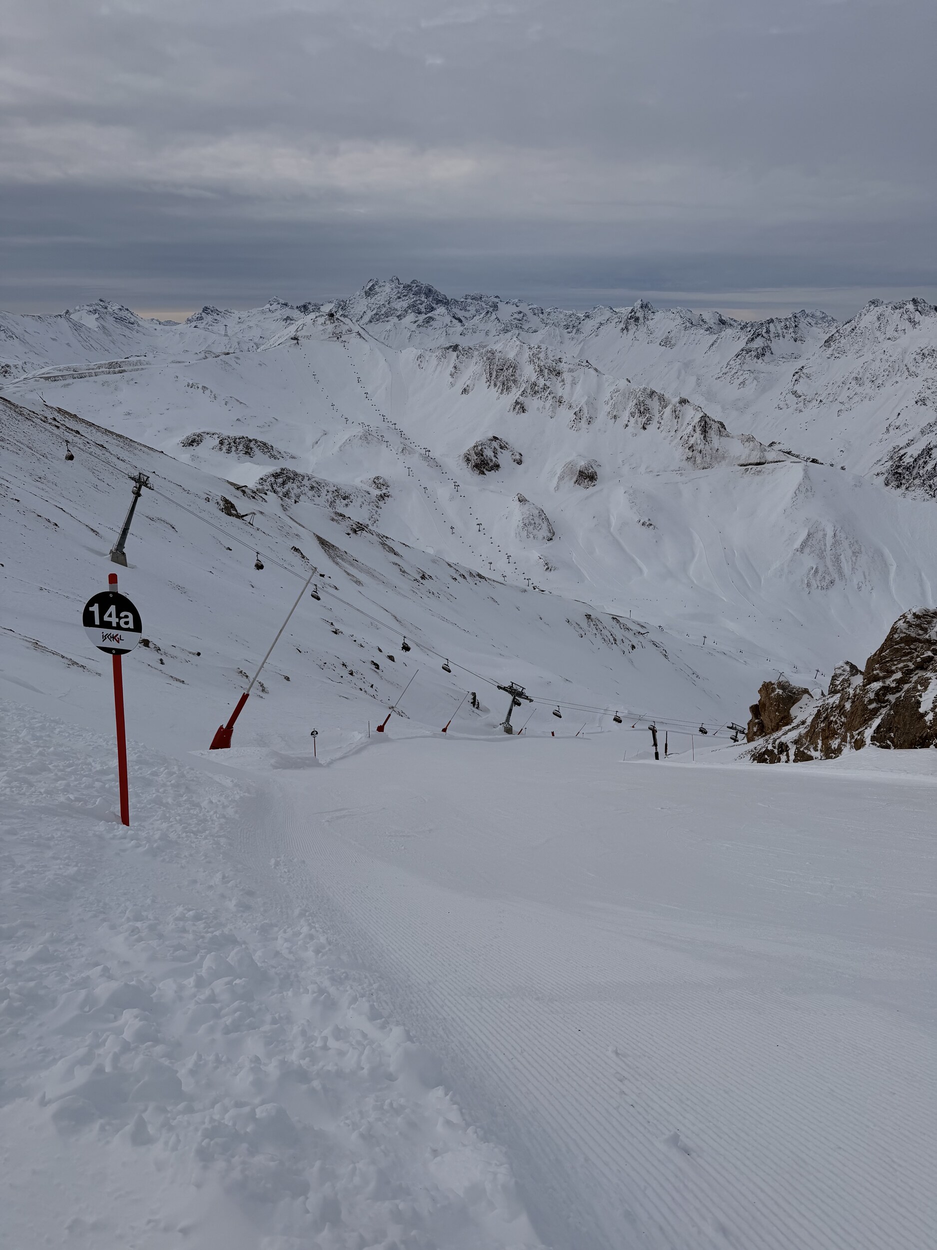 Da es bei antizyklischer Pistenwahl ratsam ist, die Lifte von und zur Idalp + Höllkarbahn zu meiden, bietet sich sich vom Höllboden-Gebiet aus auch die Lange Wandbahn an. Eigentlich DIE zentrale Verbindungsbahn. Von oben kann man dann z.B. auch mit der 14b, 15 oder der 12 (die 13 ist ja noch geschlossen) die 14A vorbereiten. Deren 'Problem' ist aber weniger ihre Steilheit: man kann halt von oben bis ganz nach unten schauen.