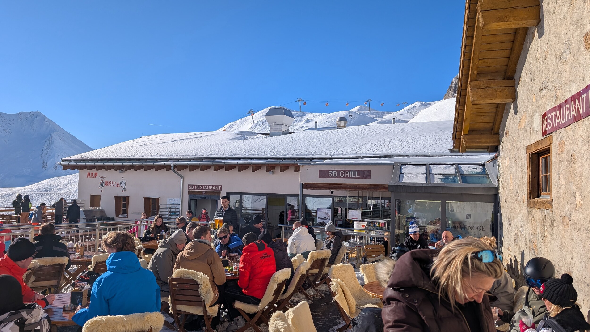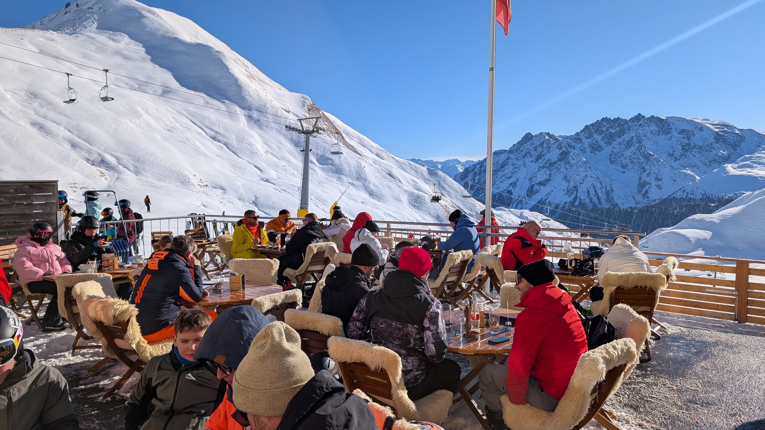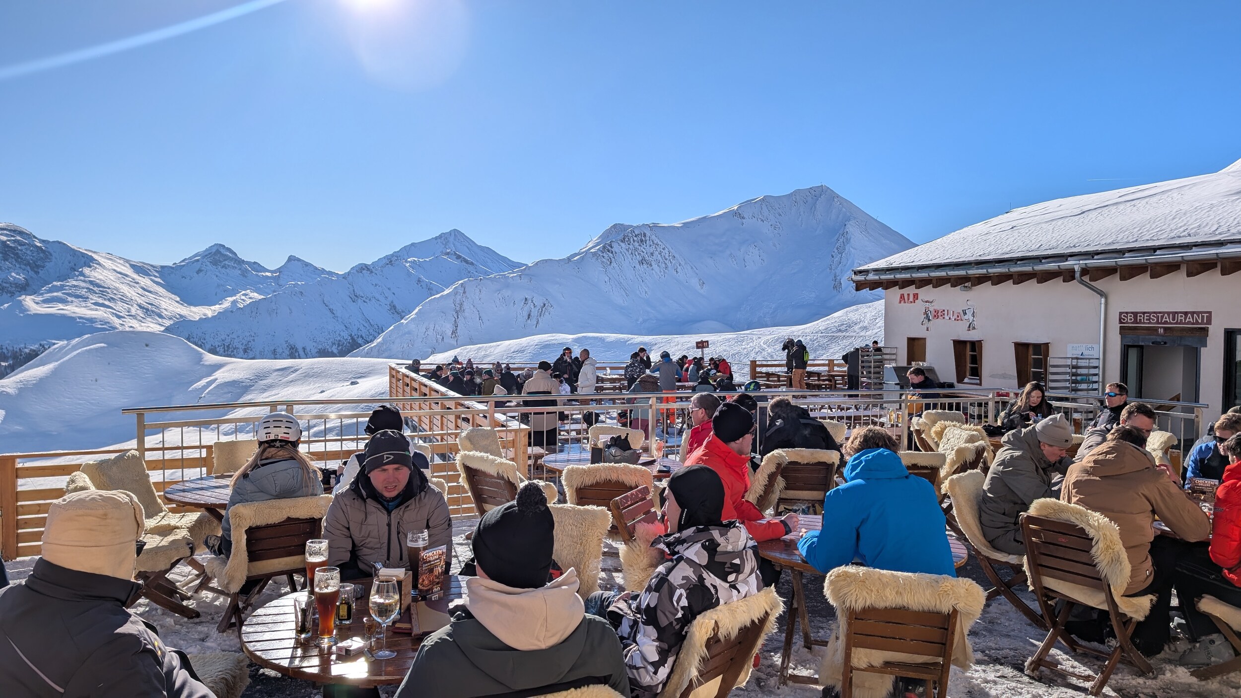 Wir hatten gestern unseren ersten Tag auf der Piste. Gegessen haben wir auf der schweizer Seite in der Alp Bella.