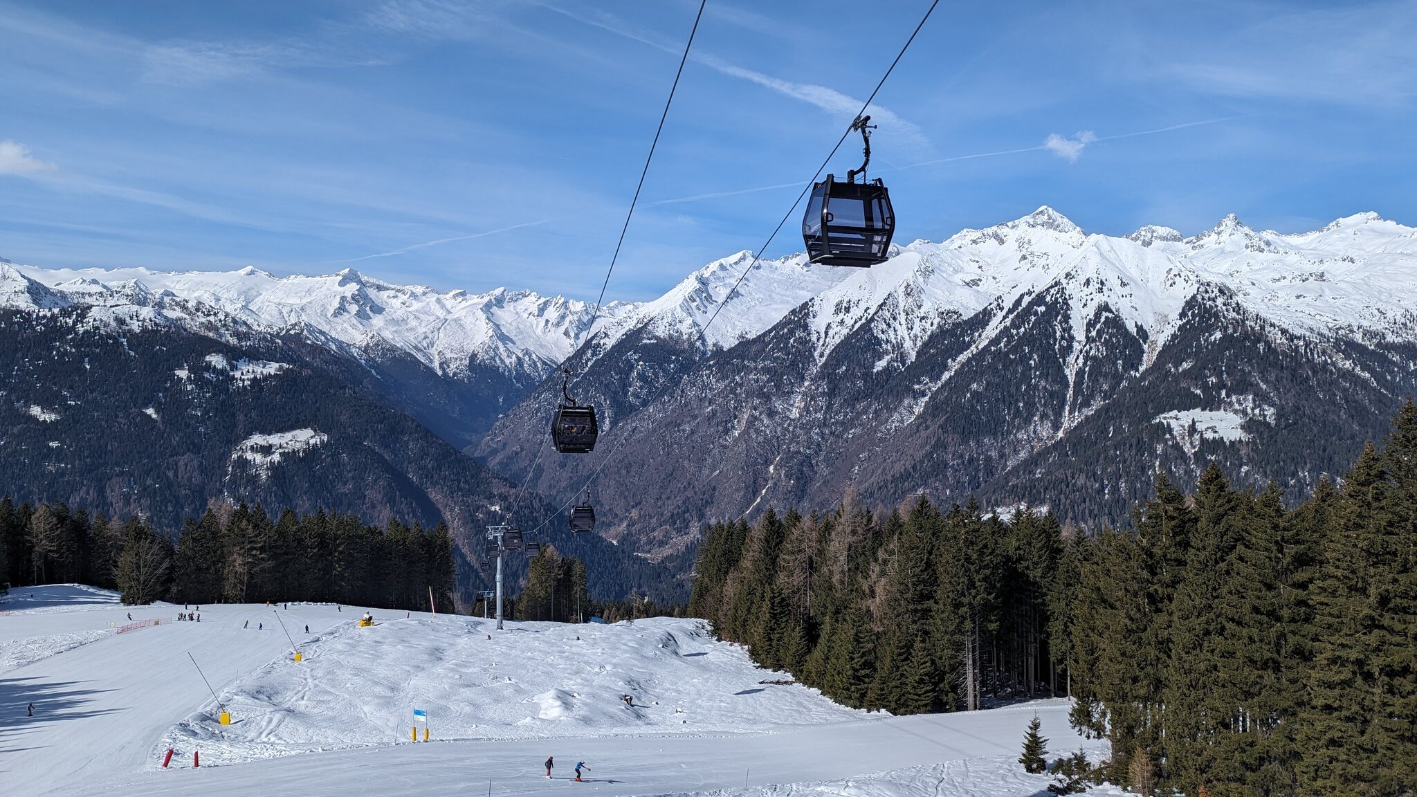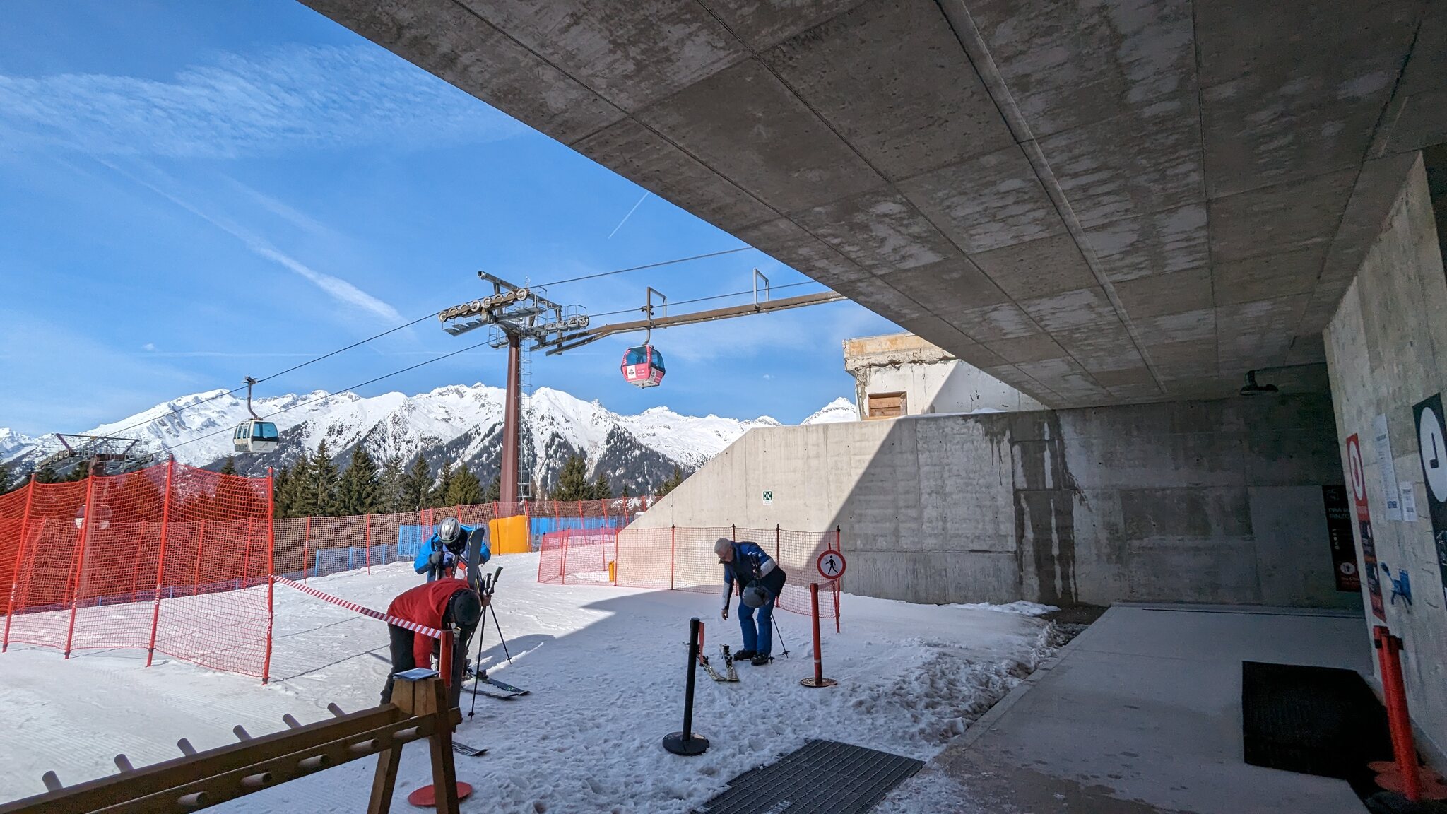 Gelungene neue Doss del Sabion Gondelbahn, schade aber dass man von der Gondelbahn aus Pinzol entweder für ein kurzes Stück Skier anschnallen muss oder eine Stein Treppe herunter laufen muss.