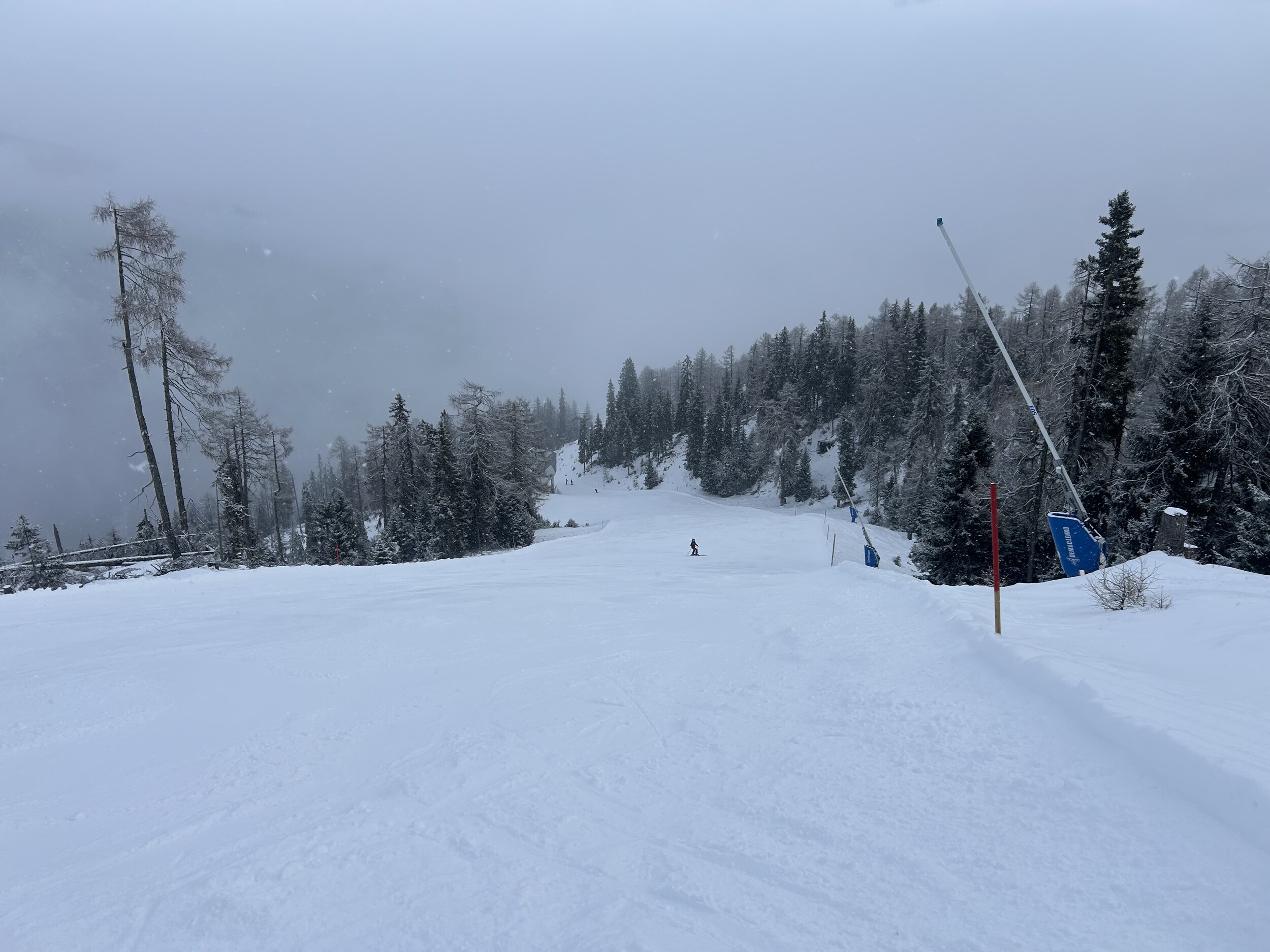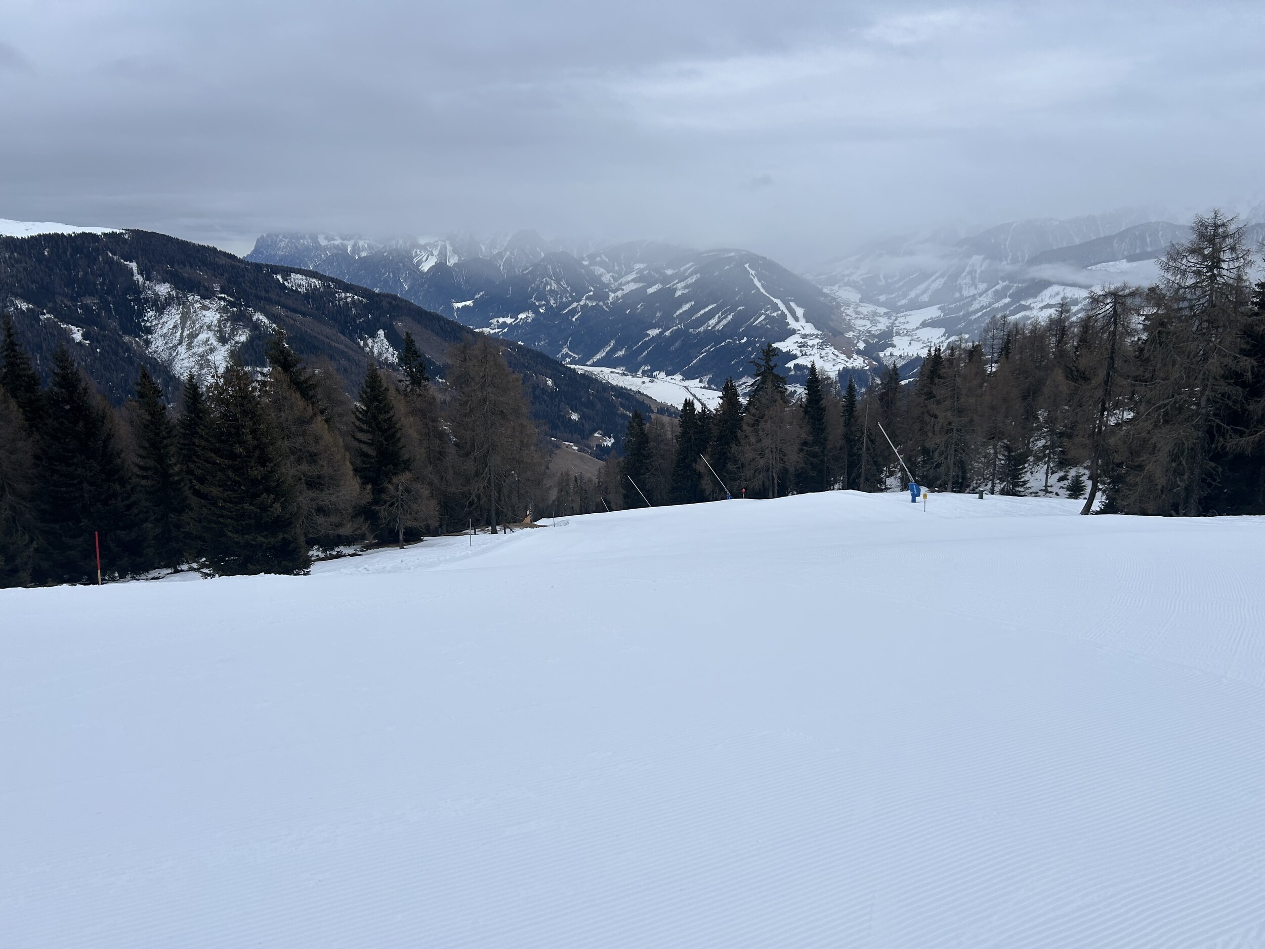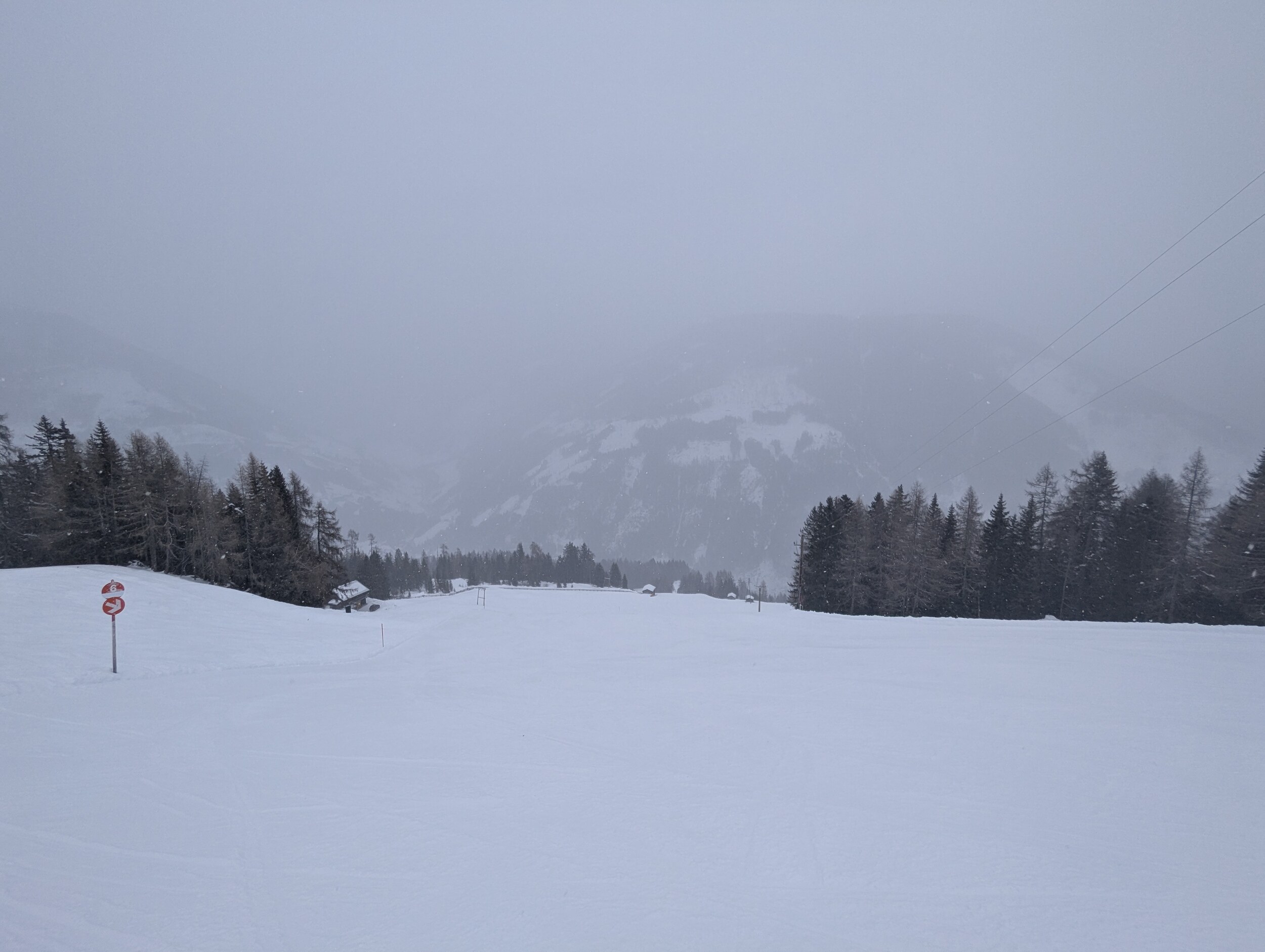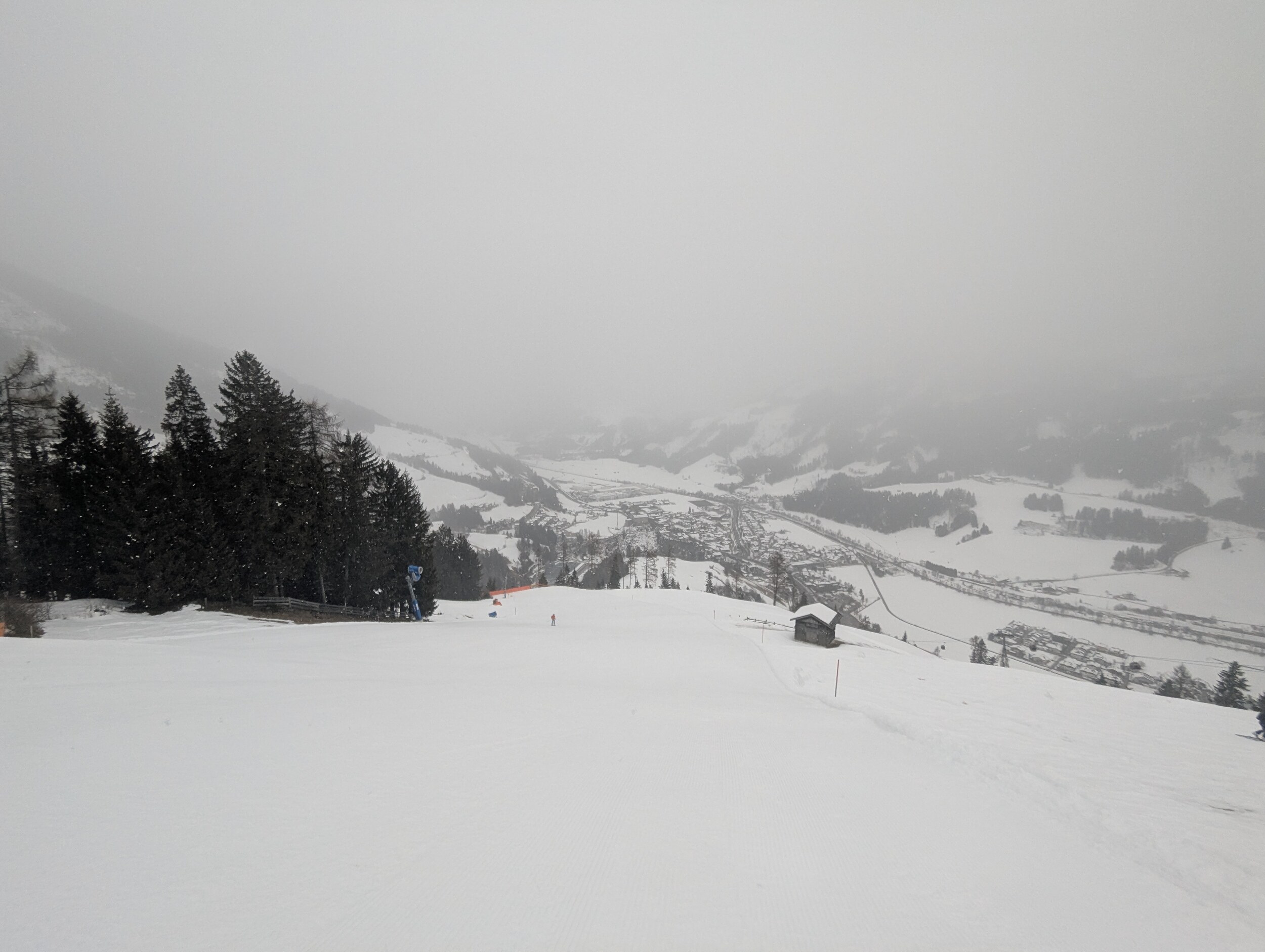 Guten Morgen aus Silian, heute Schlechtwettertag mit aufziehender Front, am Morgen aber noch kein Neuschnee auf der Piste. Wolkenbasis aber nun absinkend und es flöckelt leicht.