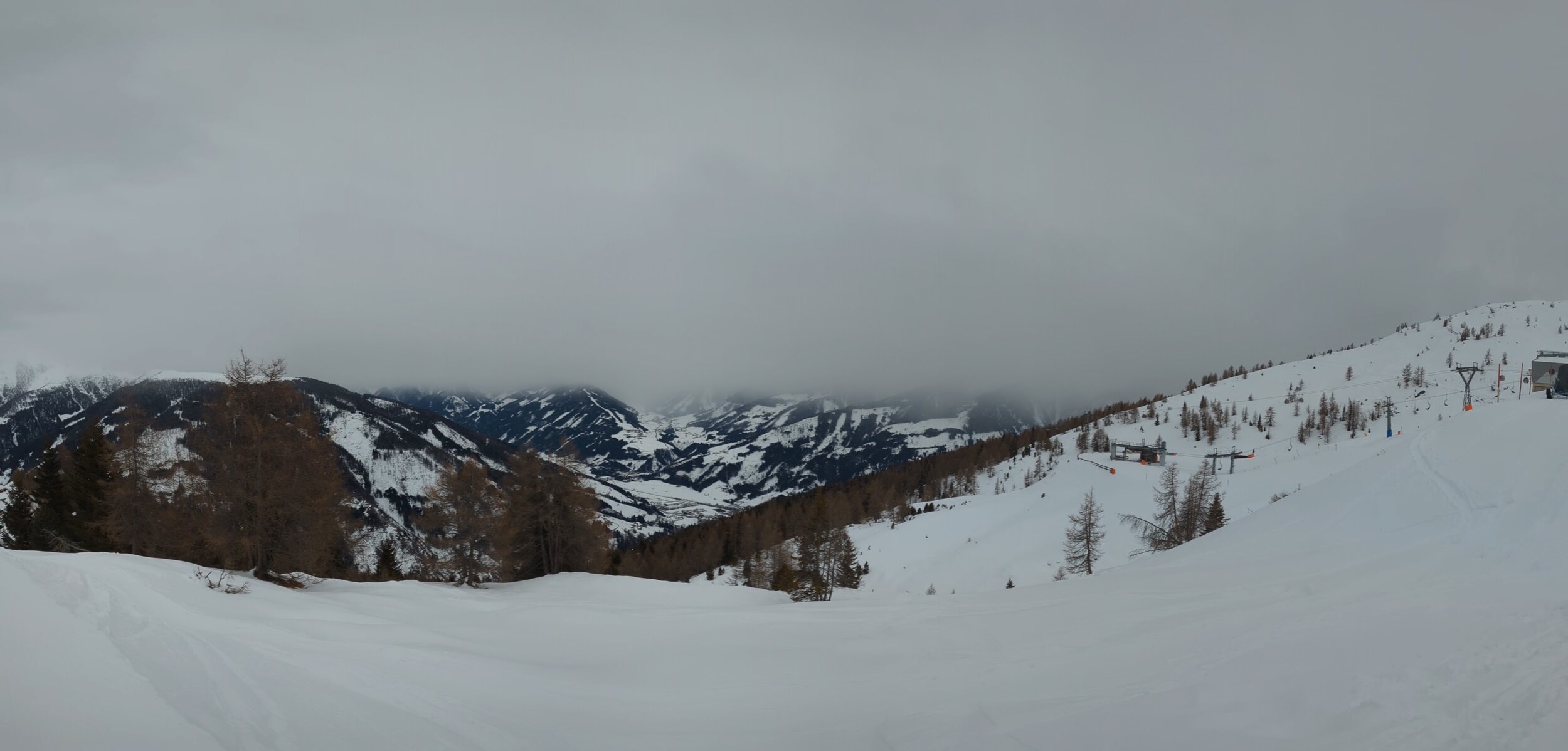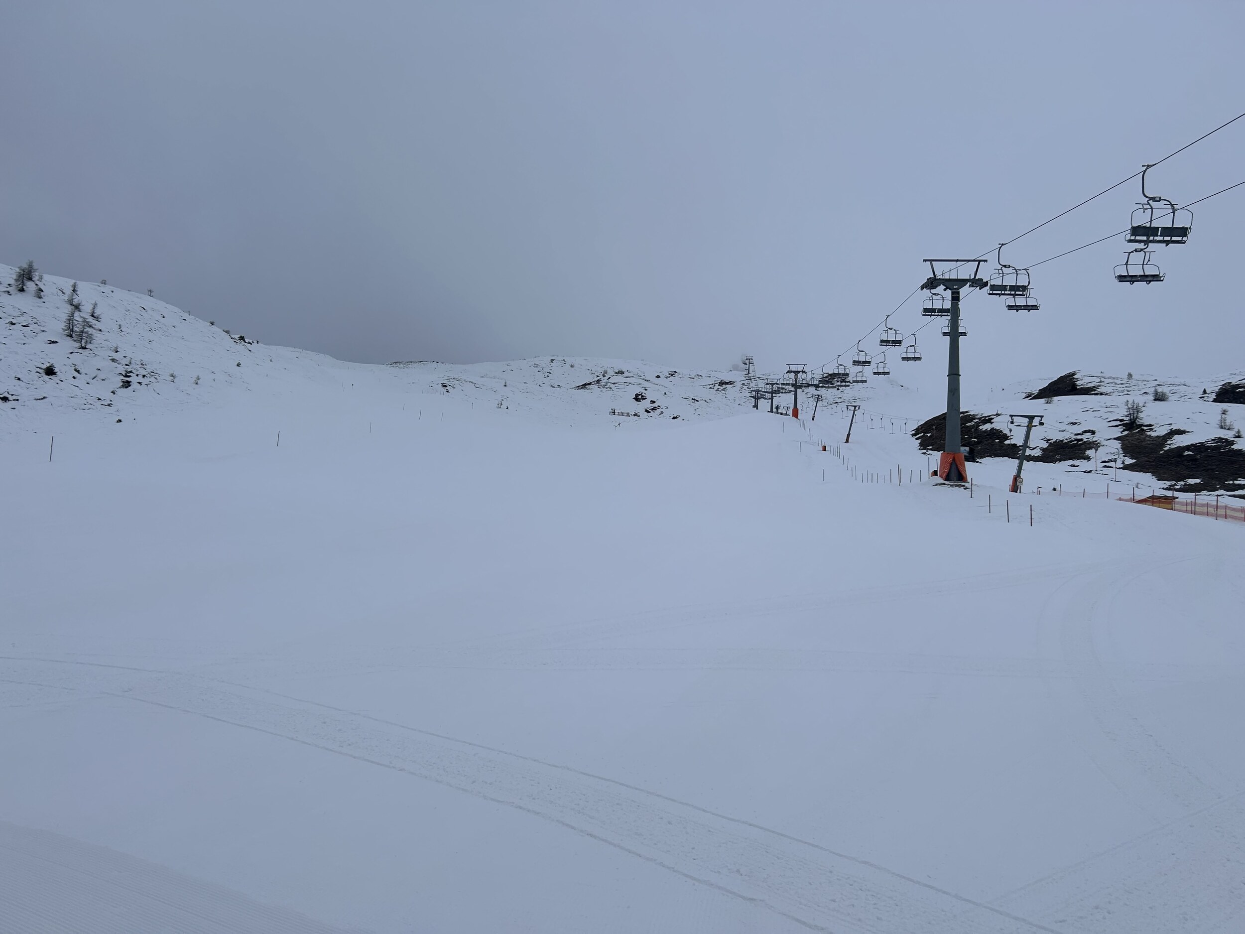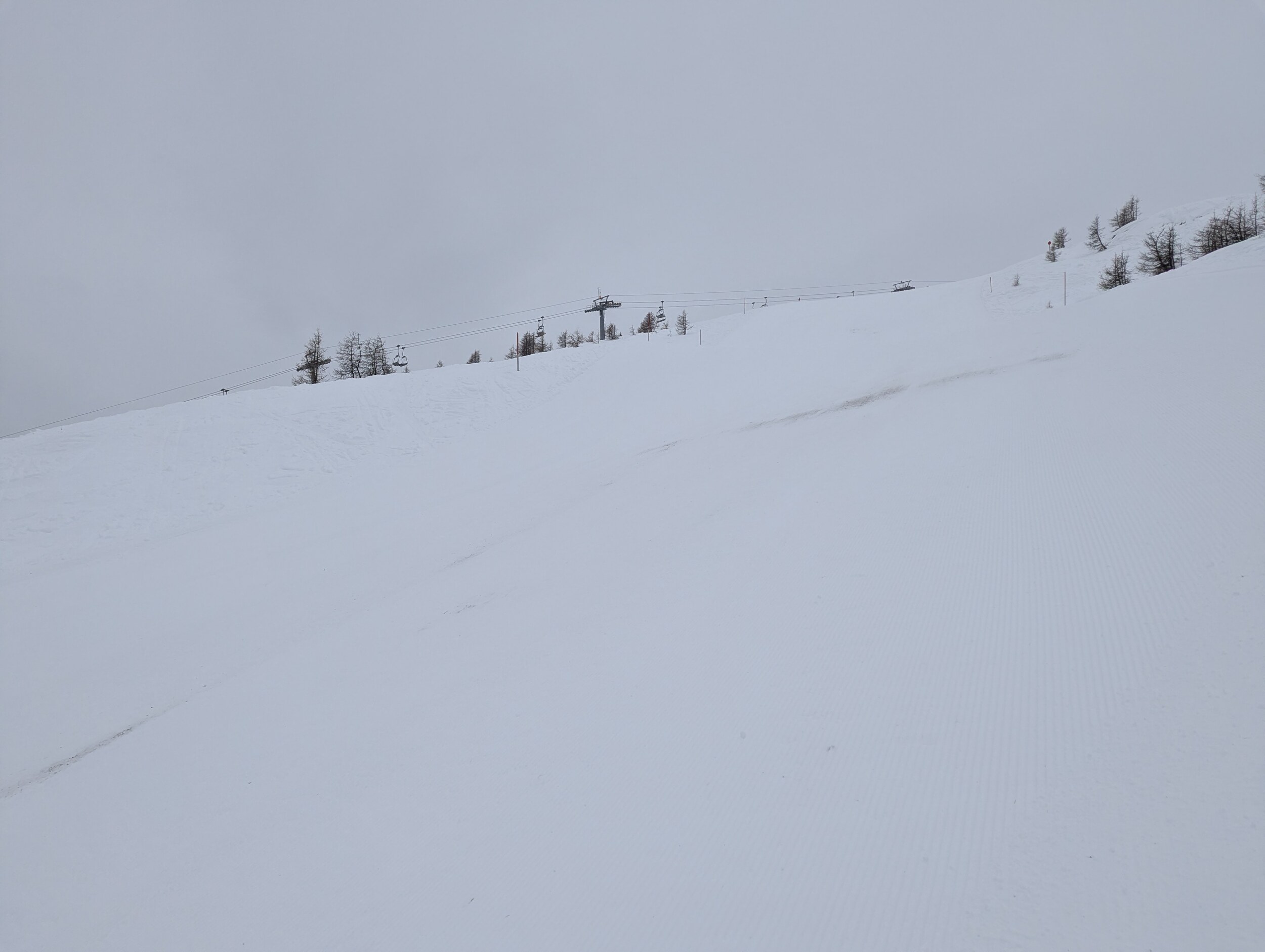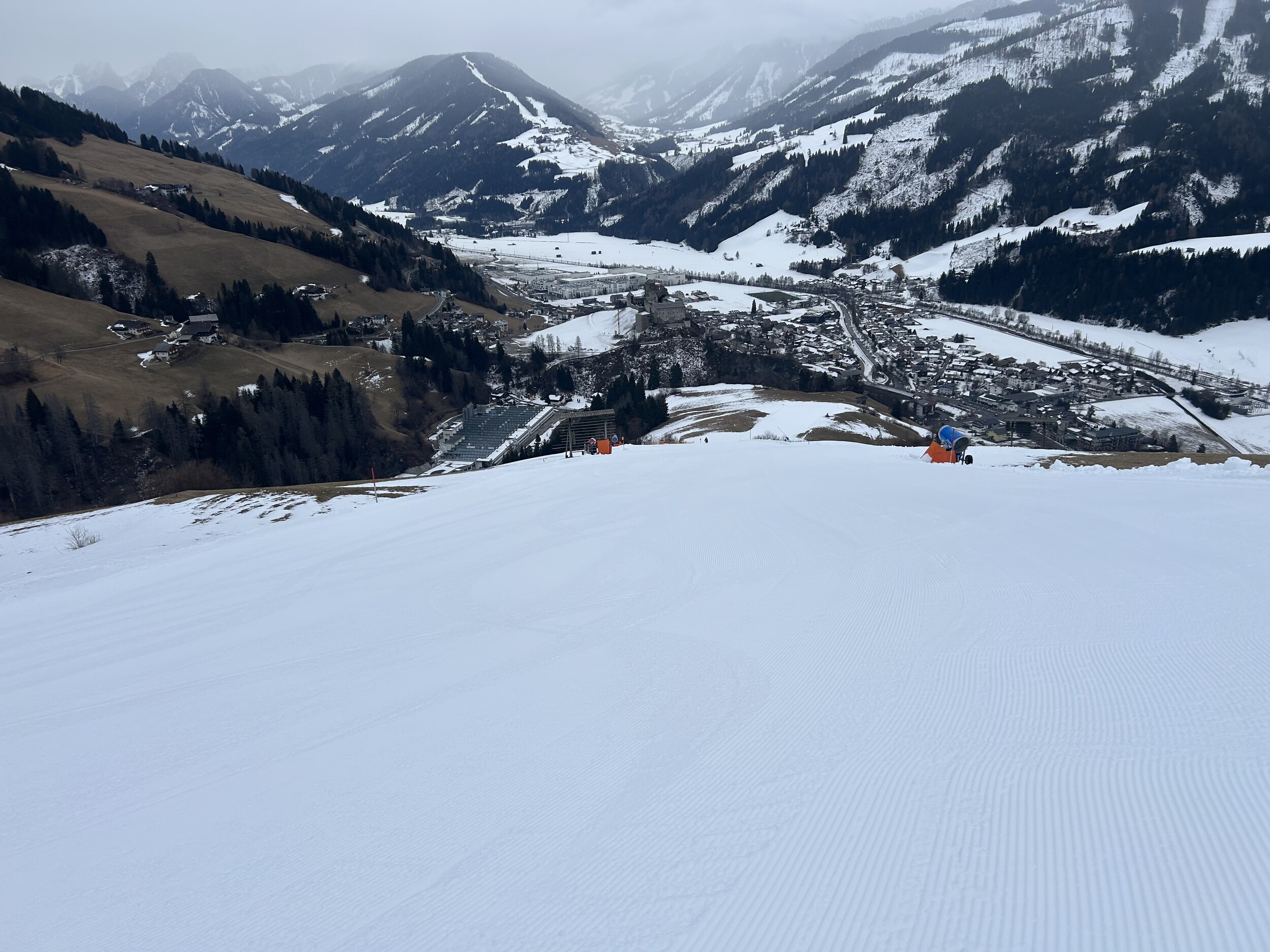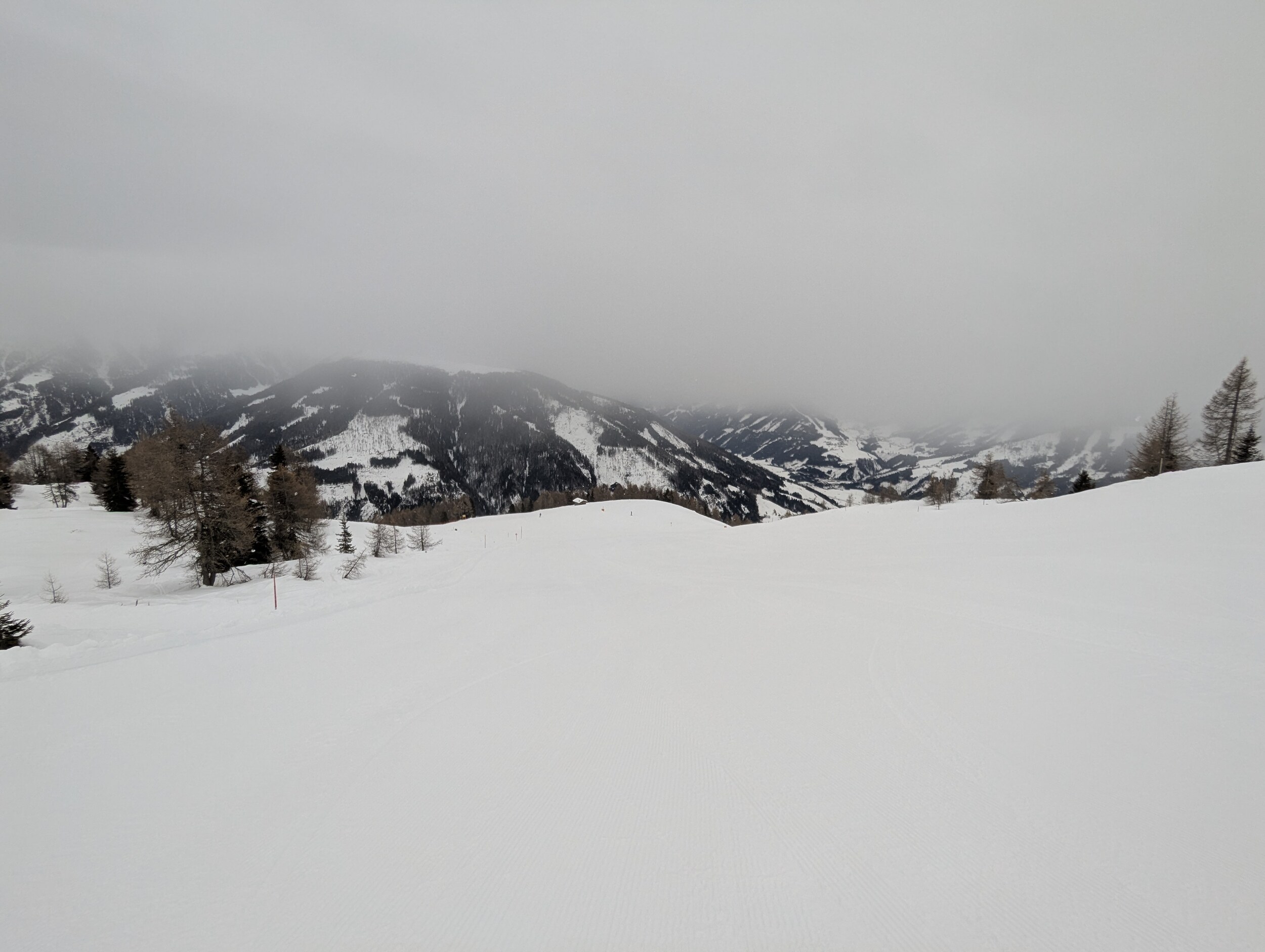 Guten Morgen aus Silian, heute Schlechtwettertag mit aufziehender Front, am Morgen aber noch kein Neuschnee auf der Piste. Wolkenbasis aber nun absinkend und es flöckelt leicht.