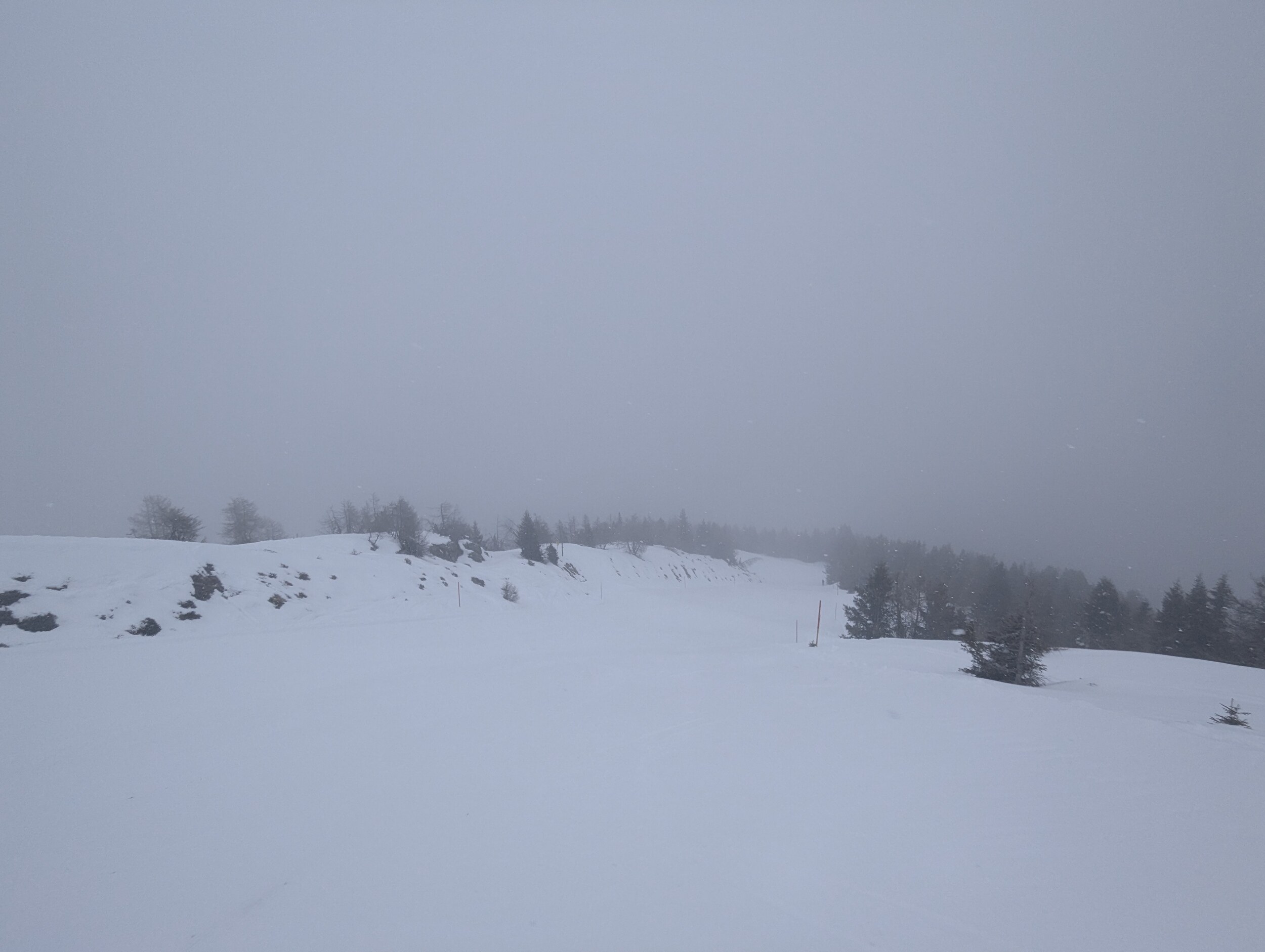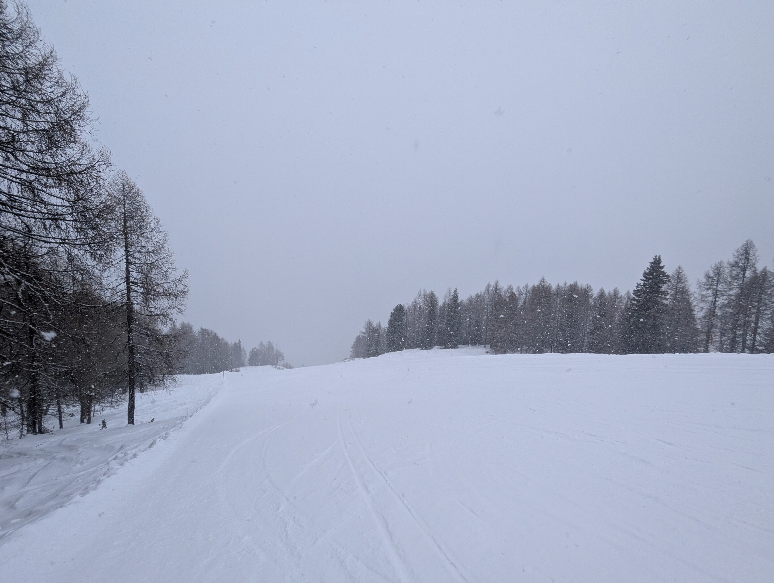 Schon zapfig heute im Vergleich zu den letzten Tagen, ganz oben die Sicht grenzwertig, ein Stück weiter unten ab dem Baumbereich schon viel besser. Schneefall mittlerweile intensiv.