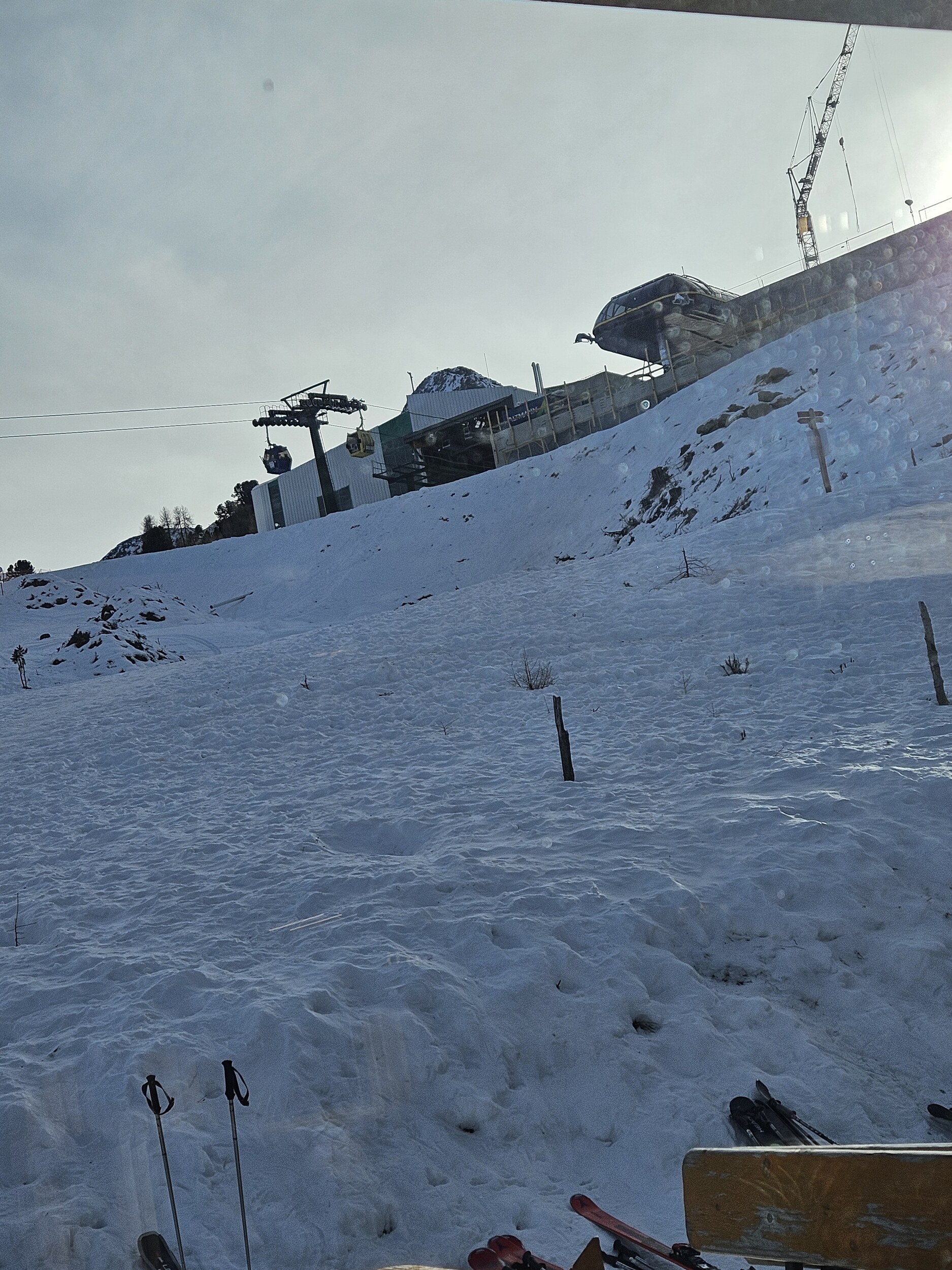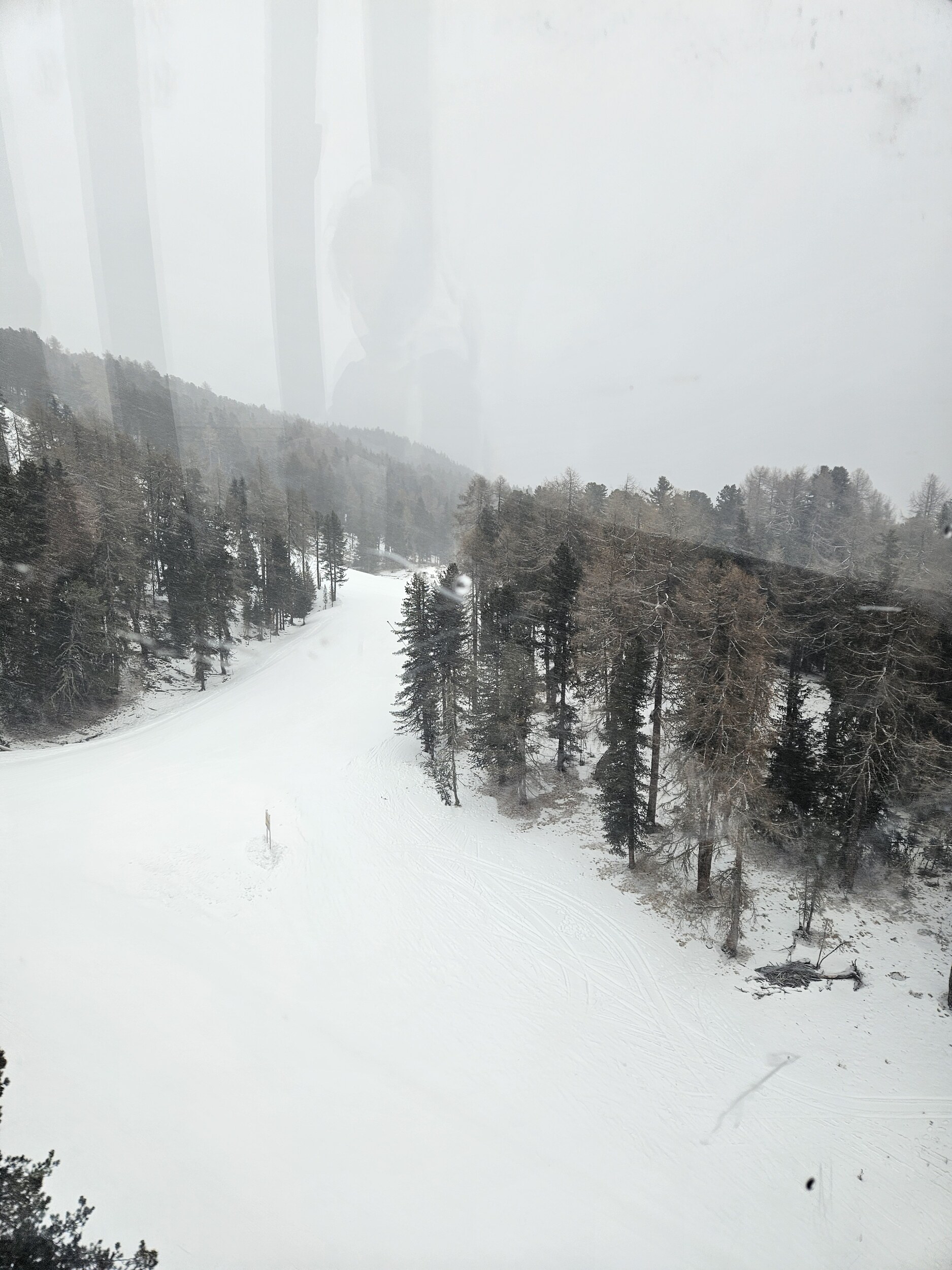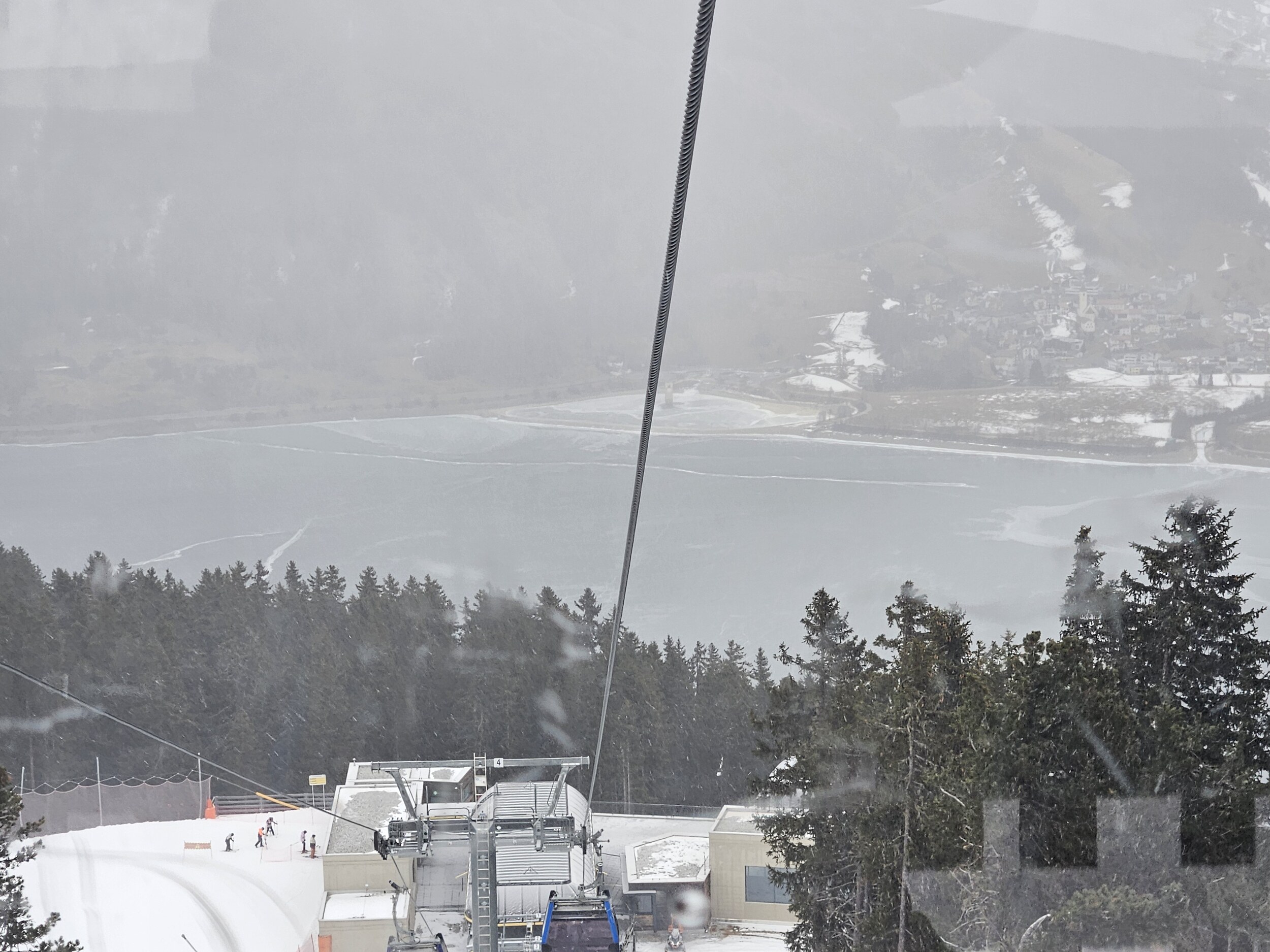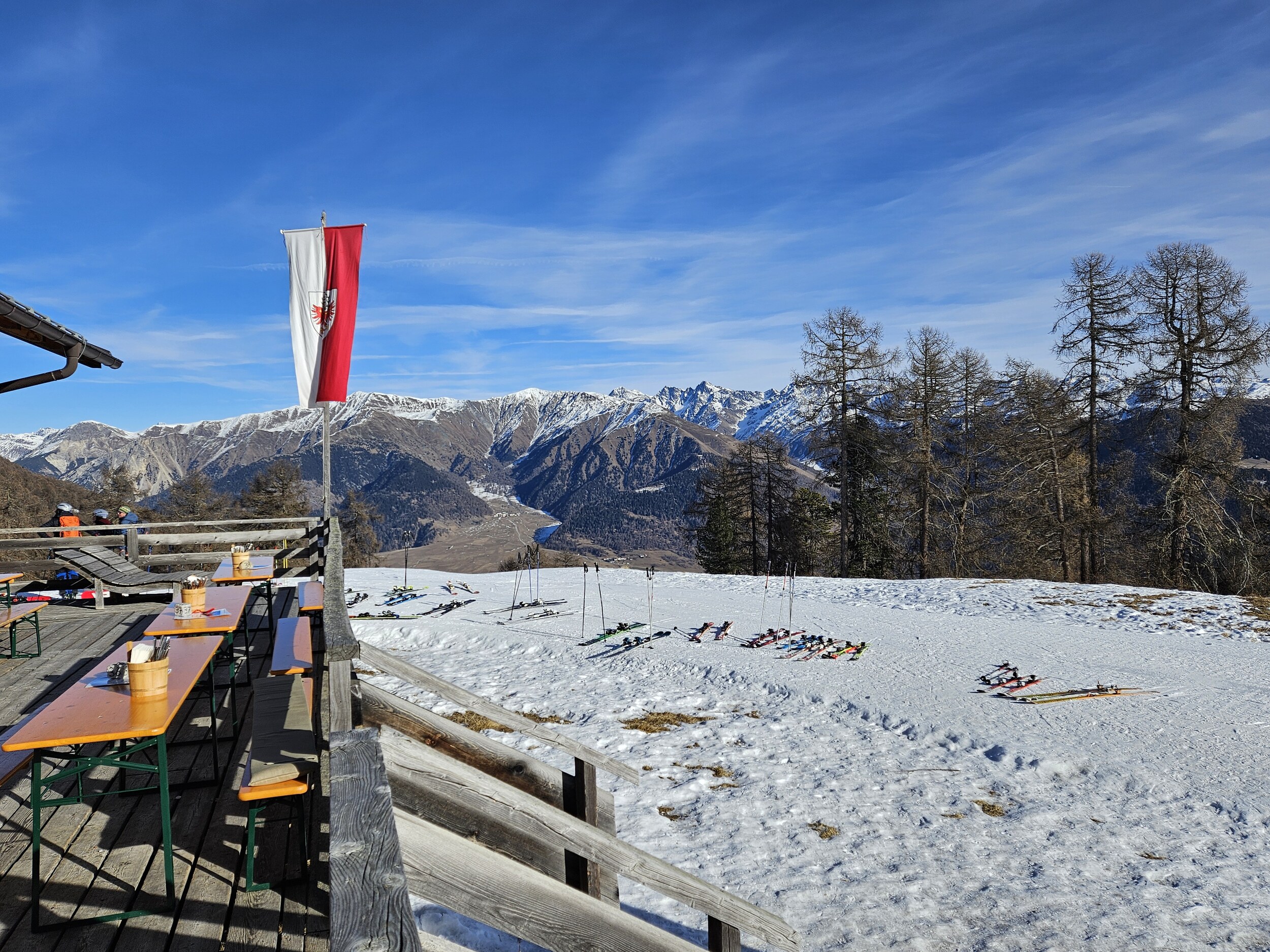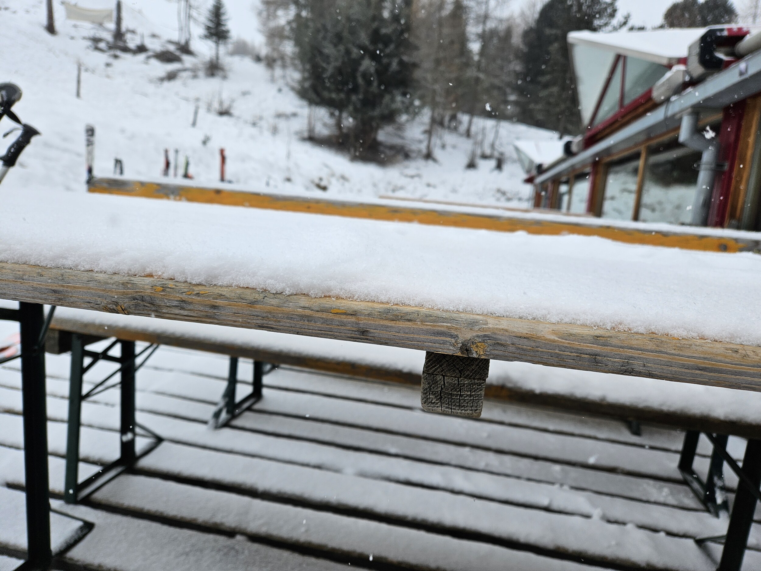 Ich wartete dann im Level 1463 auf die Familie und das Shuttle bei Bombardino und weißem Spritzer, letzterer für € 3,30 das Glas übrigens sehr günstig ☝️ und schaute dem Schnee bei rieseln auf die am Morgen noch braunen Hänge zu.