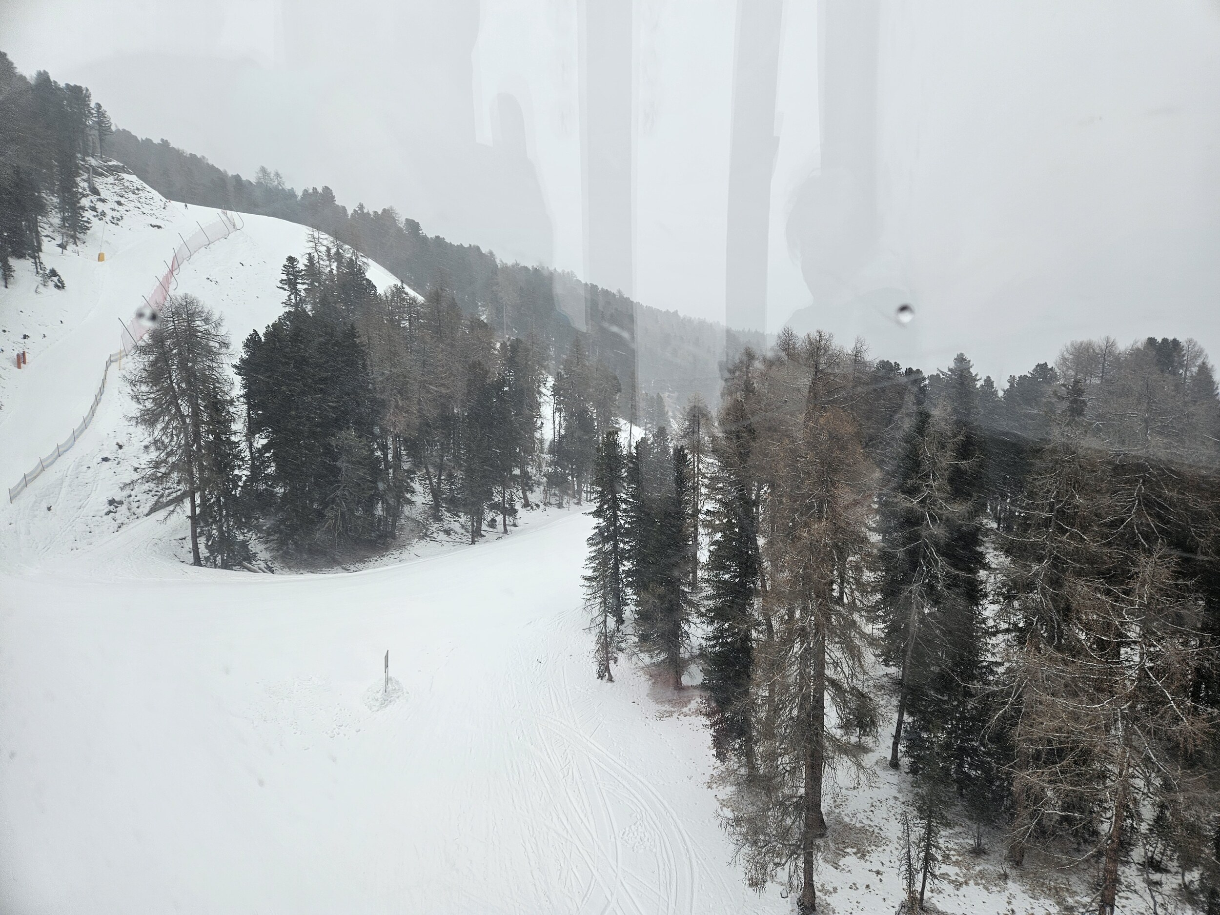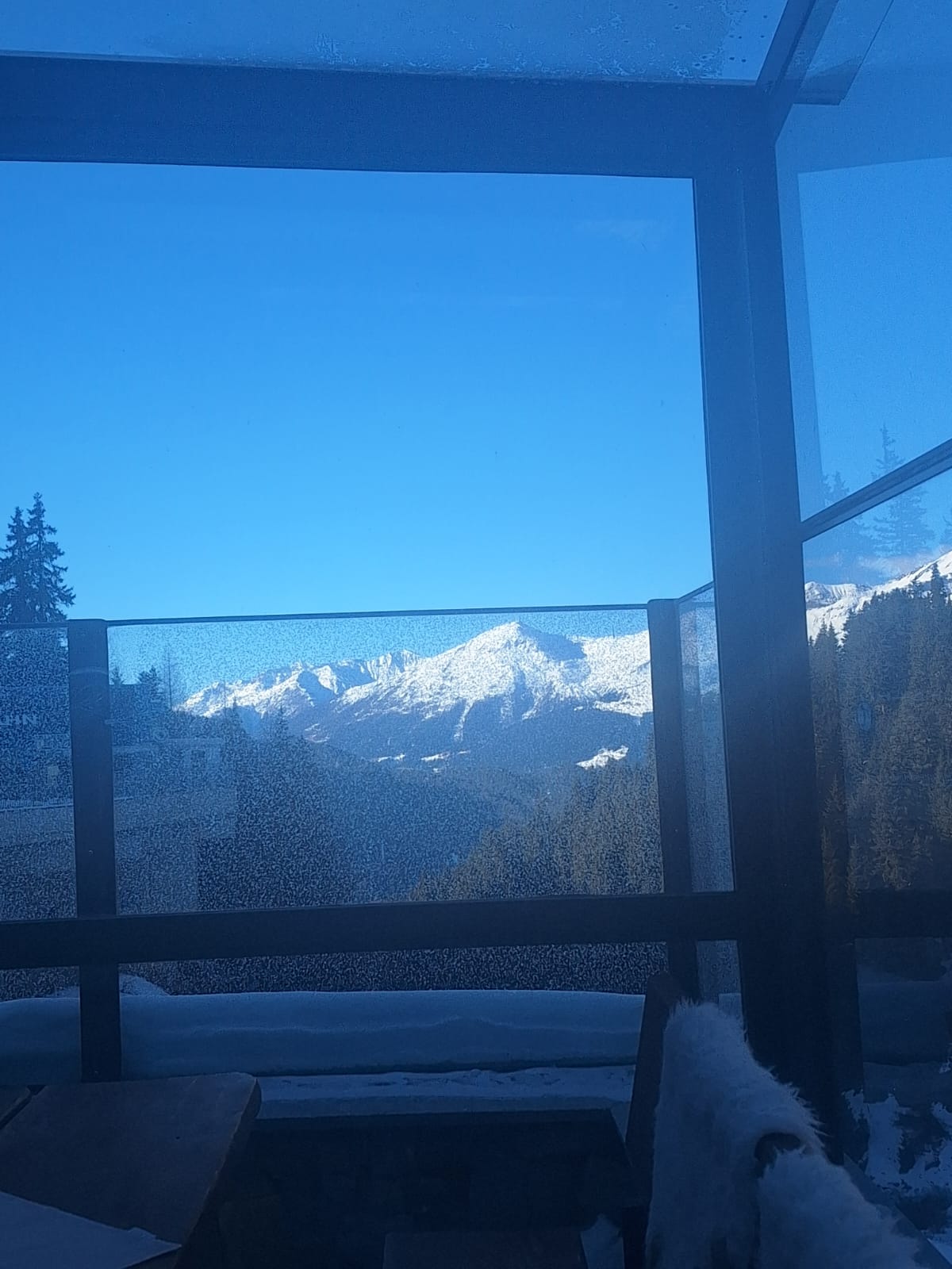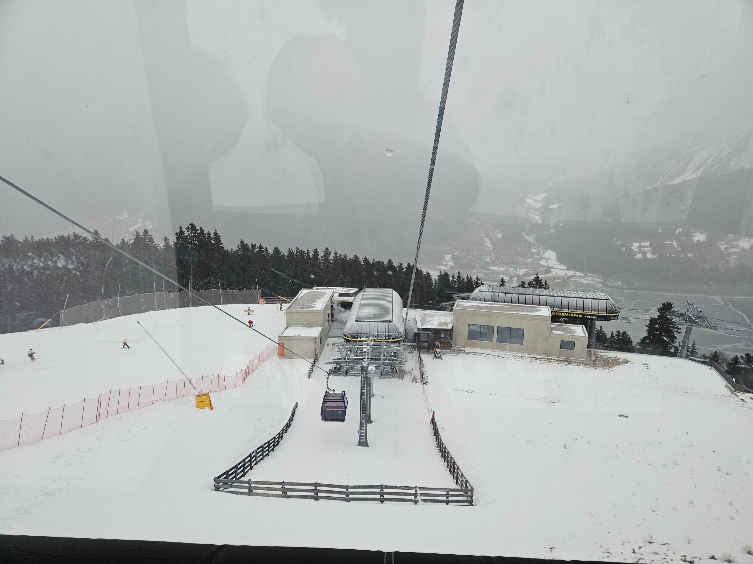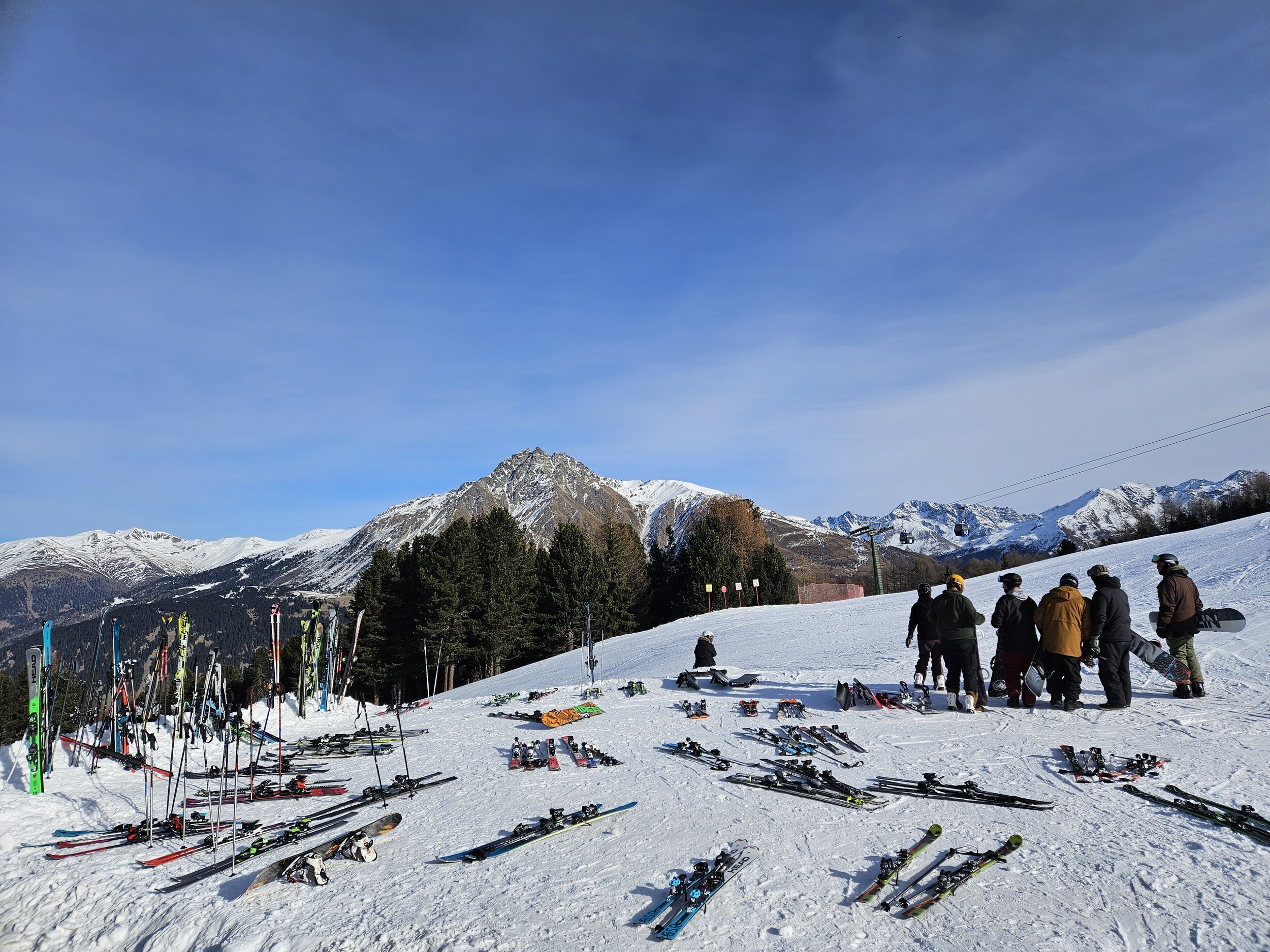 Ich wartete dann im Level 1463 auf die Familie und das Shuttle bei Bombardino und weißem Spritzer, letzterer für € 3,30 das Glas übrigens sehr günstig ☝️ und schaute dem Schnee bei rieseln auf die am Morgen noch braunen Hänge zu.