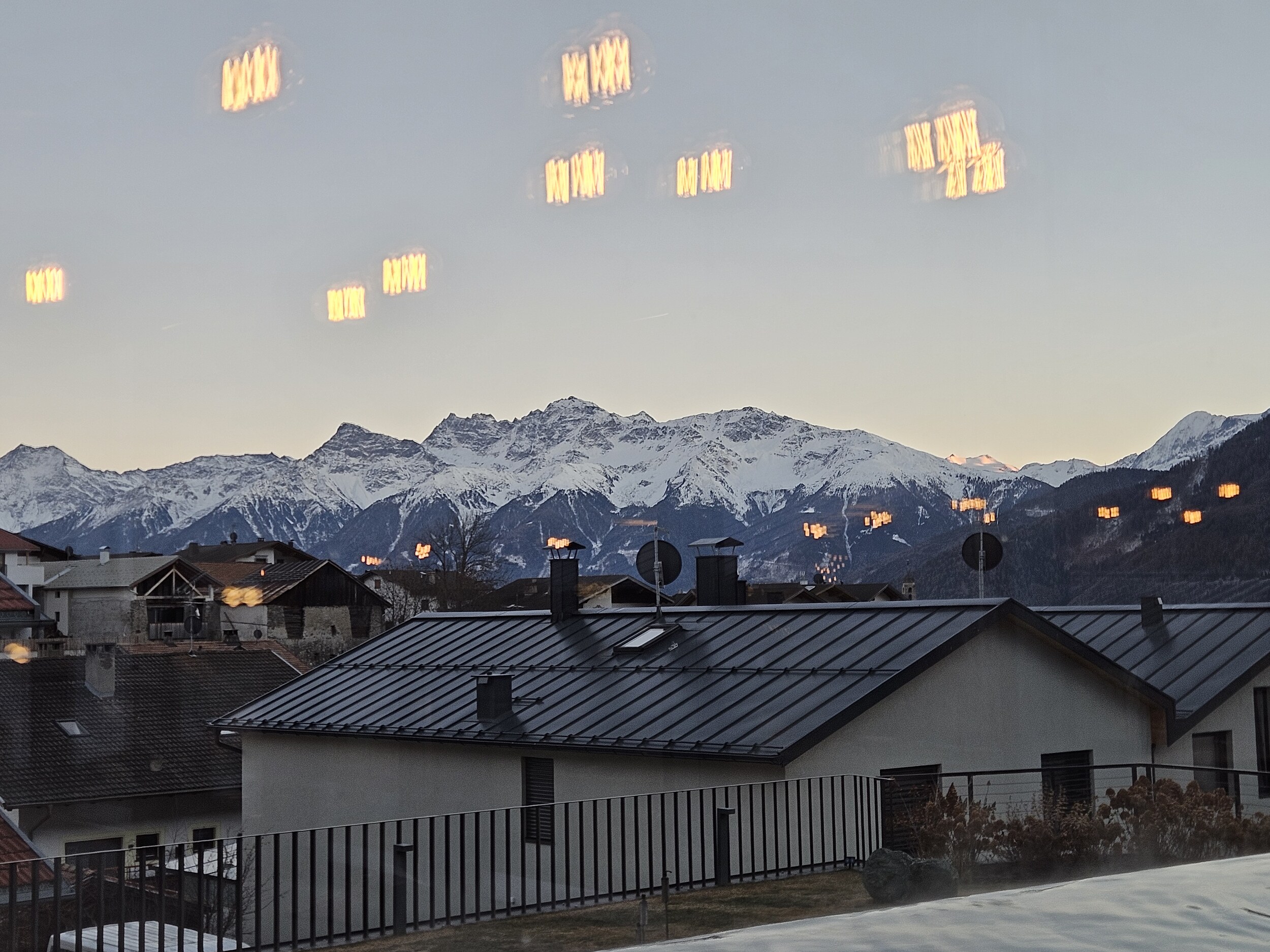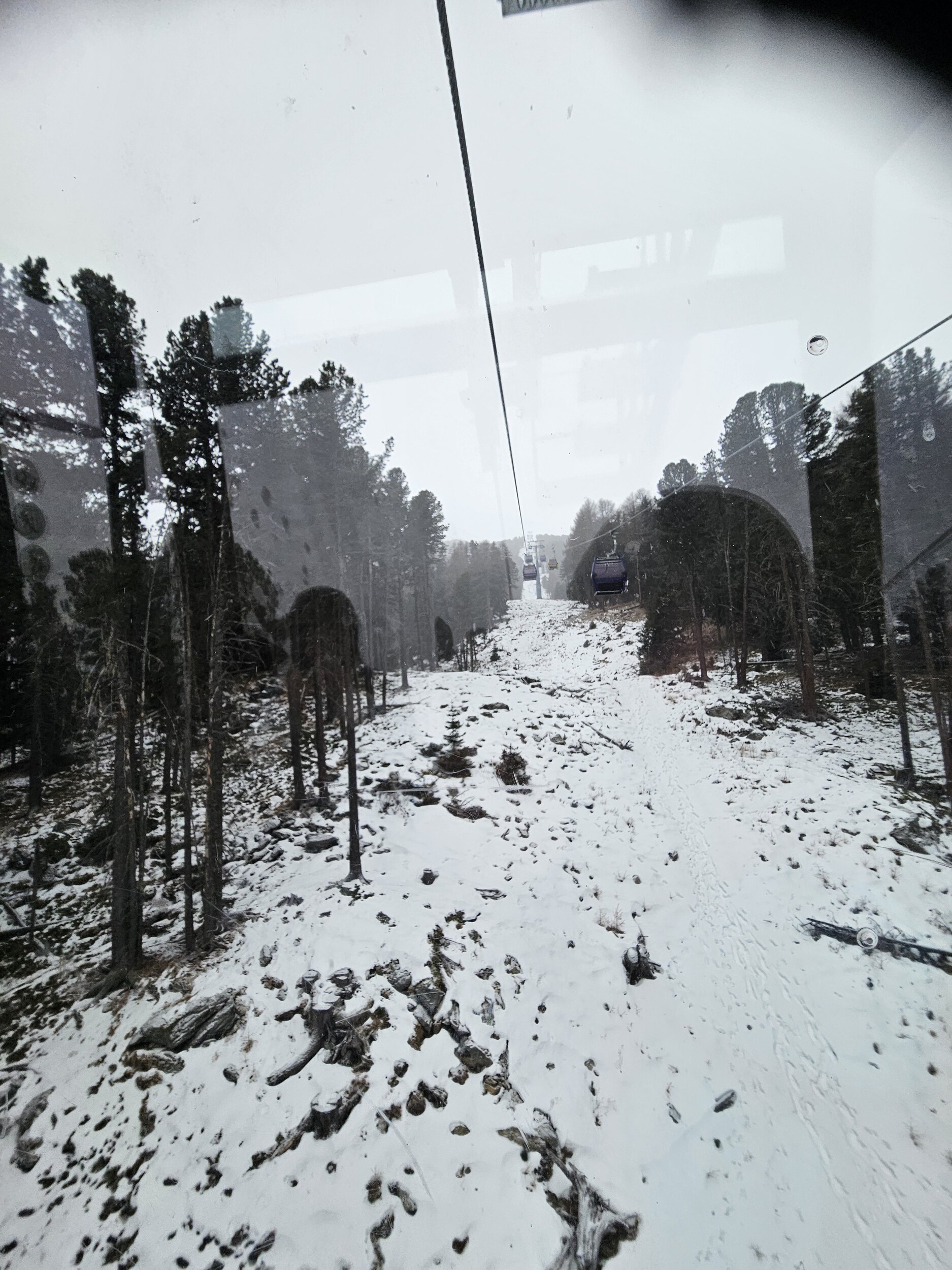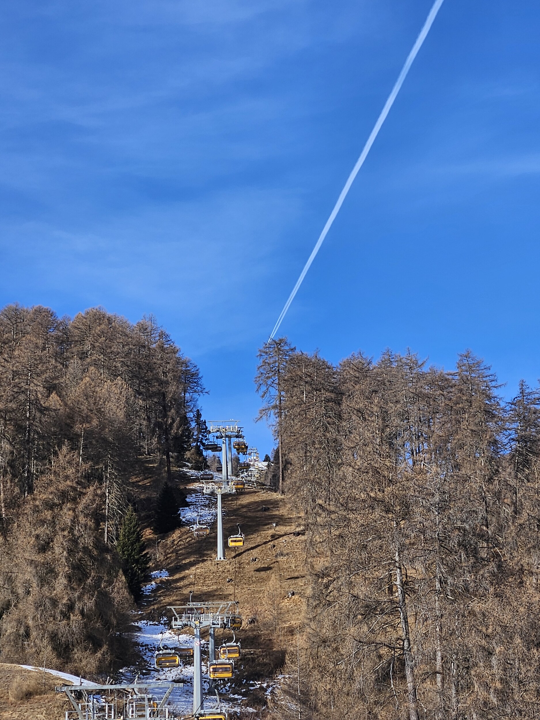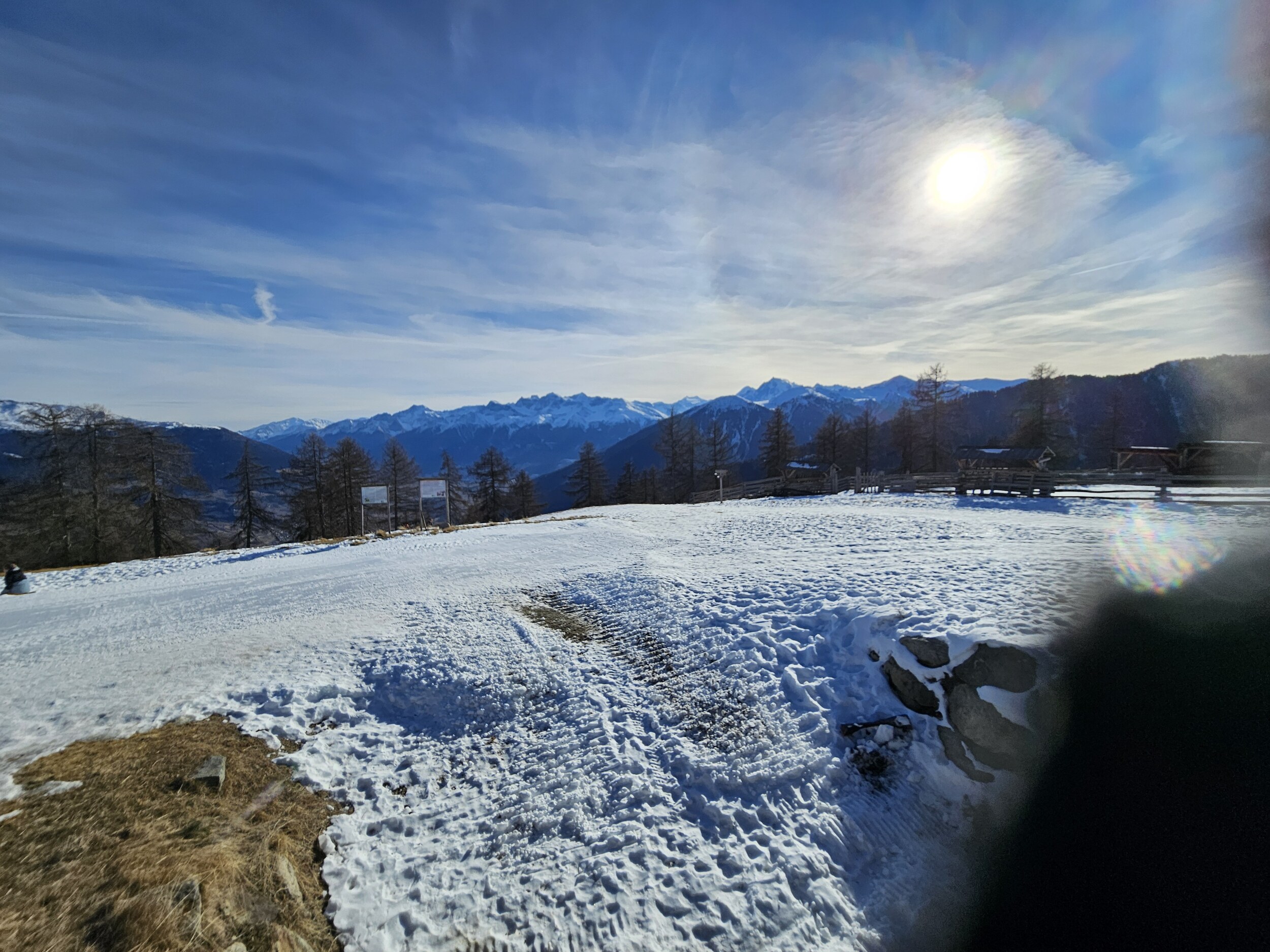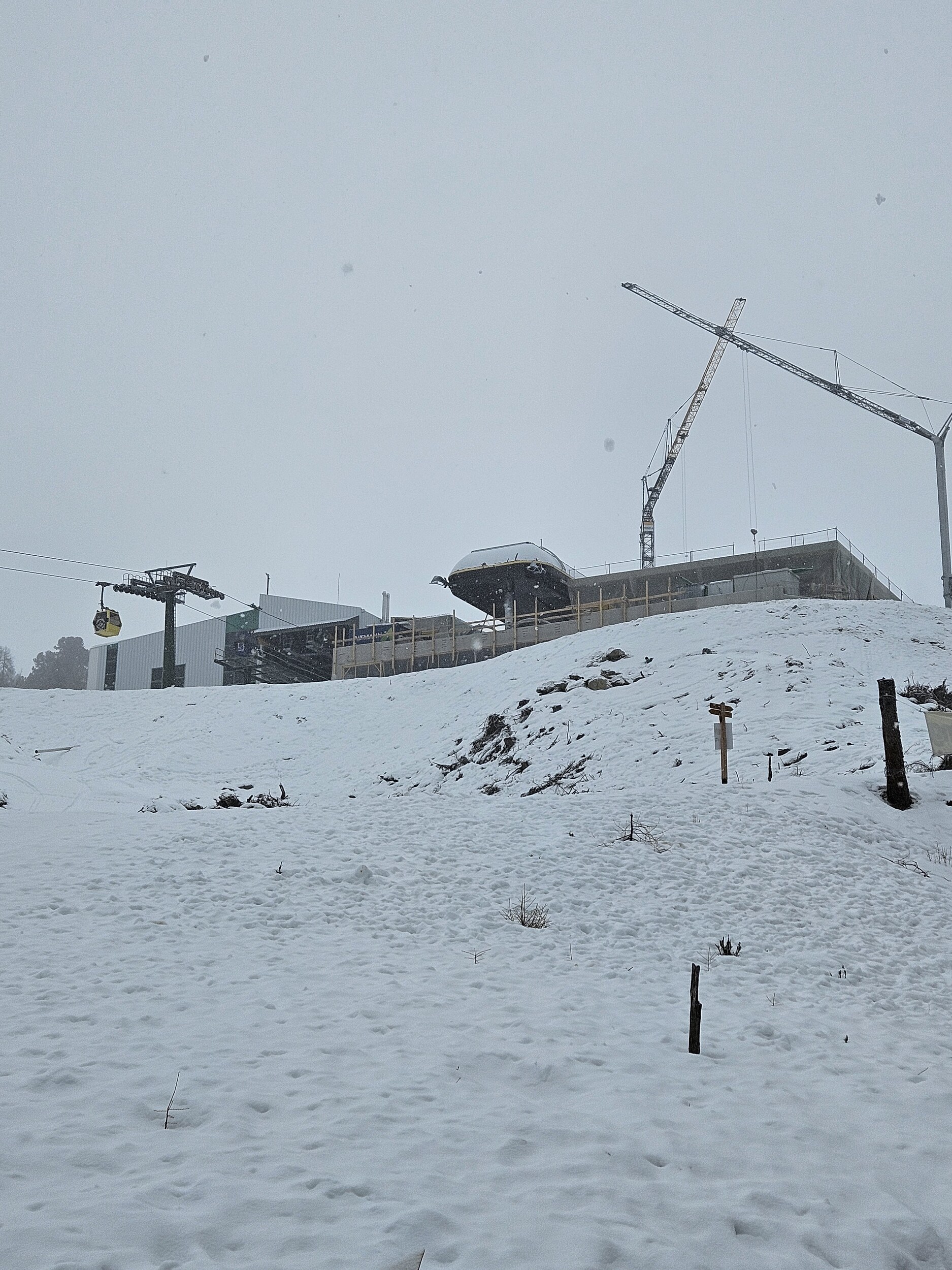 Ich wartete dann im Level 1463 auf die Familie und das Shuttle bei Bombardino und weißem Spritzer, letzterer für € 3,30 das Glas übrigens sehr günstig ☝️ und schaute dem Schnee bei rieseln auf die am Morgen noch braunen Hänge zu.