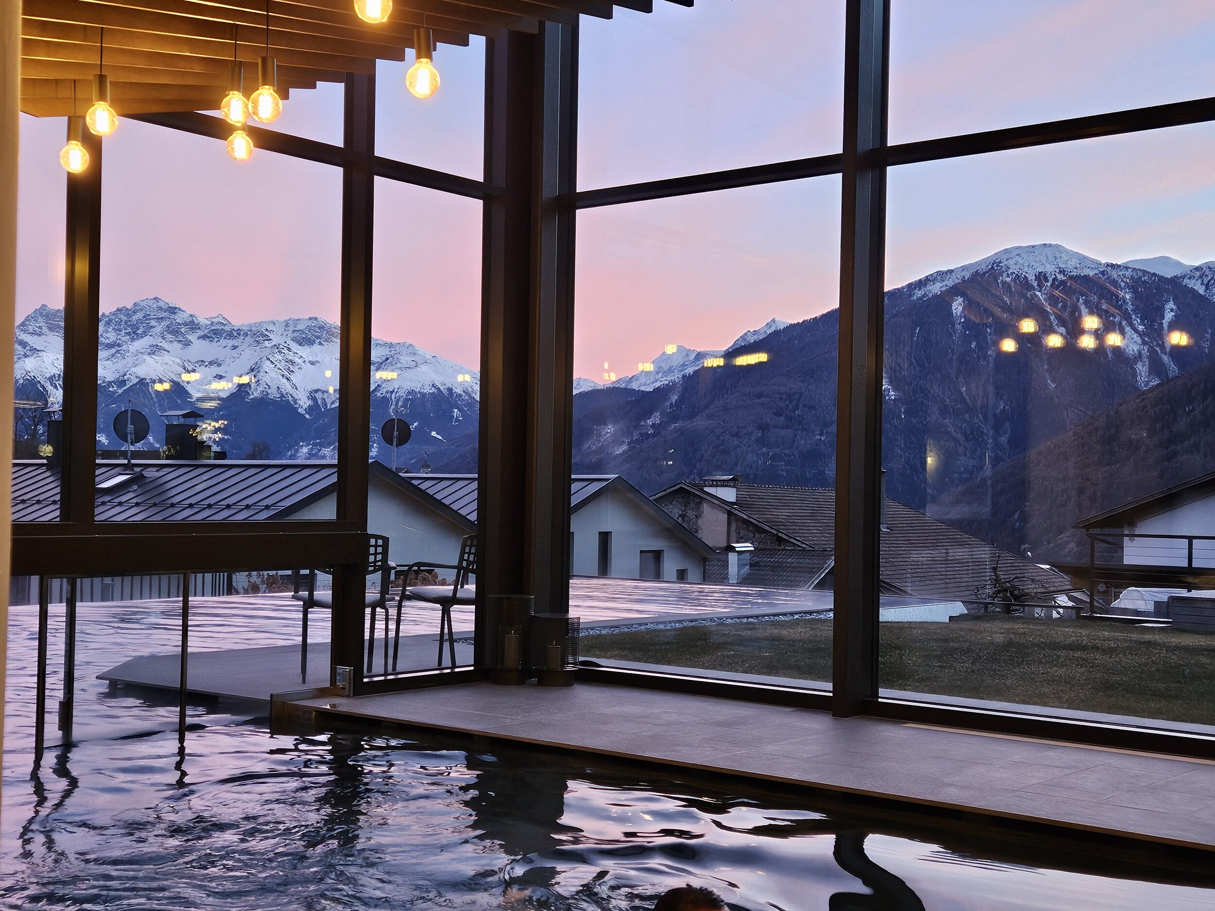 Schnell Gepäck abgestellt, dann am Watles Skitickets und notwendige Ausrüstung geholt, ein kleiner Snack und ab ins Panoramabad😎