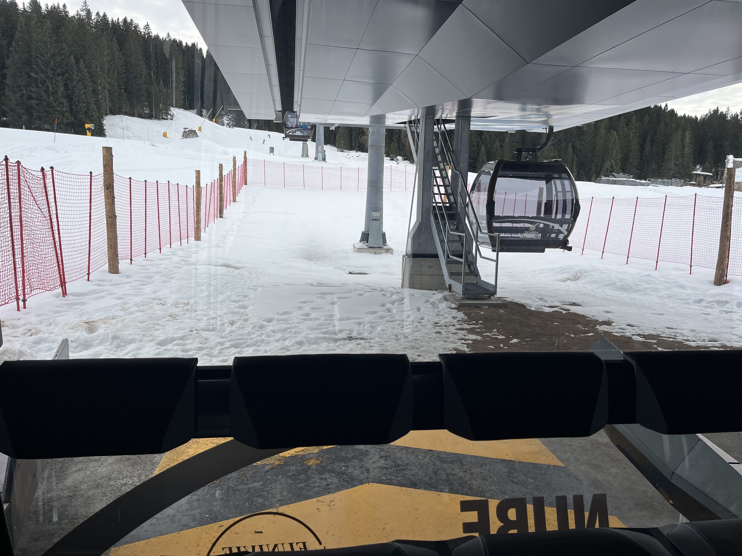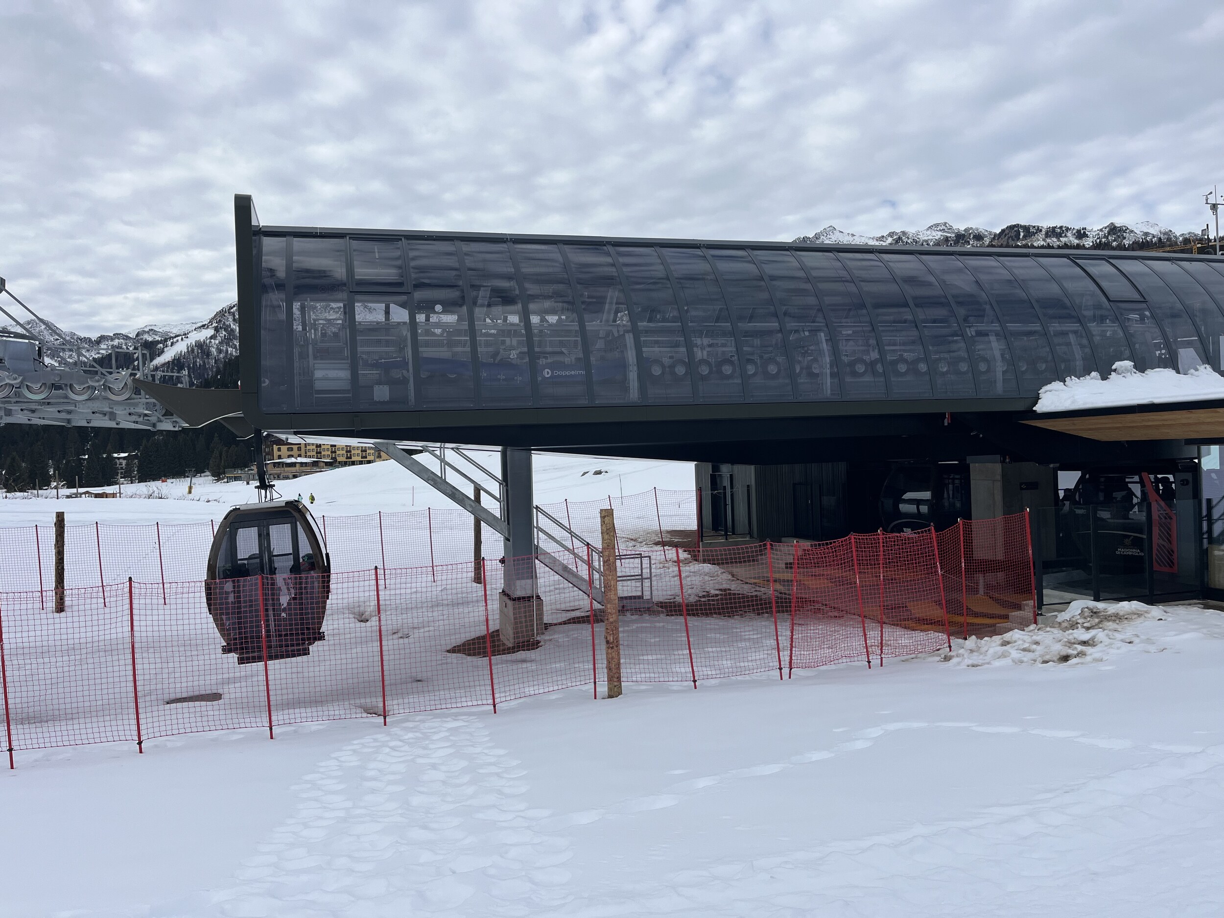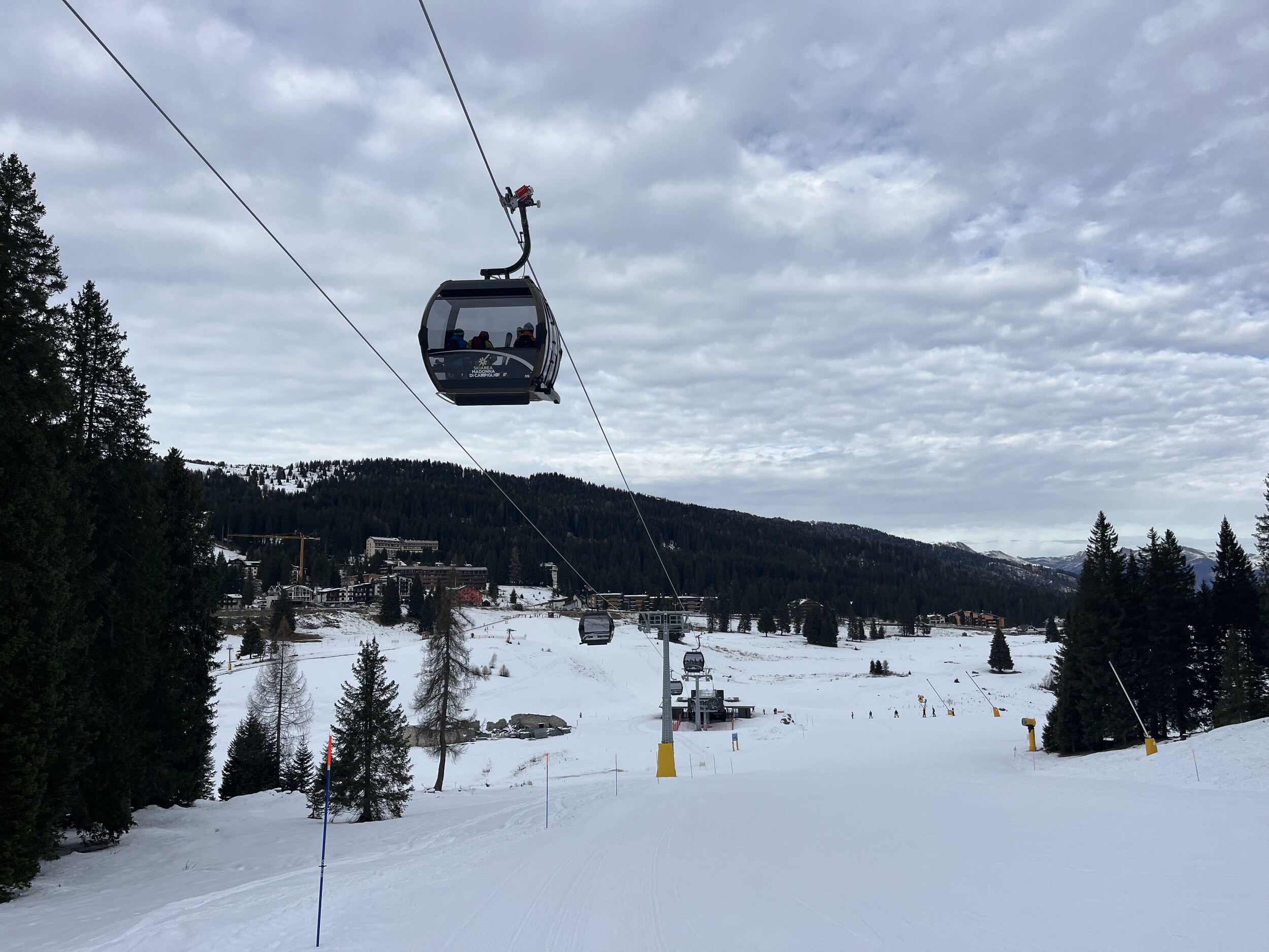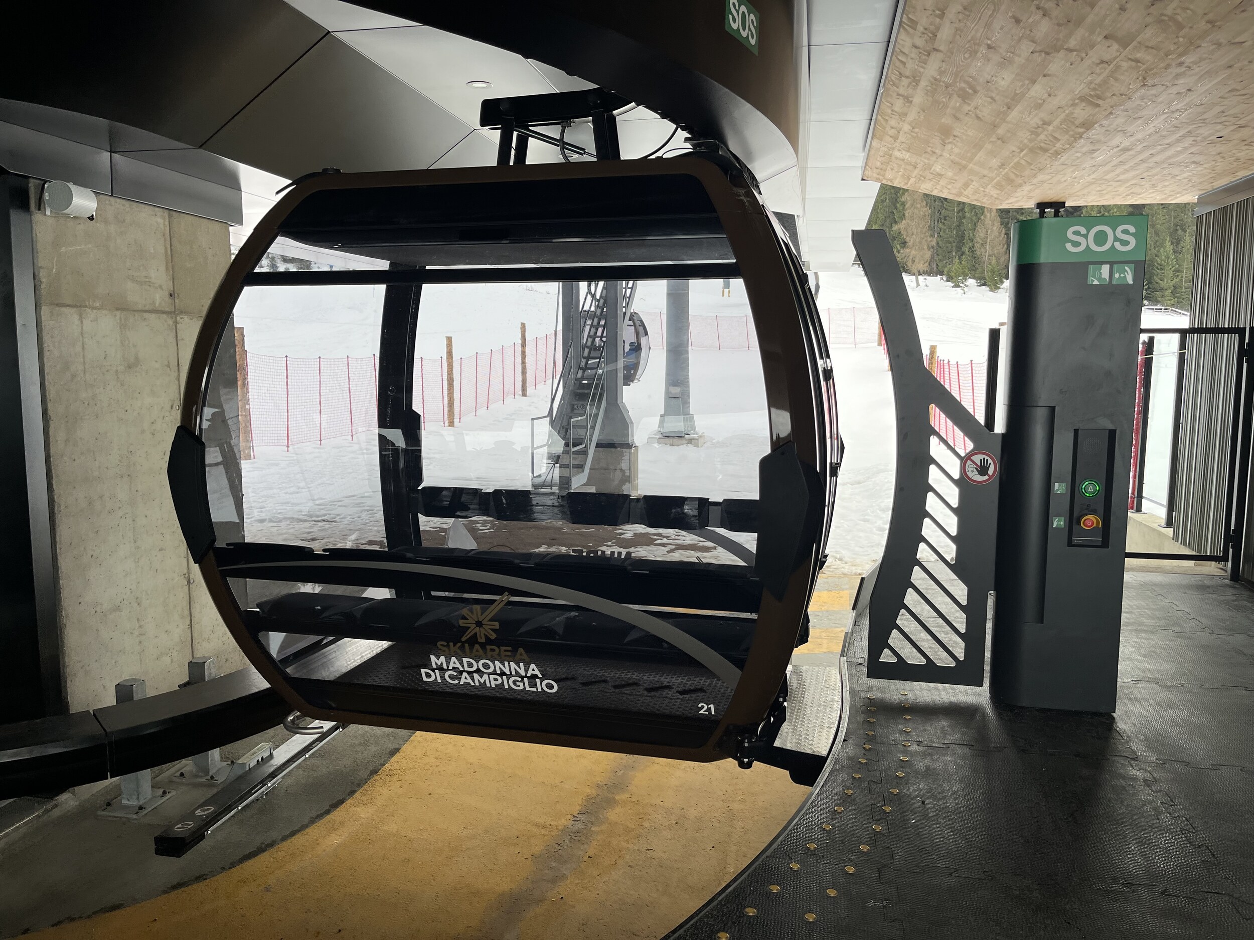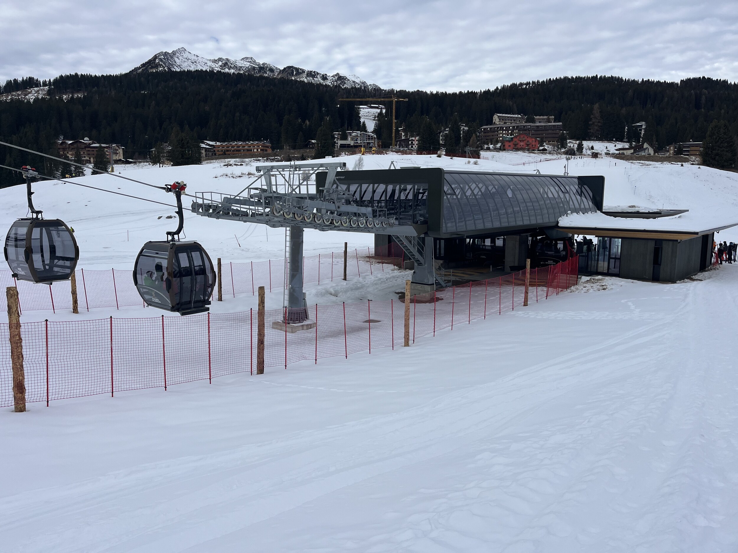 Gelungene neue Doss del Sabion Gondelbahn, schade aber dass man von der Gondelbahn aus Pinzol entweder für ein kurzes Stück Skier anschnallen muss oder eine Stein Treppe herunter laufen muss.