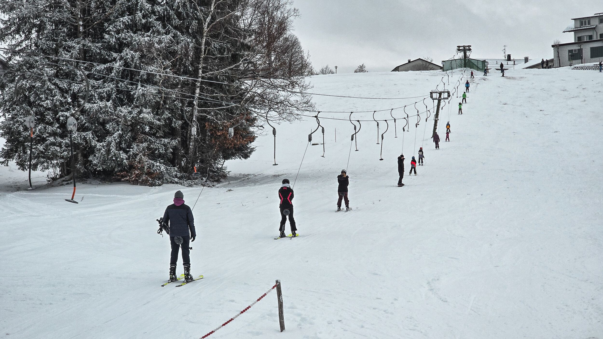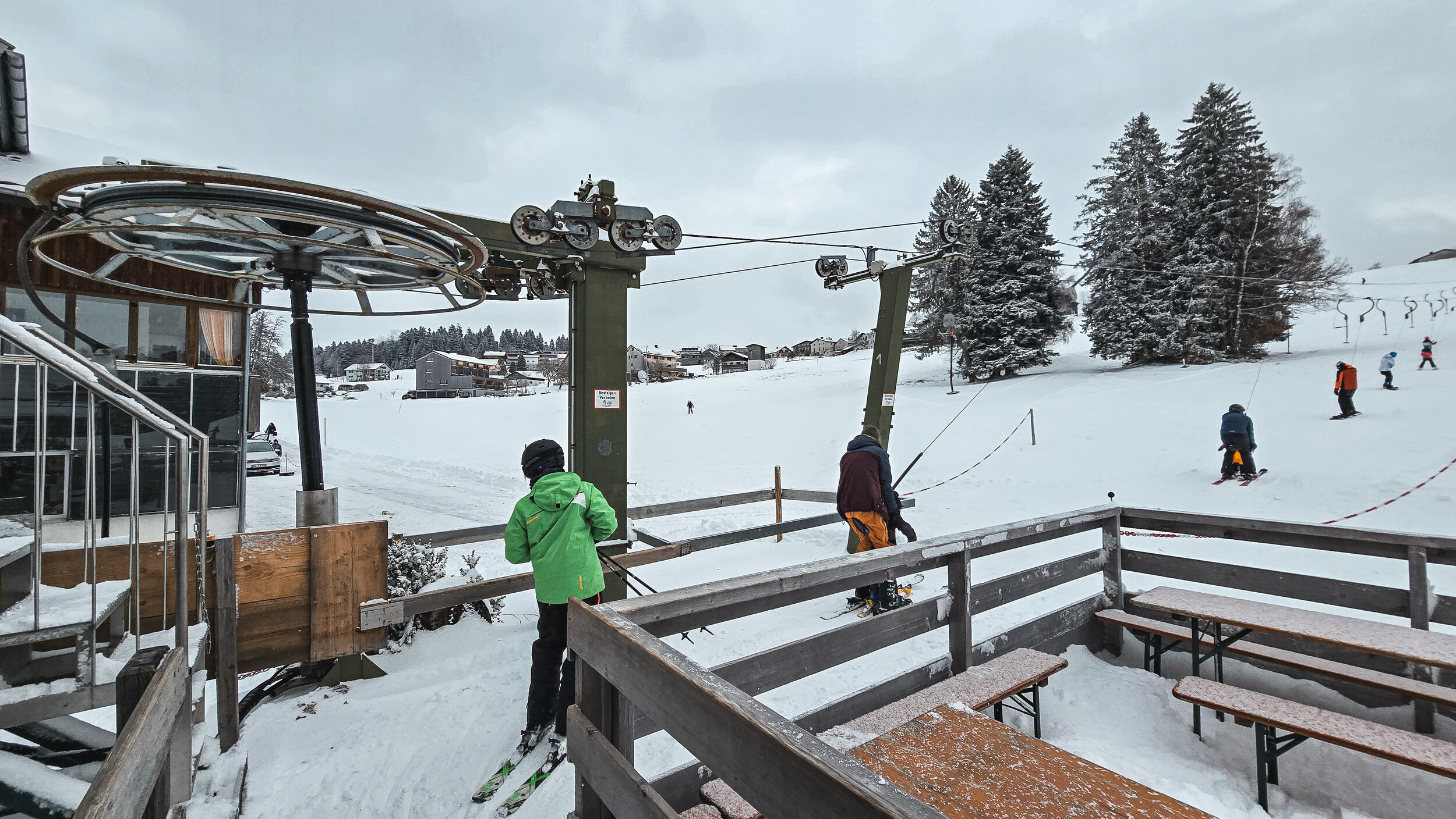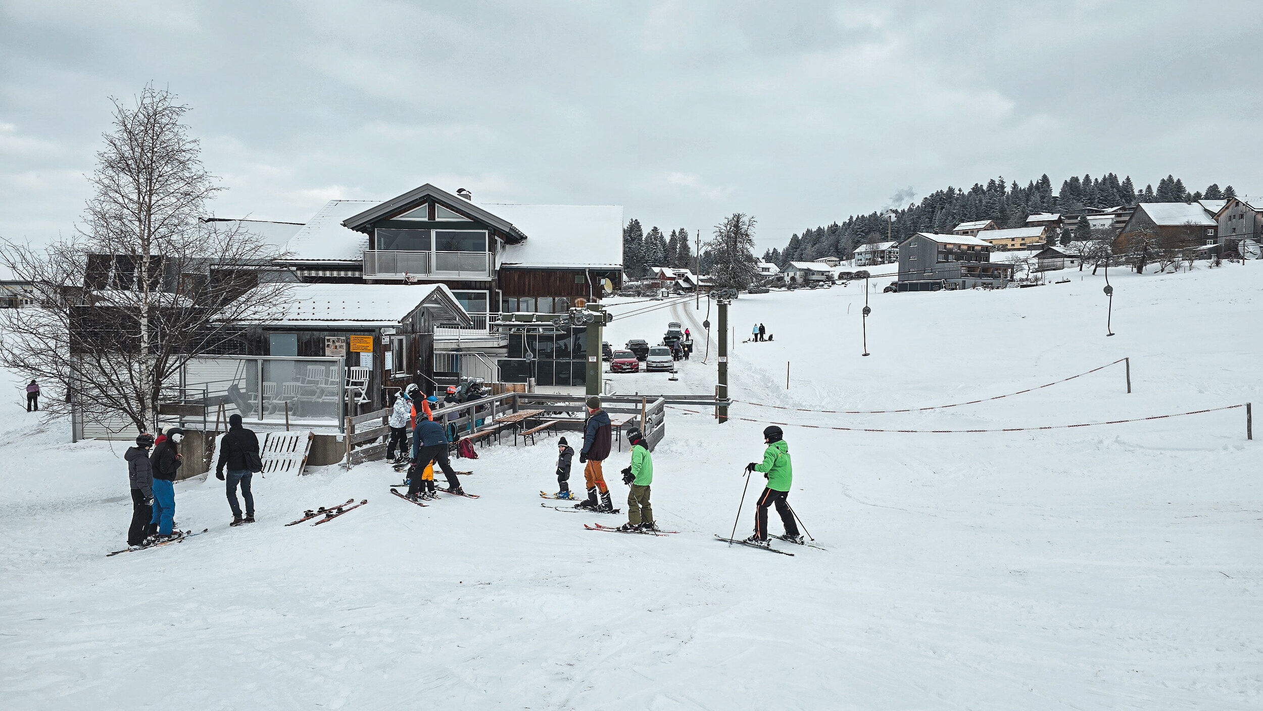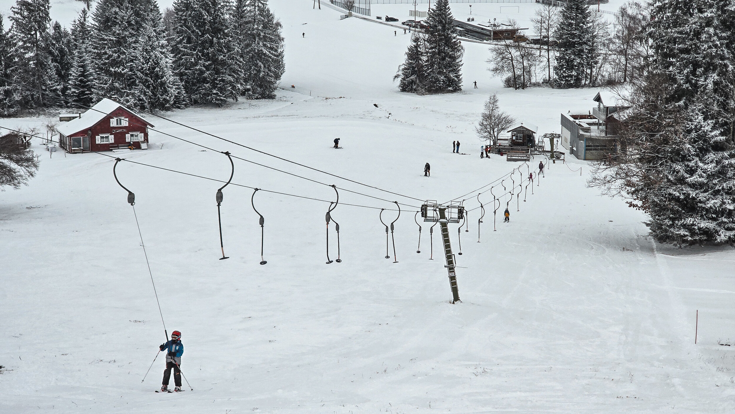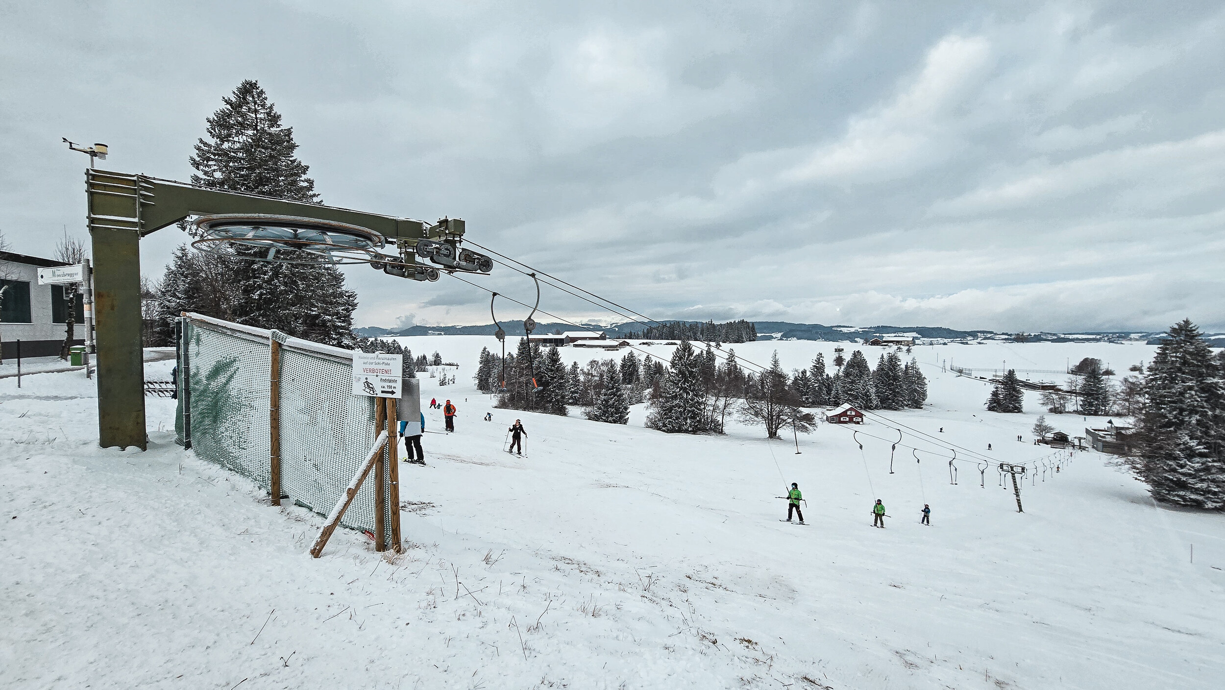 Es gibt Lifte, an denen fährt man jahrelang vorbei, im übertragenen wie im wörtlichen Sinn. Man wirft einen flüchtigen Blick hinüber, fragt sich kurz, wie oft dieser wohl in Betrieb ist, und schon ist man wieder weg. Sulzberg in Vorarlberg ist genau so ein Fall. Ein winziger Punkt auf der Skikarte, meist übersehen, nie erwähnt. Kaum der Rede wert, oder gerade deshalb einen Abstecher wert? Denn wenn Frau Holle gnädig ist und die Wiesen rund ums Dorf weiss einschneit, setzt sich plötzlich ein dünnes Stahlseil in Bewegung. Teller surren durch die winterliche Stille und Sulzberg hat Skibetrieb. 135 Meter Länge, 35 Höhenmeter, eine Zwischenstütze und ein Totpunktausstieg als Bergstation. Mehr braucht es hier nicht, alles ist vollkommen überschaubar. Direkt am Dorfrand gelegen, auf einer Wiese, die bei Betrieb kurzerhand zur Piste erklärt wird. Der Parkplatz reicht für vielleicht ein Dutzend Autos. Die kleine Talstation beherbergt Kasse, Garage und den rudimentären Skiverleih. Die Infrastruktur ist aufs Nötigste reduziert. Für neun Euro gibt es eine Halbtageskarte. In diesem Fall war es ein kurzer Zwischenstopp auf dem Weg ins Allgäu. Für die meisten kein Verlust, wenn man nie dort war. Für die Dorfjugend aber Gold wert. Ein Ort, um das Skifahren zu lernen, ganz ohne Trubel. Und so unscheinbar der Lift auch wirkt, es ist schön, dass es ihn noch gibt. Und hoffentlich noch lange geben wird.