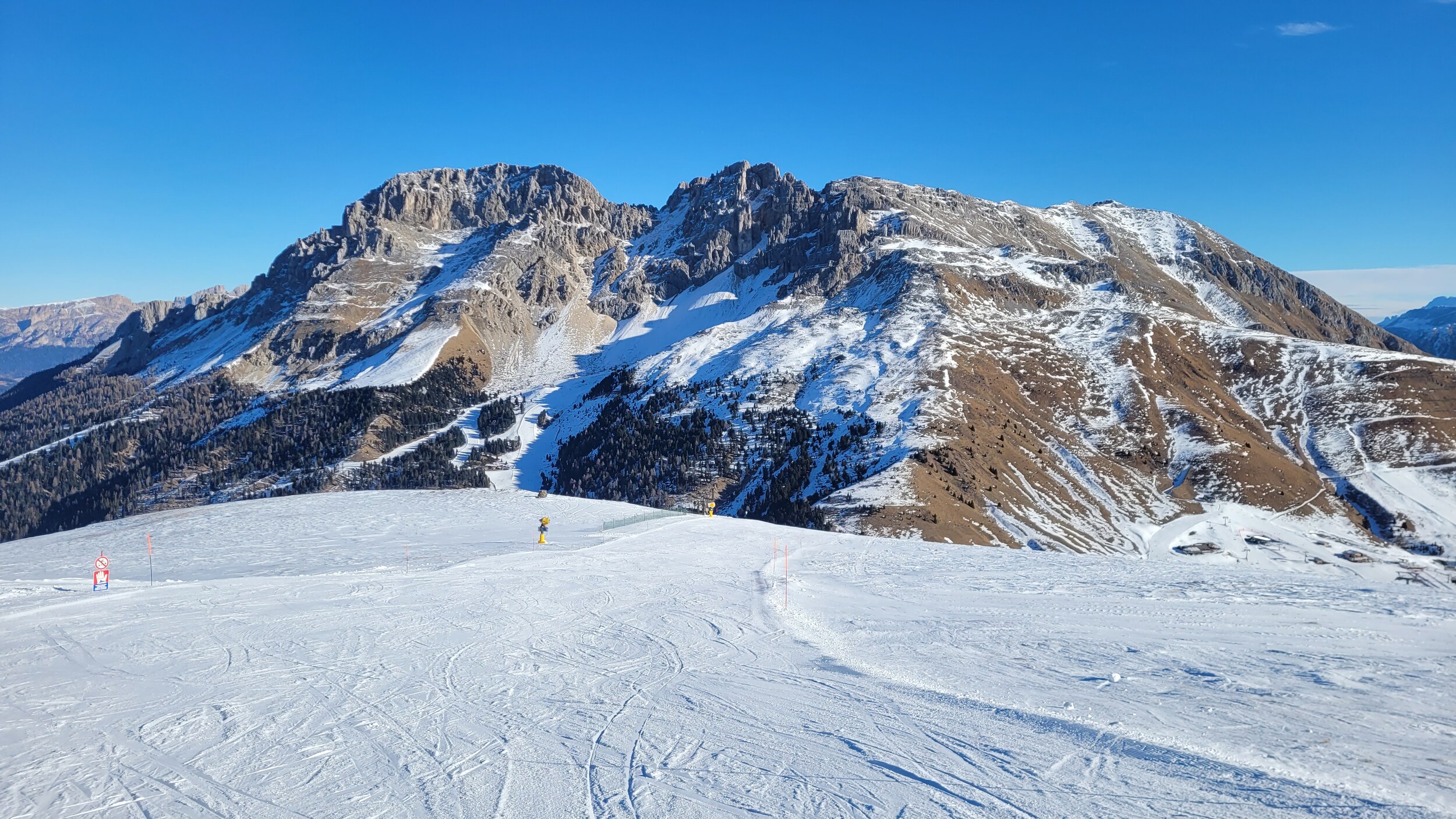 Auch wenn ich sonst der Verfechter bin, dass die Dolomiten keinen Naturschnee brauchen, sieht es rundum derzeit schon erschreckend herbstlich aus.