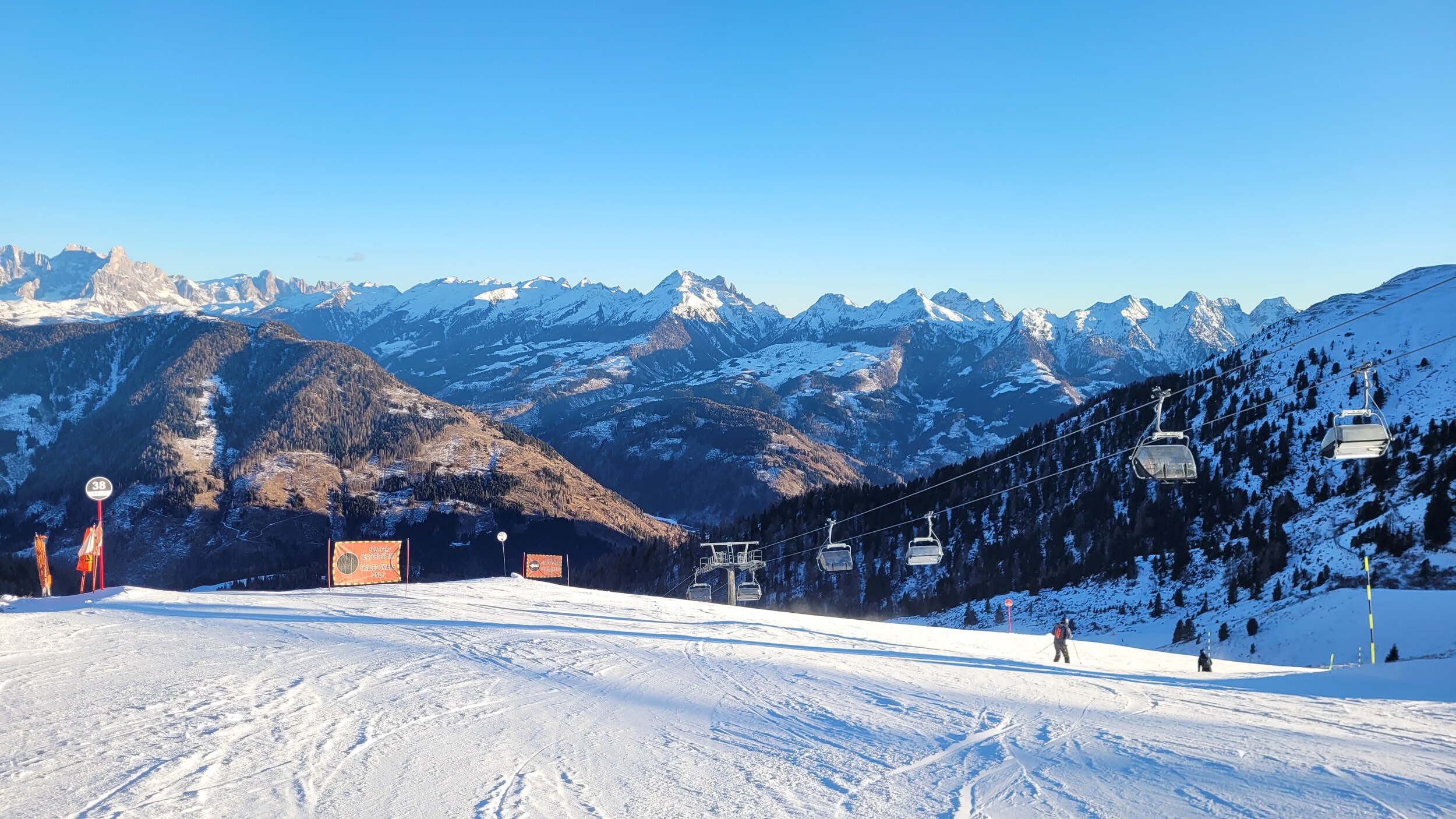 Das schaut schon mal interessant aus: Weitere top schwarze 20a am Pala di Santa: Schön sonnig ist es, aber auch unter -10°C. Ich habe mir sicherheitshalber Klebe-Wärmpads auf die Zehen gepappt, funktioniert soweit gut. Der Schlepper ganz oben ist nicht offen. Hammer-Aussicht auf die Latemar-Gruppe: Kurzer Telemix "Laner": Mittags -10°C, mit Sonne noch angenehm. Weiter geht's mit Top-Pisten, Nr 5 ist auch landschaftlich schön: Die neue Latemar-EUB: Piste 28 an Agnello: An Tresca ist es ziemlich schattig, aufgrund der Gefrierfach-Temperaturen habe ich nur eine Runde gemacht. Oben sieht man das Sellamassiv: Rückbringer zum Passo Feudo: Am Nachmittag ist die Predazzo-Seite im Schatten, bis auf die Baita am Pass. Nach einem kleinen Dessert .. .. ging es zum Schluss nochmal auf die schwarze 38, die immer noch super griffig zu fahren war. Generell haben sich die Pisten sehr gut bis zum Schluss gehalten, der Andrang war auch recht überschaubar. Das Skigebiet ist wirklich sehr abwechslungsreich. Ein sehr cooler Tag heute - im wahrsten Sinne des Wortes