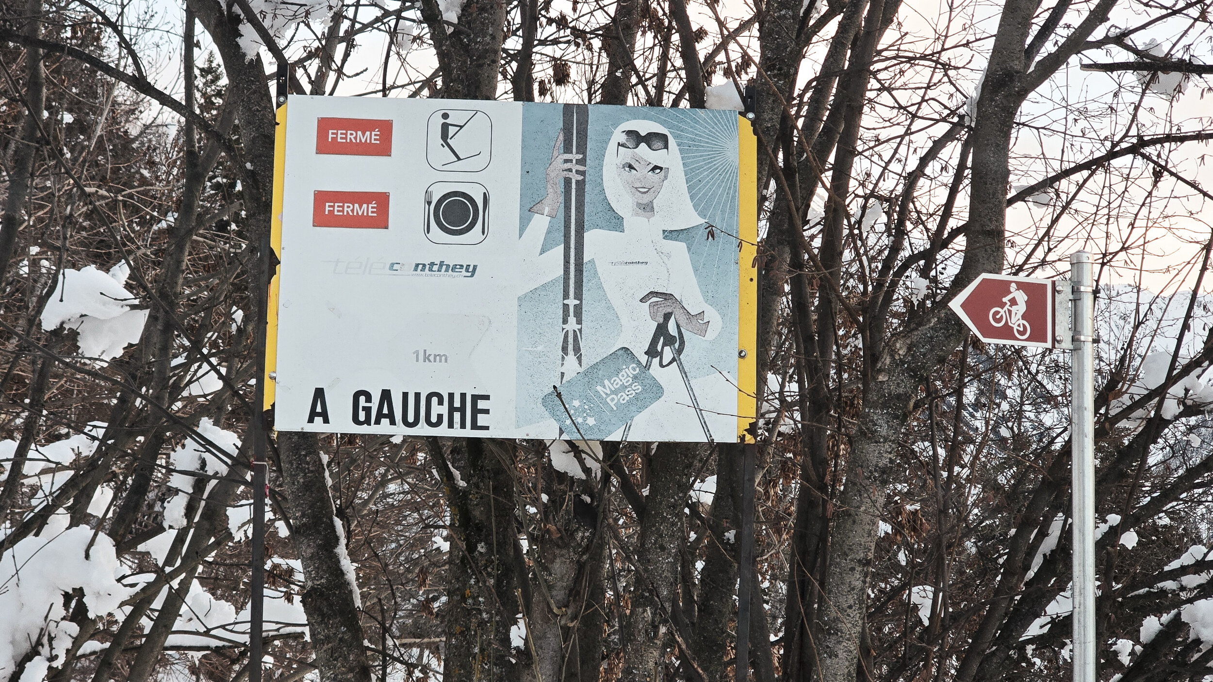 Eine kurzfristige Mitteilung auf Instagram von MagicPass kündigte an, dass der Lift am letzten Novemberwochenende laufen würde. Auf der offiziellen Website stand jedoch weiterhin "Fermé – manque de neige" und auch telefonisch war niemand erreichbar. Also bleibt nur der Versuch, am frühen Samstagmorgen aufzubrechen, in der stillen Hoffnung, dass der einzige Hinweis stimmt. Nach der Autobahnausfahrt führt die Strecke durch den Ort und dann über eine immer schmaler werdende Strasse den Hang hinauf. Auf halbem Weg steht eine Übersichtstafel vom Skilift und der Buvette, und selbst kurz vor neun Uhr morgens waren beide Anzeigen noch auf "Fermé" gestellt. Spätestens hier wird klar, dass man auf auswärtige Gäste nicht angewiesen ist. Hier kommen wohl wirklich nur die Einheimischen, die über Mundpropaganda vom Betrieb erfahren.