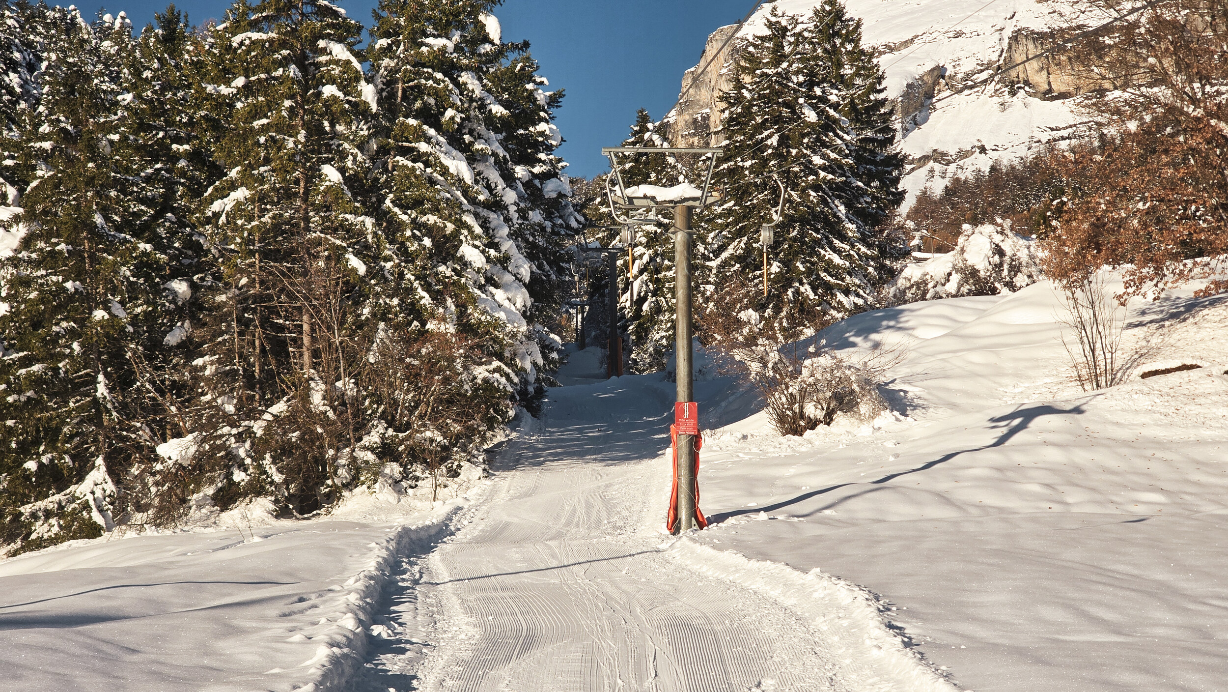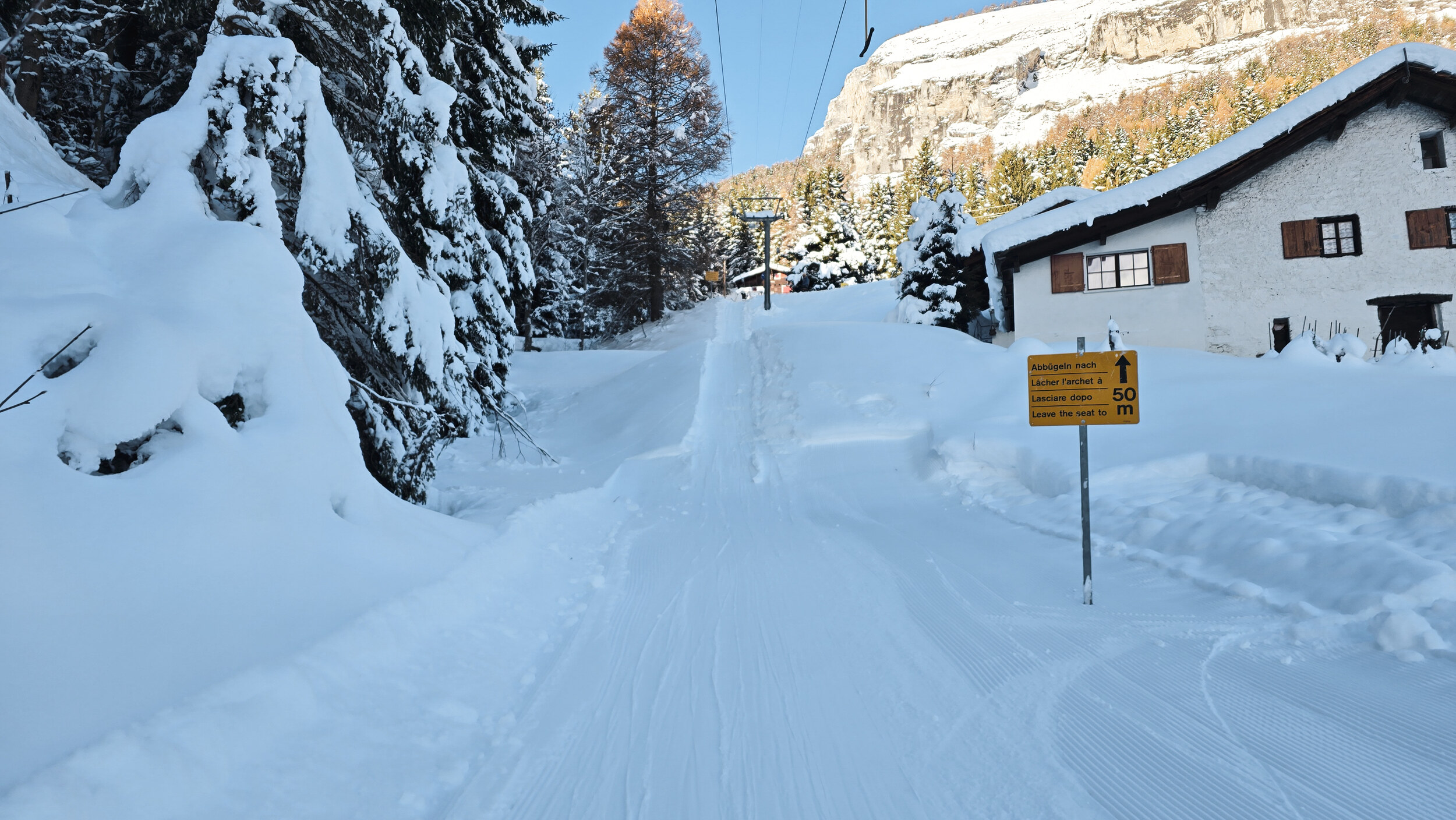 Oben angekommen erwartet einen dann doch eine präparierte Abfahrt und ein betriebsbereiter Skilift, der kurze Zeit später seine Runden dreht. Der Lift wurde 1971 von Städeli erstellt und erschliesst eine einzige Piste – unten etwas steiler, oben flacher, eingebettet zwischen Wald und verstreuten Häusern. Das eigentliche Problem, weshalb diese Anlage so selten läuft, scheint weniger der Lift selbst zu sein, sondern vielmehr die kupierte, schneehungrige Piste auf dem Südhang in eher tiefer Lage. Die Präparierung gewinnt zwar keinen Preis, aber die verspielte, kurvenreiche Strecke hat ihren ganz eigenen Charme. Die Abfahrt schlängelt sich malerisch durchs Gelände, verzweigt sich kurz und führt danach wieder zusammen. Und auch wenn hier alles recht unspektakulär wirkt, der ganze Hang hat Charakter und genau das zählt an einem Ort wie diesem.